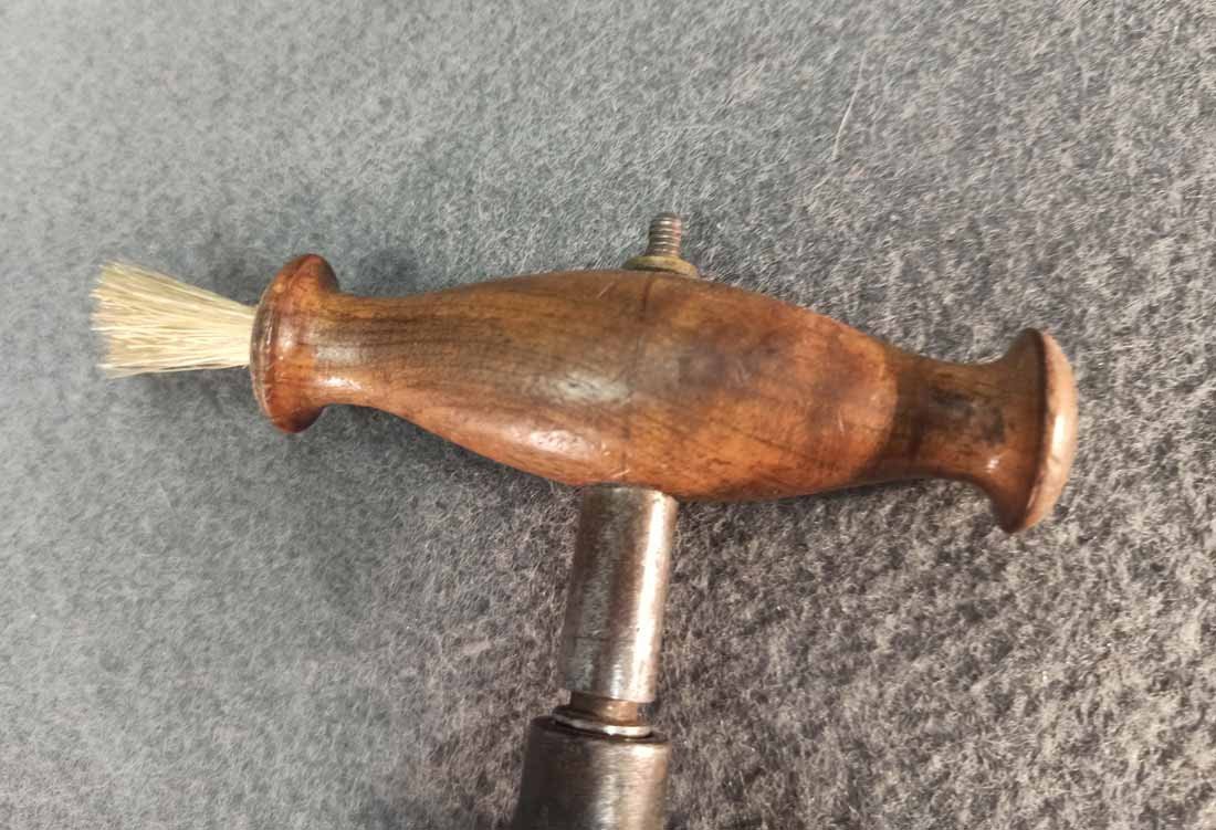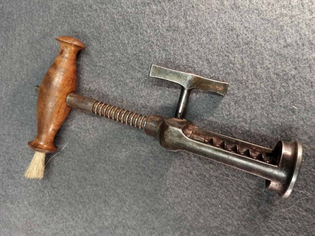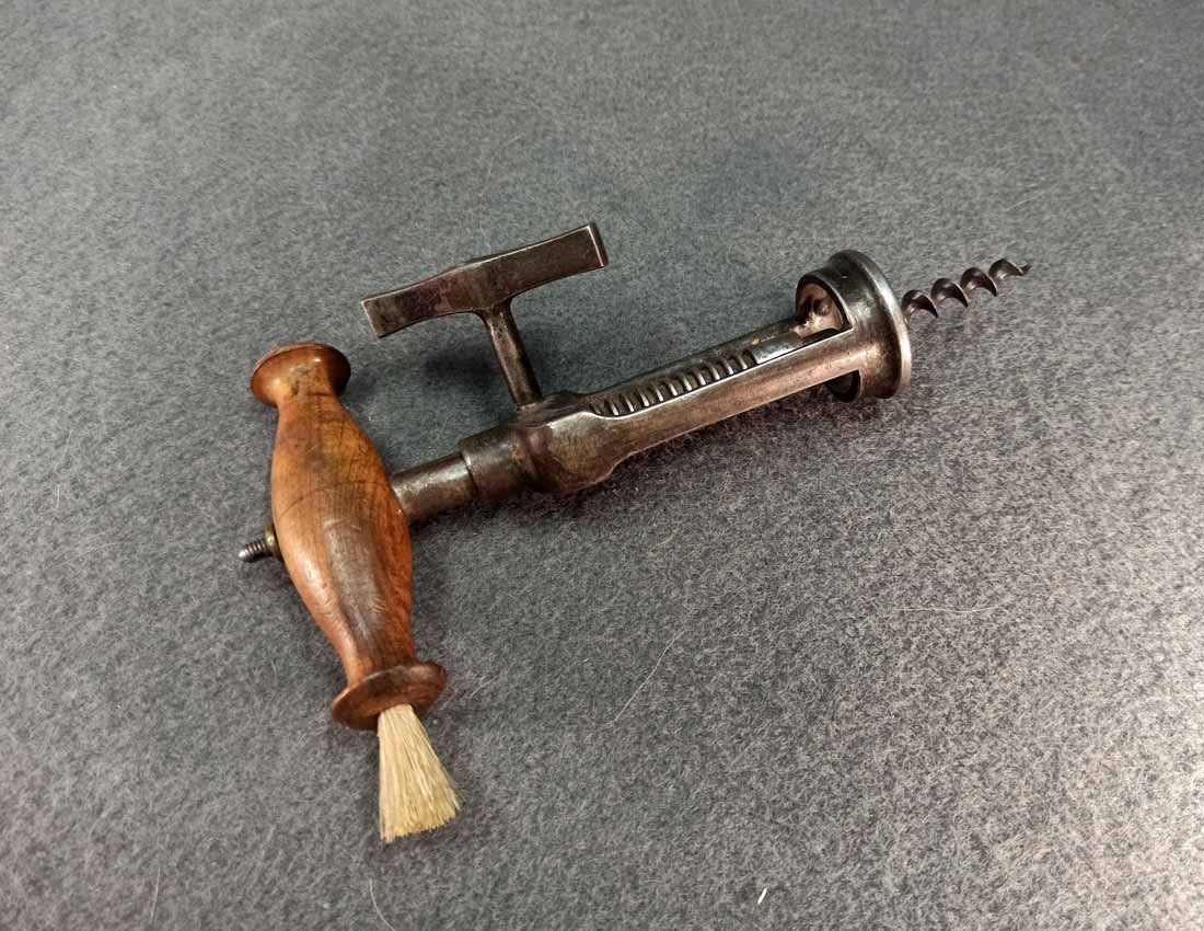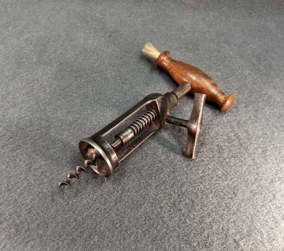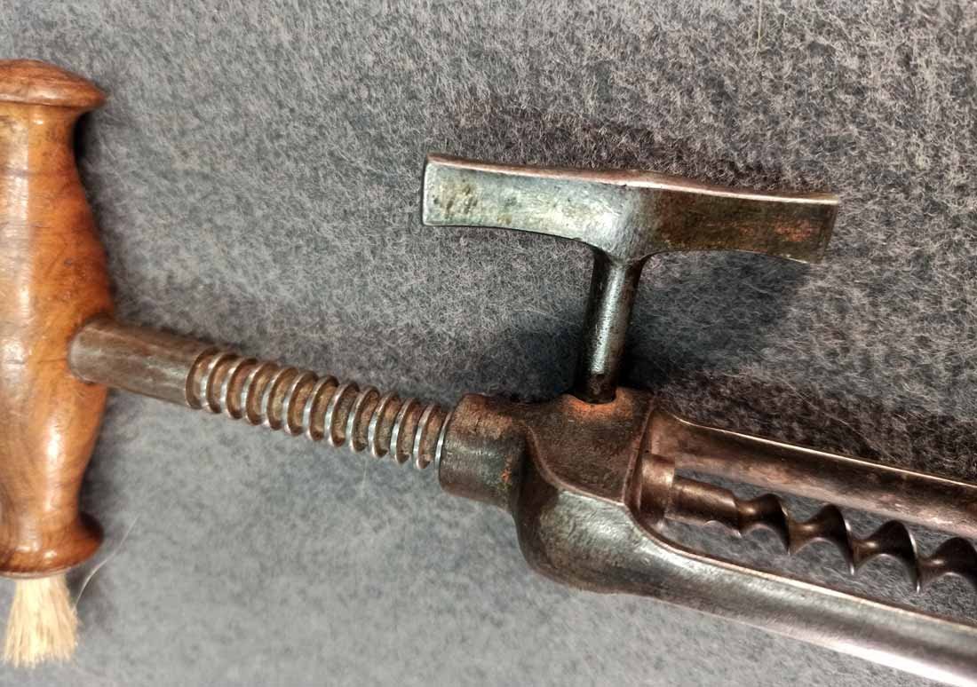 Korkenzieher um 1900, Weinflachen-Öffner. Schmiedeeisen mit Mechanik und Holzgriff. Mechanik mit Zahnrad und Zahnstange. Am Holzgriff Staubpnsel. L. ges. ca 20 cm