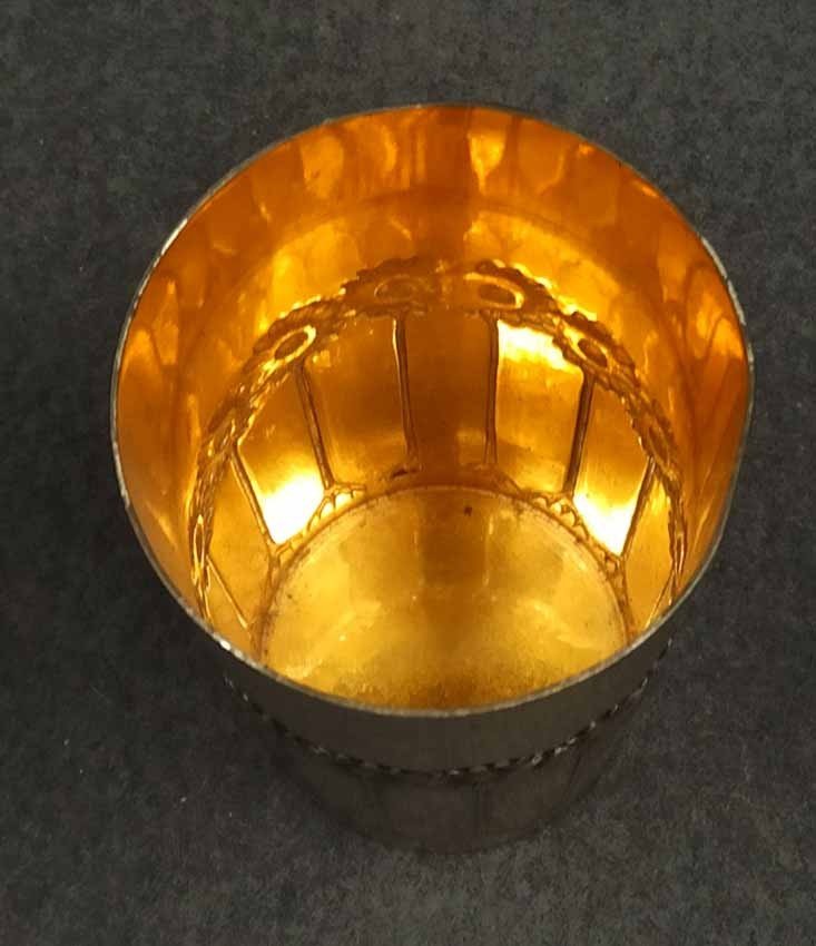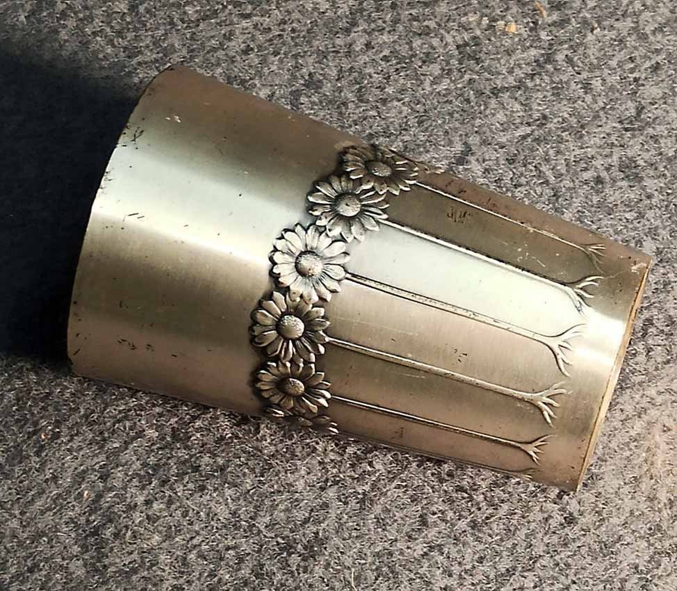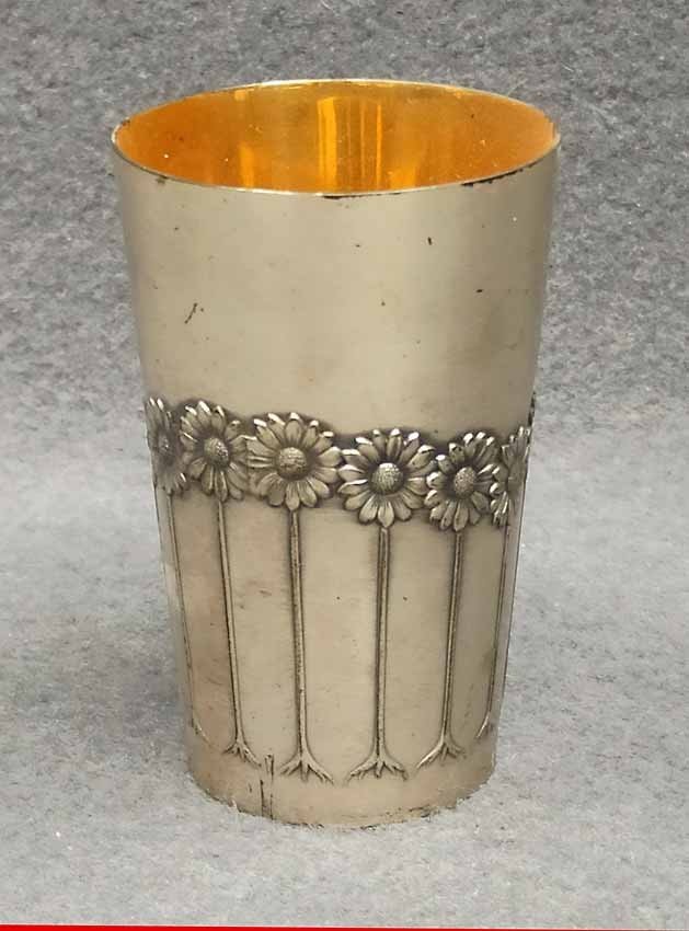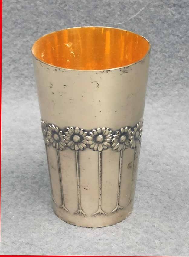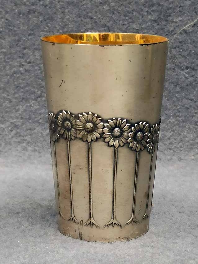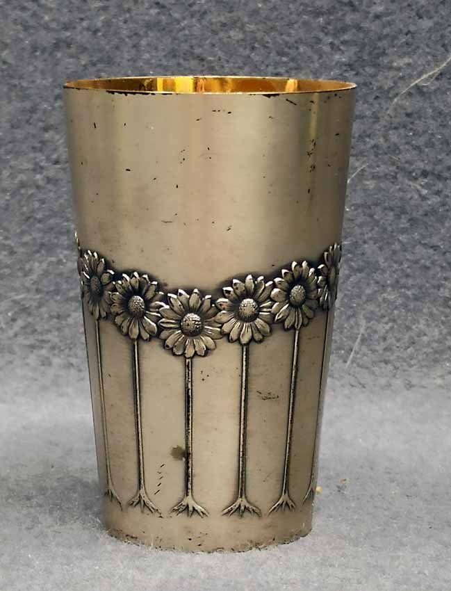 Becher, WMF, Jugendstil mit stilisiertem Blumendekor (Sonnenblume, Margerite?). Innen vergoldet. Entwurf ??. H. 9 cm, D.oben 6 cm. Straußenmarke von WMF und versch. Beizeichen.