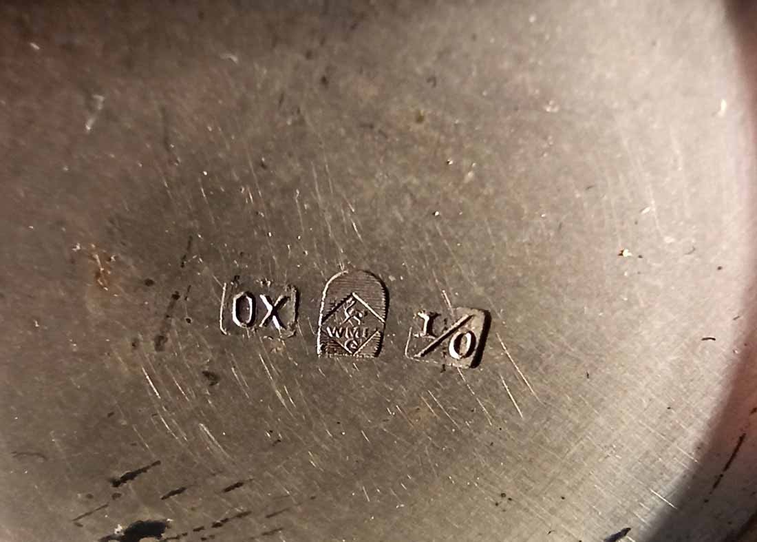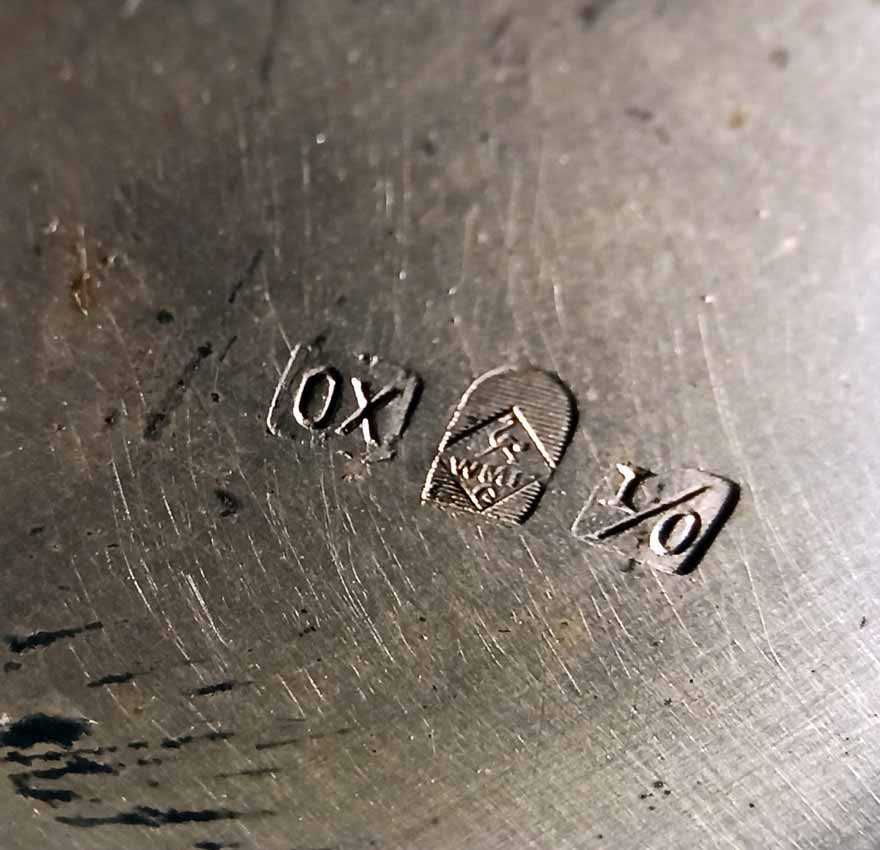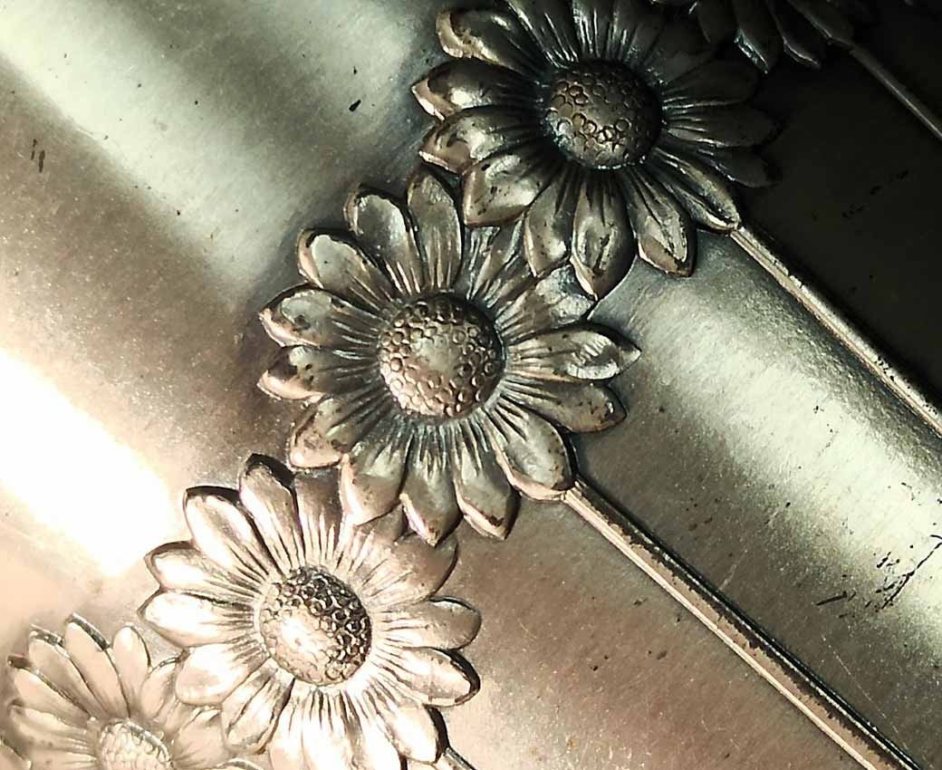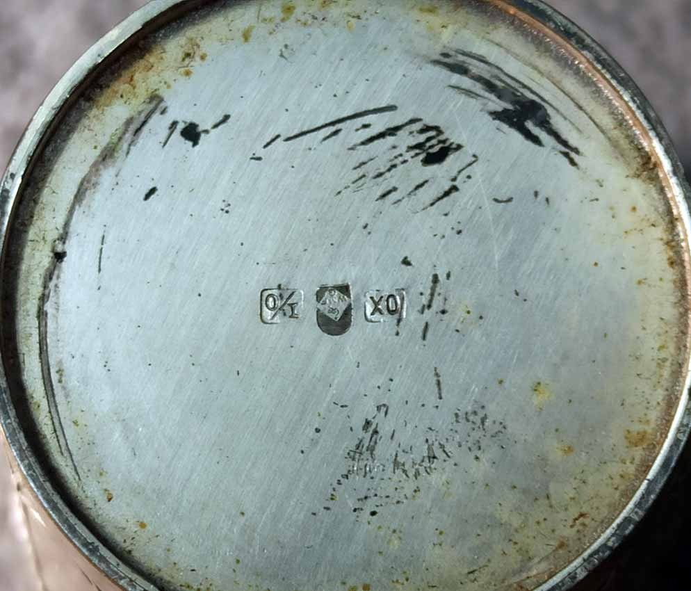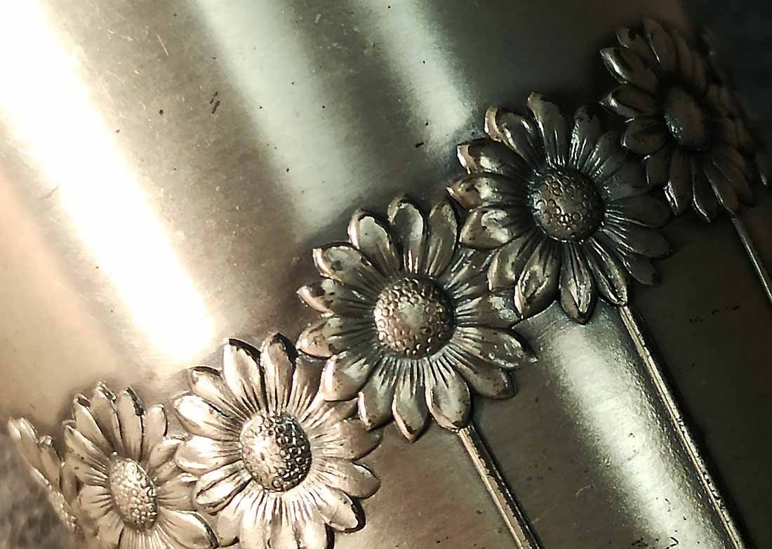 Becher, WMF, Jugendstil mit stilisiertem Blumendekor (Sonnenblume, Margerite?). Innen vergoldet. Entwurf ??. H. 9 cm, D.oben 6 cm. Straußenmarke von WMF und versch. Beizeichen.