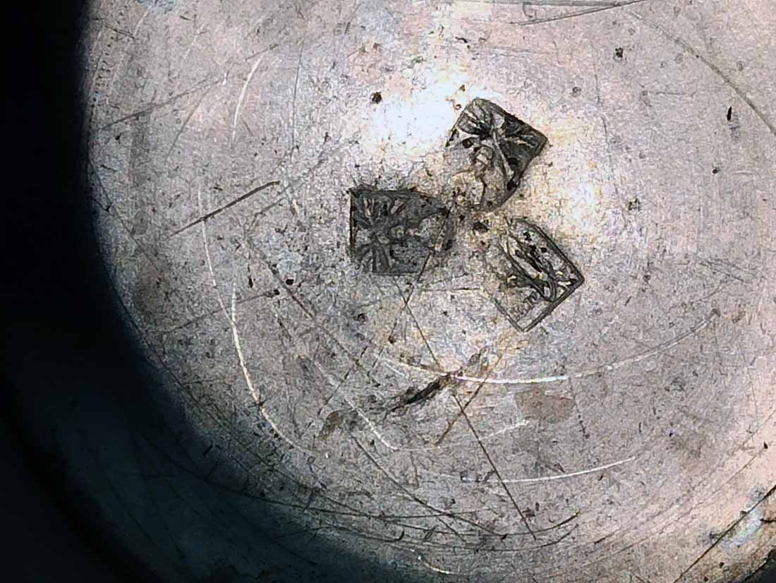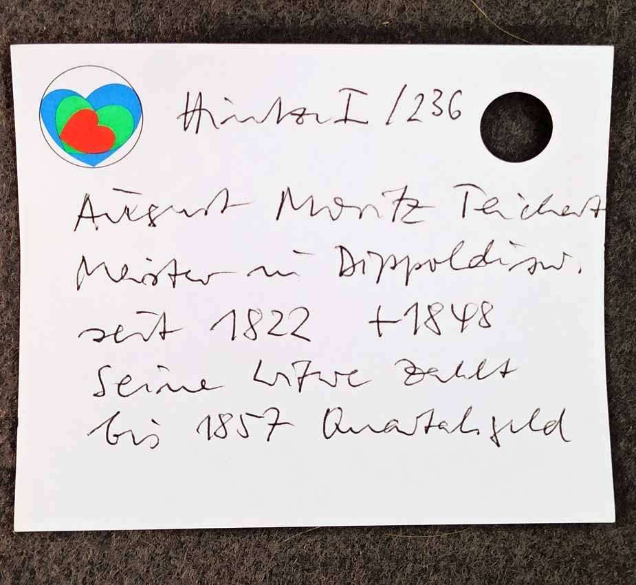 Zinkanne dat. 1866, Herstellung verm. früher. Fontseitig Monogr.: " C.F.V." und "1866" . Innen am Boden 3 Zinnstempel. H. 20 cm. Beiligende Sammlernotiz: "Hintze I/236. August Moritz Teichert. Meister in Dippoldiswalde seit 1822 +1848. Seine Witwe zahlte bis 1857 Quartalsgeld" . Die Angaben stimmen nicht mit der Datierung überein. Dies Dilemma aufzulösen sei meiner werten Kundschaft überlassen.