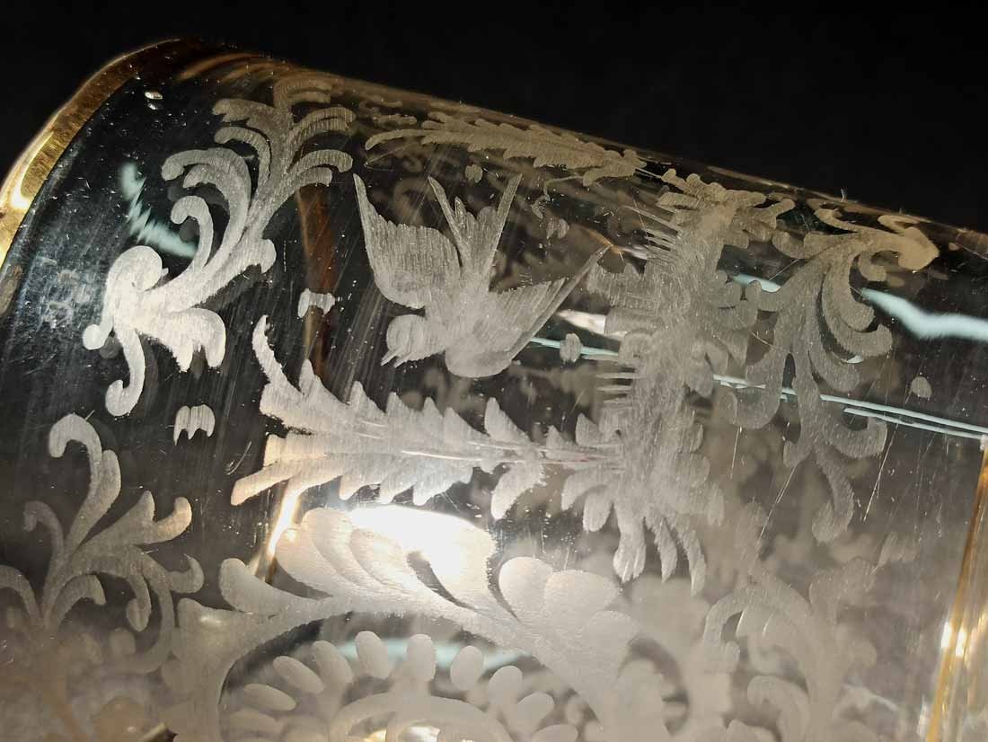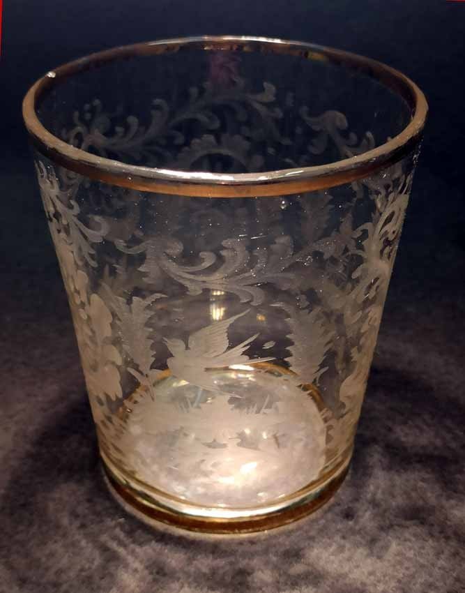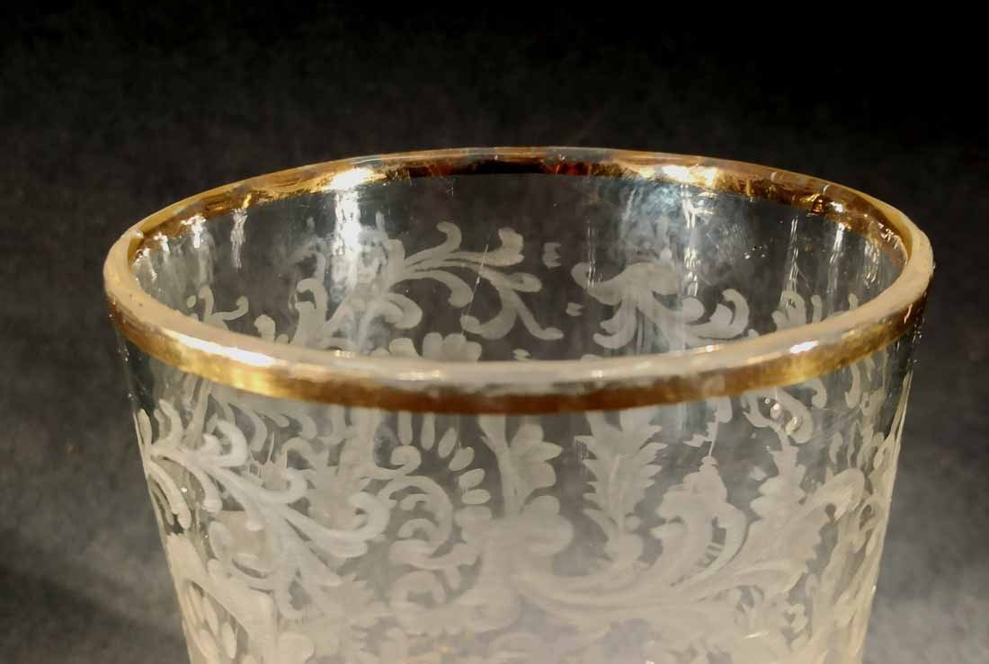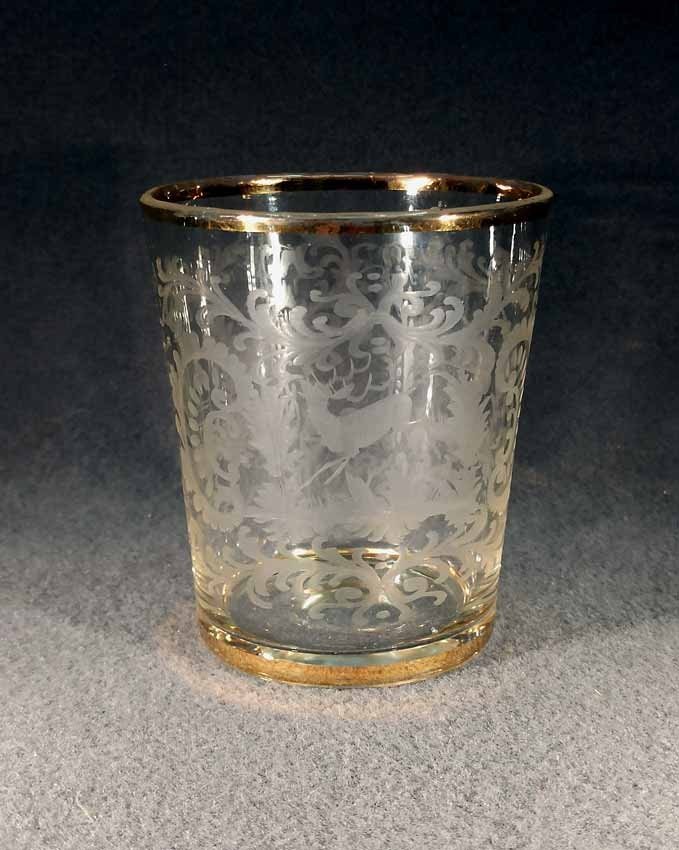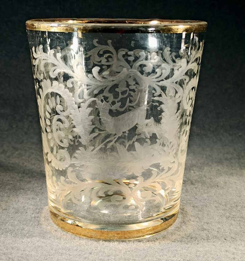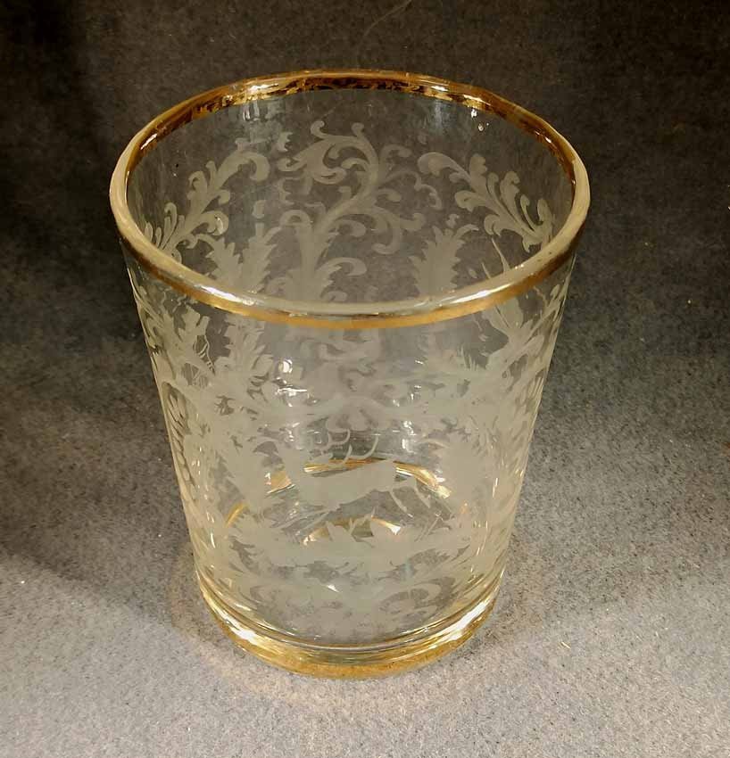 Barock Glasbecher 18.Jh. Schliffdekor: Hirsch, Vogel und Turm zwischen Ranken- und Rocaillemotiven. Rand und Fuß vergoldet, teilw. berieben. Abrissglas, Boden mit ausgekugeltem Abriss. 12 cm, D. 10,5 cm. Zustand ohne Beschädigung, partiell Goldabrieb.
