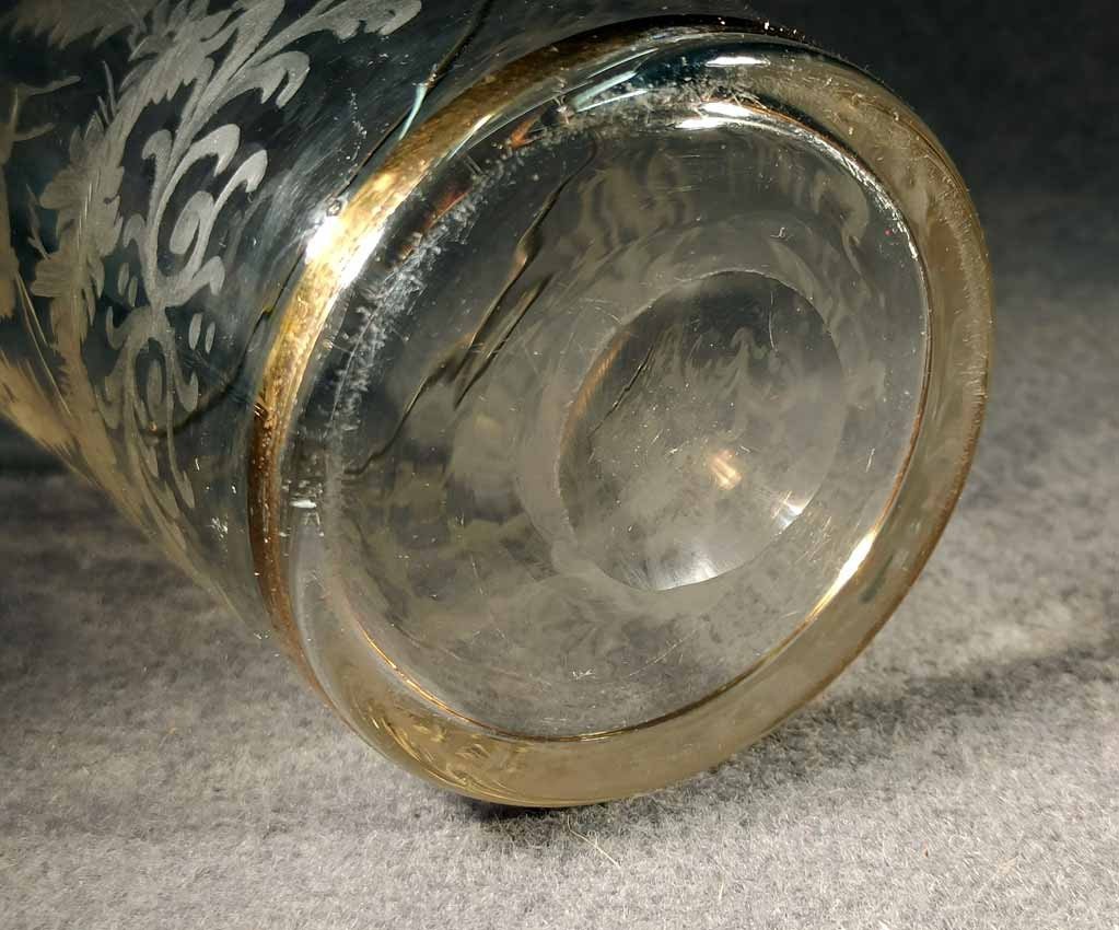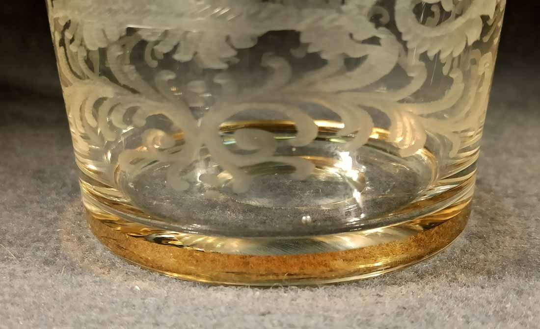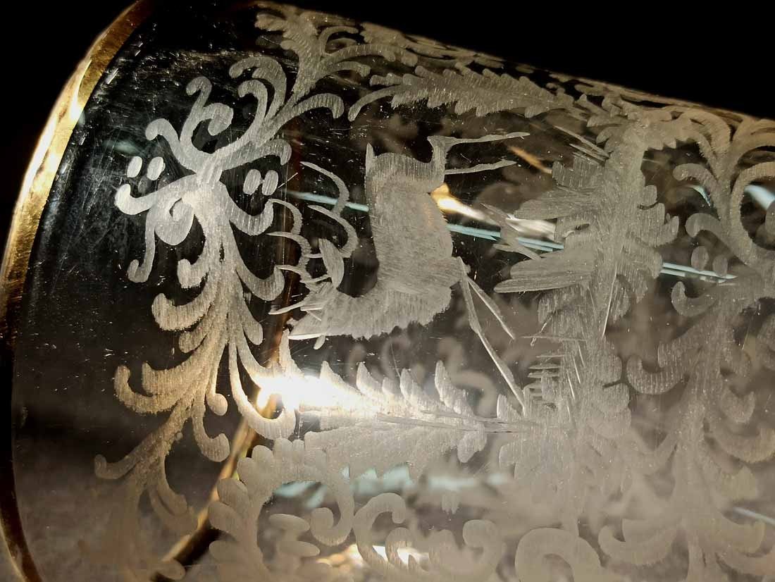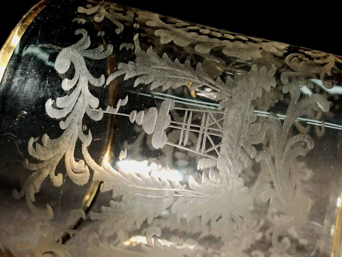 Barock Glasbecher 18.Jh. Schliffdekor: Hirsch, Vogel und Turm zwischen Ranken- und Rocaillemotiven. Rand und Fuß vergoldet, teilw. berieben. Abrissglas, Boden mit ausgekugeltem Abriss. 12 cm, D. 10,5 cm. Zustand ohne Beschädigung, partiell Goldabrieb.
