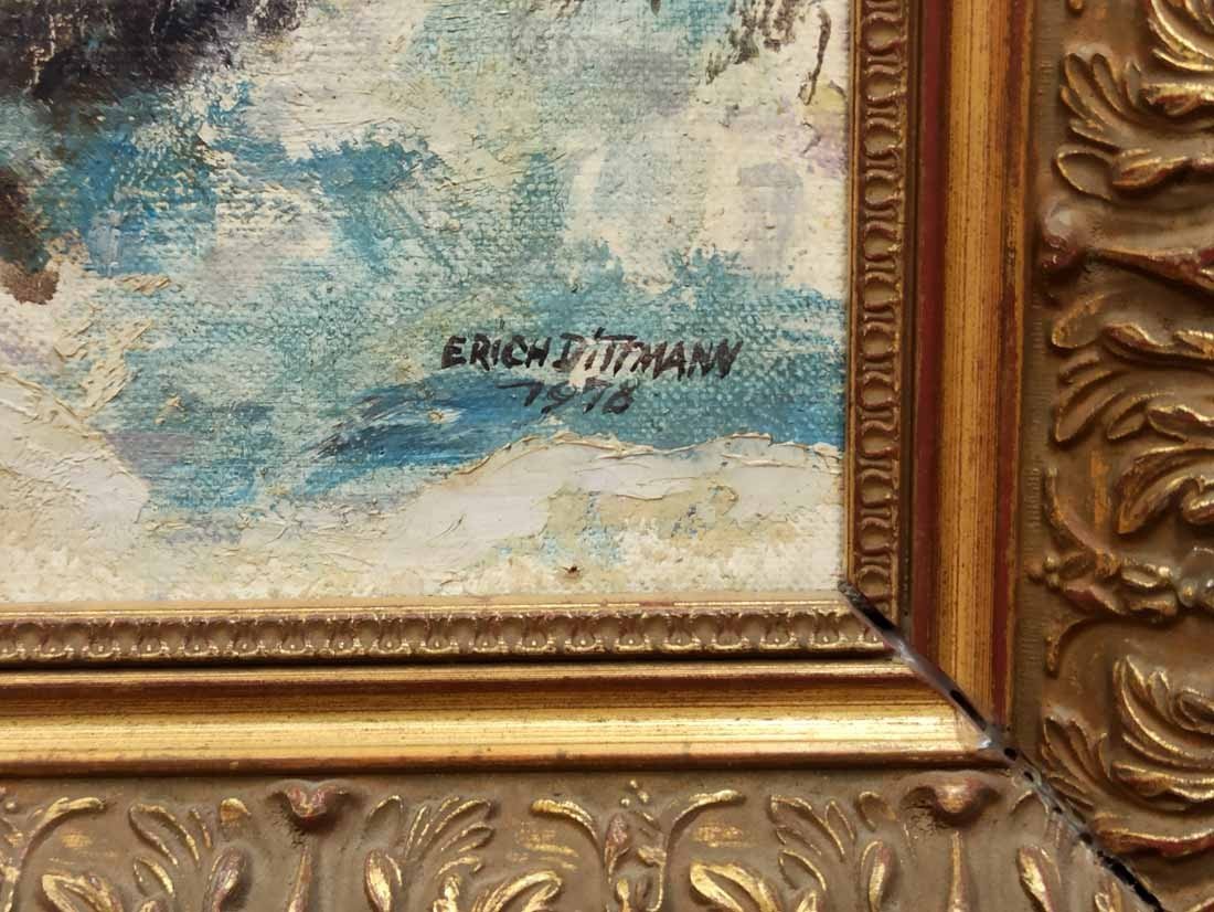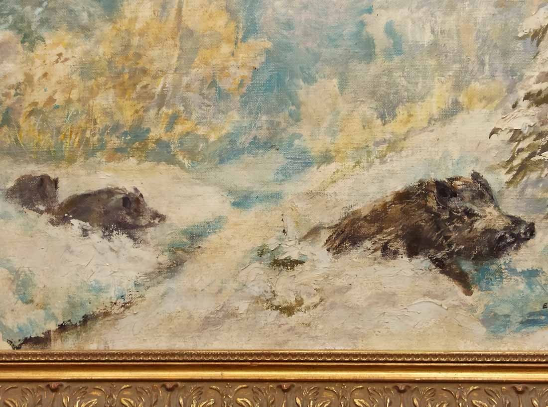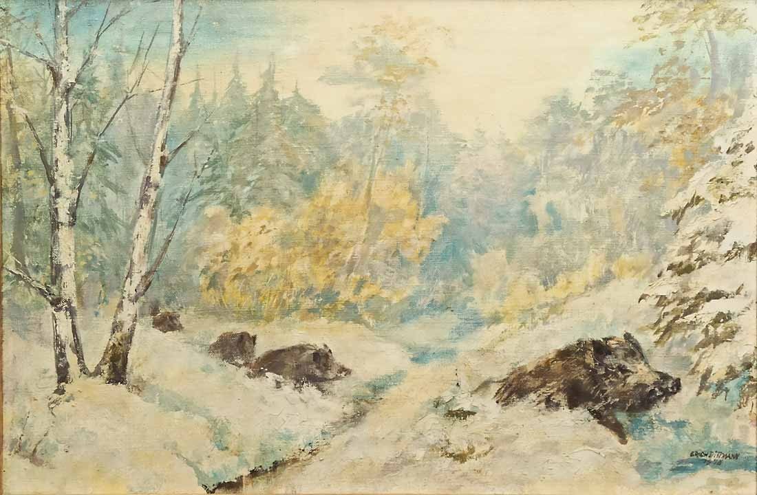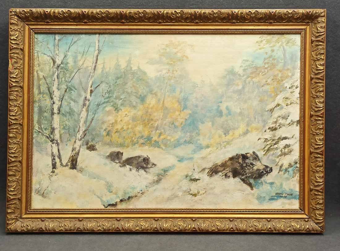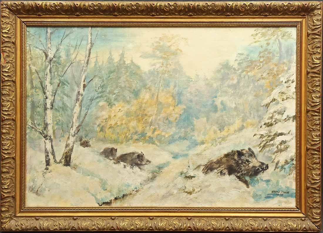 Erich Dittmann, Winterbild mit Wildschweinen. B. 59/68 cm, H. 39/48 cm. Re.u. sign.: Erich Dittmann und dat.: 1978.