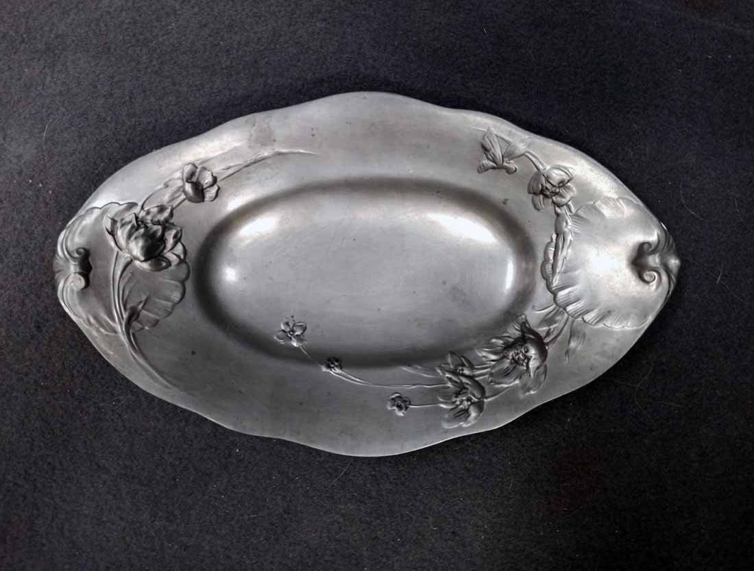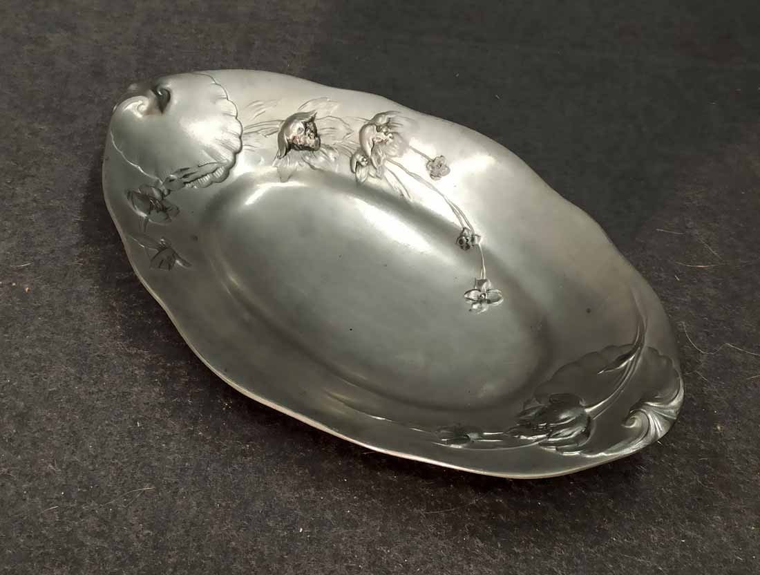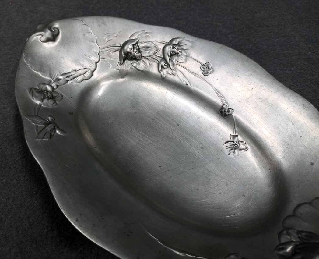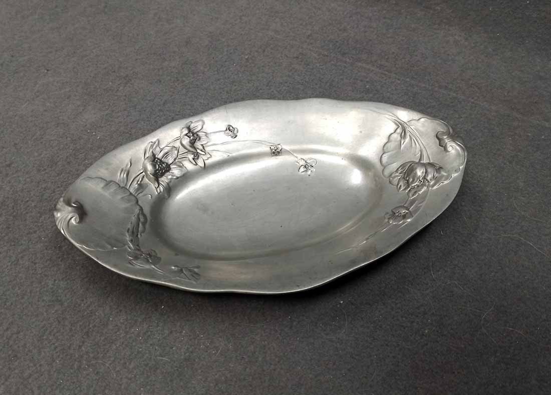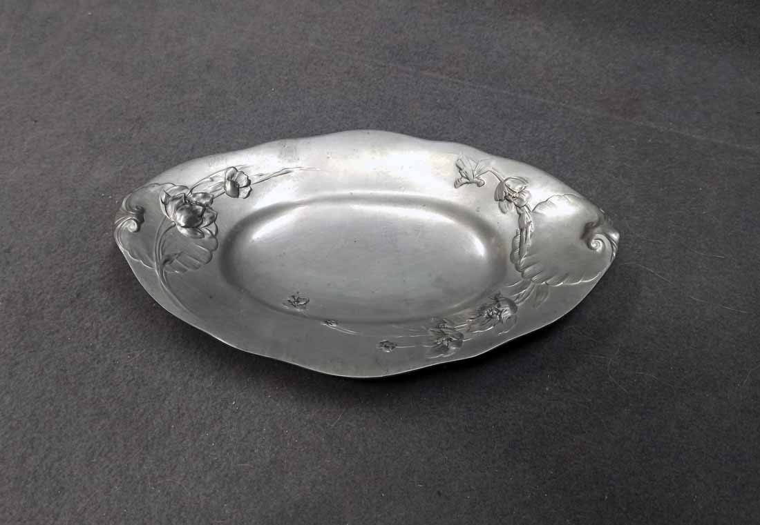 Jugendstil Schale, Kayserzinn, Entw. Hugo Leven um 1896. Ovale Schale mit zeittyp. Floral- und Muschelrelief. L. 26,5 cm, B. 16 cm, H. 4,5 cm. Am boden ovale Kayserzinn Marke und Mod.Nr.: 4112. Sehr guter Zustand.
