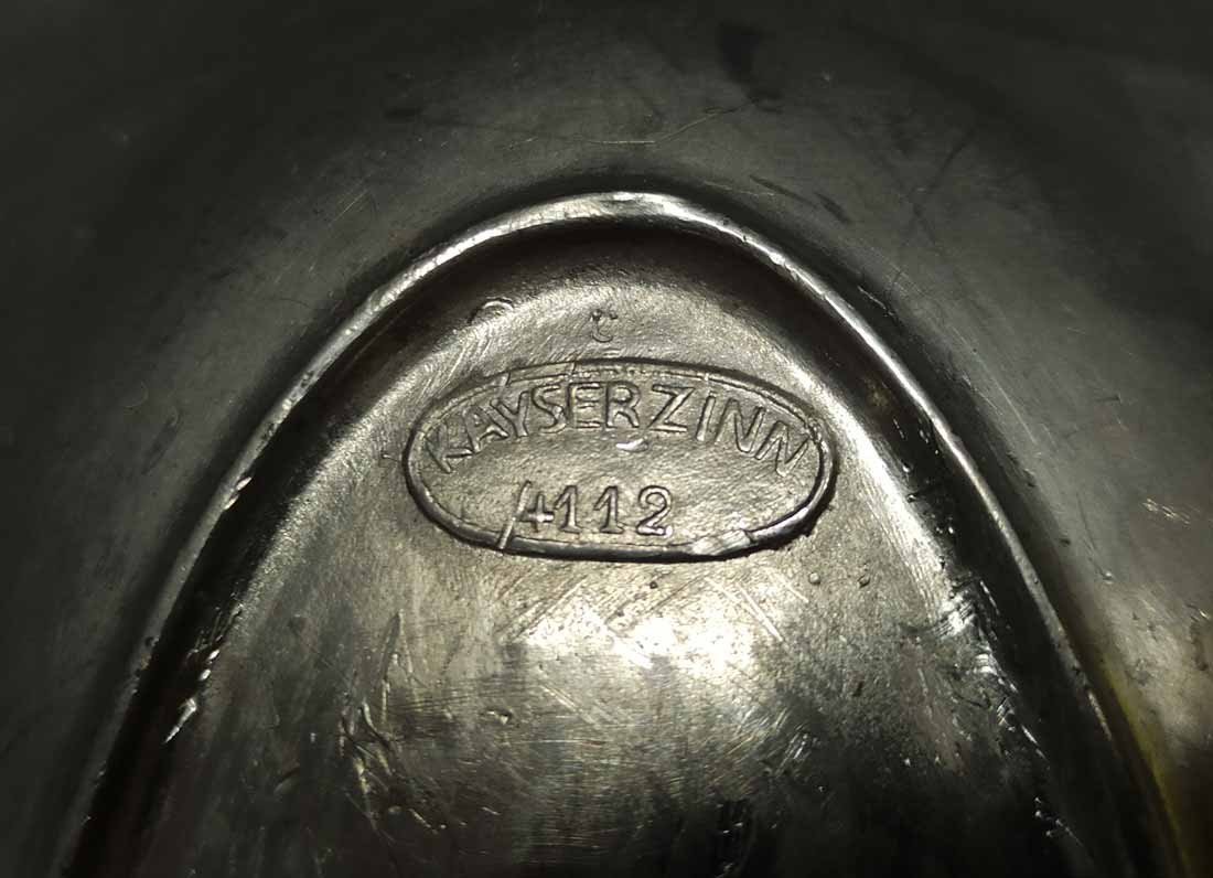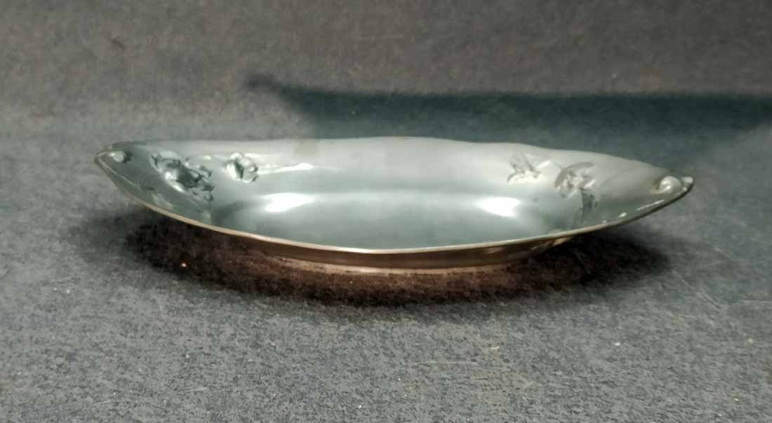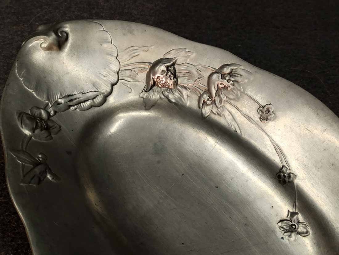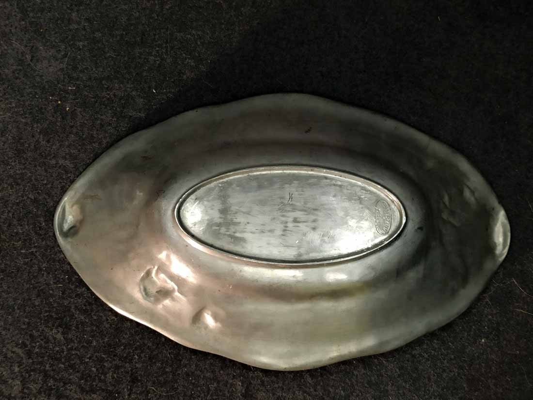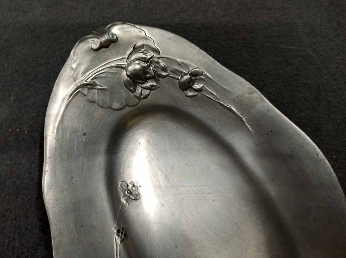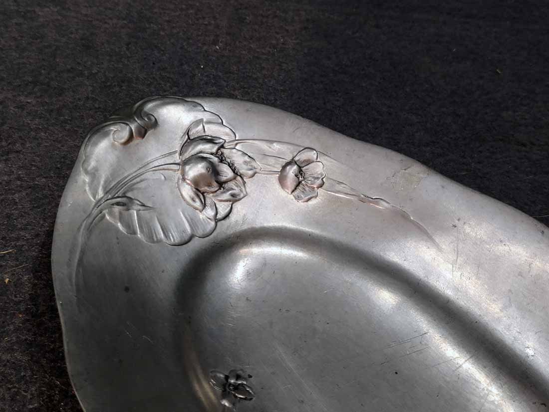 Jugendstil Schale, Kayserzinn, Entw. Hugo Leven um 1896. Ovale Schale mit zeittyp. Floral- und Muschelrelief. L. 26,5 cm, B. 16 cm, H. 4,5 cm. Am boden ovale Kayserzinn Marke und Mod.Nr.: 4112. Sehr guter Zustand.