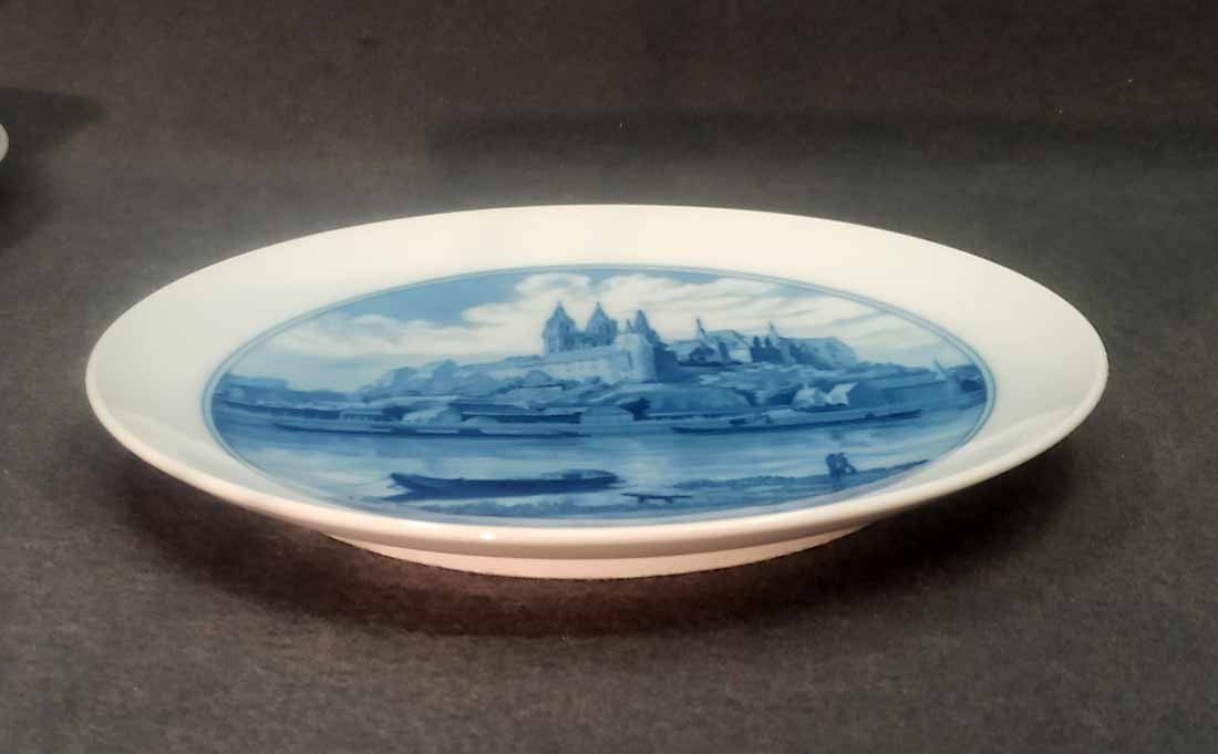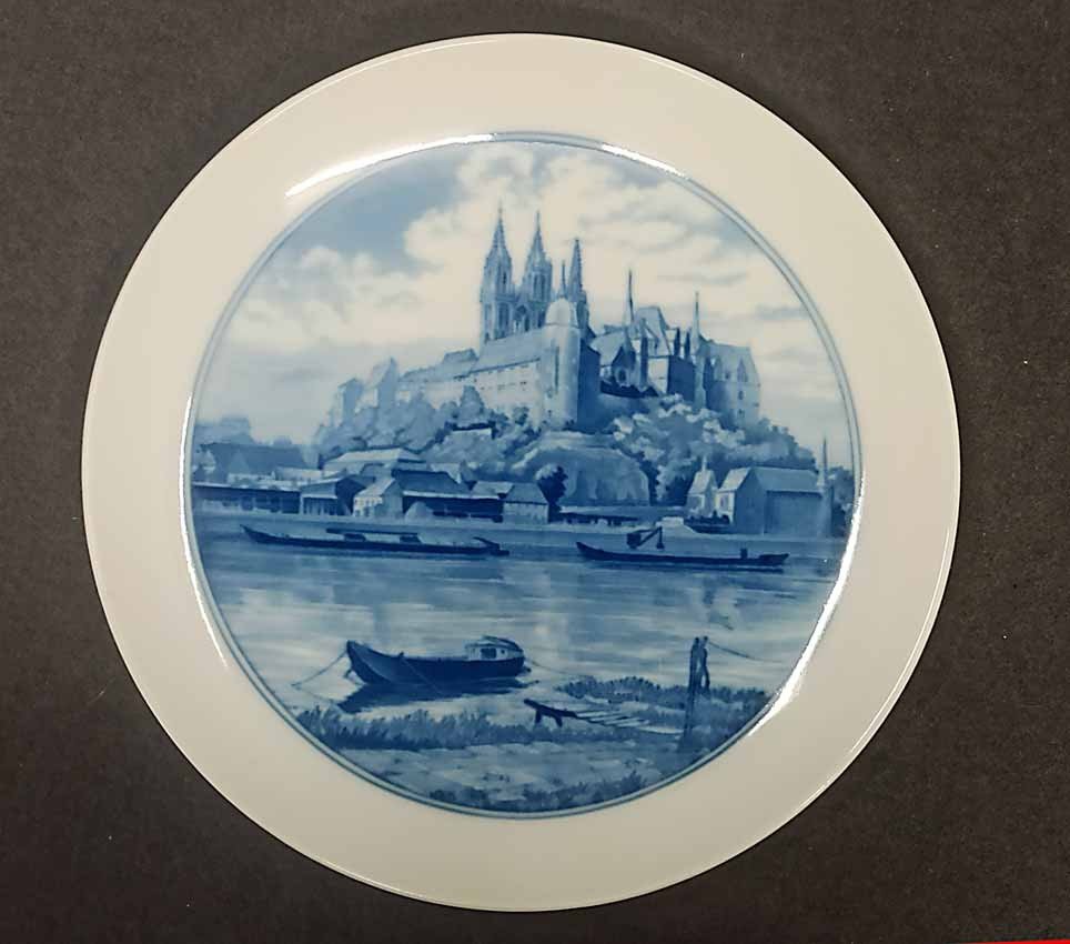 Meissen, Wandteller mit Ansicht von Meissen "Albrechtsburg über die Elbe". D. 25,5 cm. Sehr guter Zustand. Schwertermarke, 2x gestrichen. Rs. Wandaufhängung.