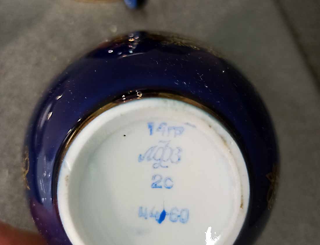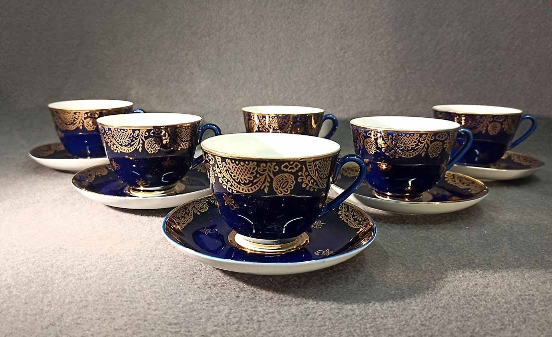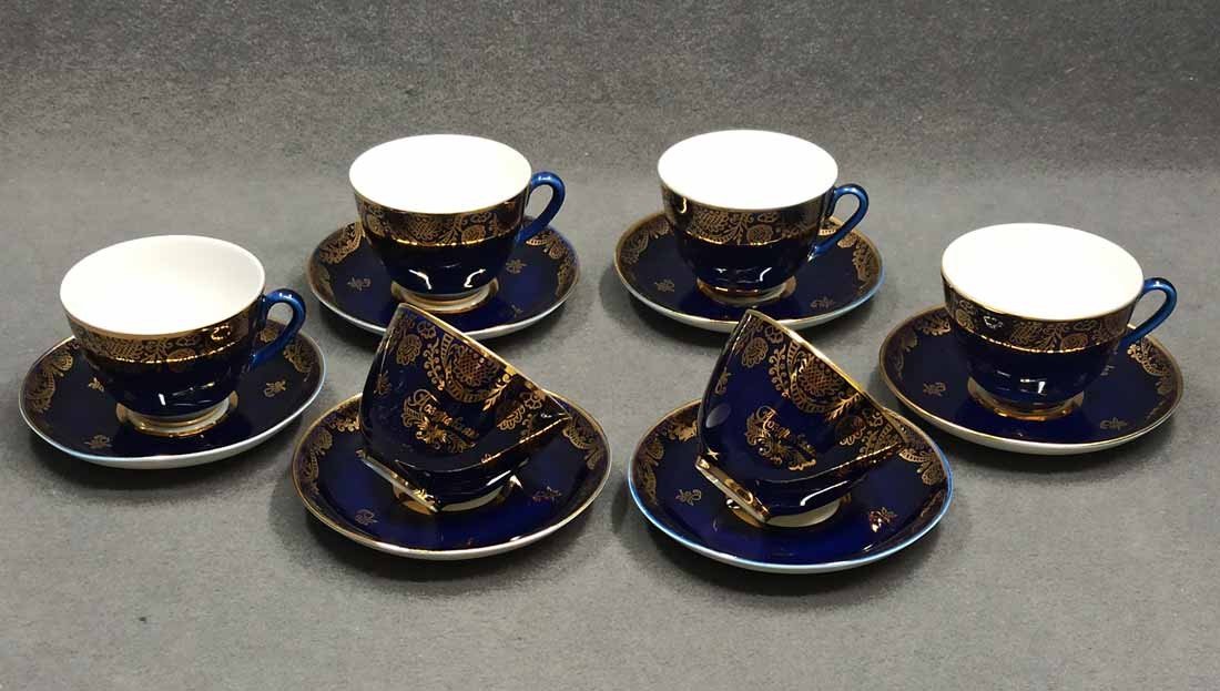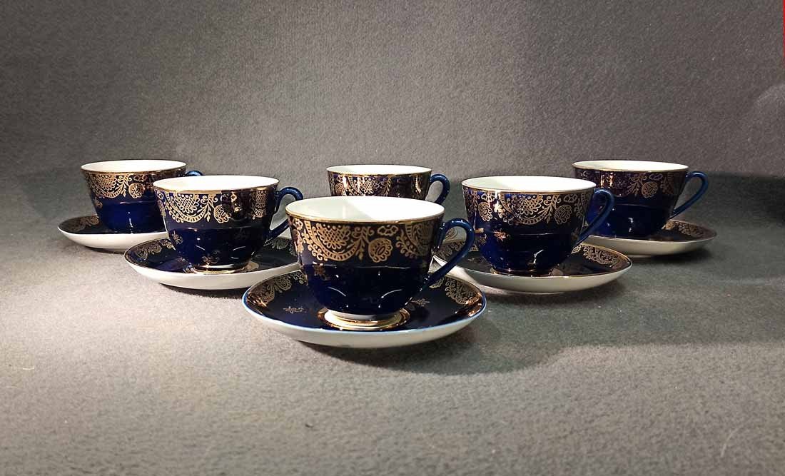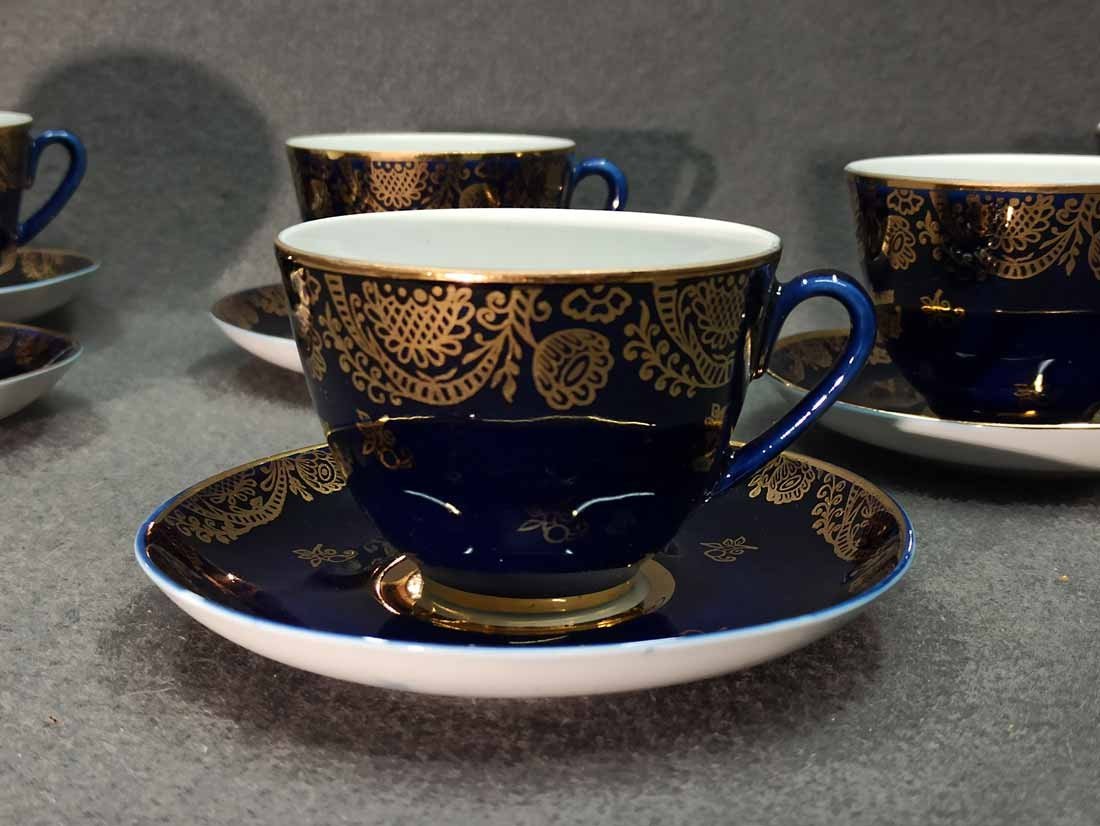 5x Tassen Lomonosov; Поздравляю - Glückwunsch Goldschrift auf Kobaltblau und Goldverziert. Lomonosov St. Petersburg. Sehr guter Zustand ohne Beschädigungen. Tassen H. 7 cm, D. 9 cm, Untertassen D. 14 cm. Bodenmarke von Lomonosov und Beizeichen. Auch einzeln abzugeben. Je 20,- Euro. Dz. noch 4 mal verfügbar.