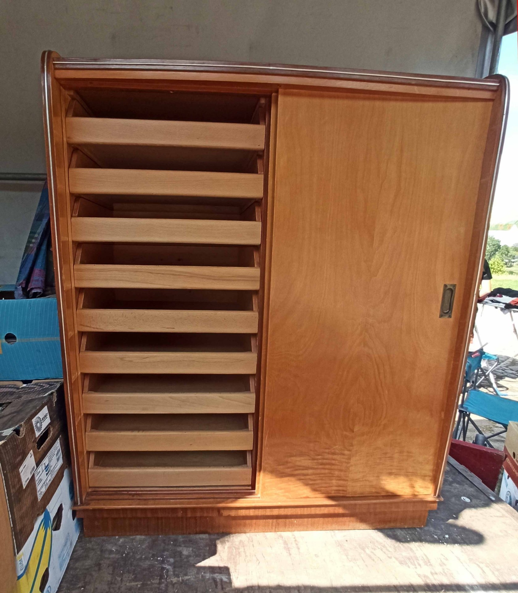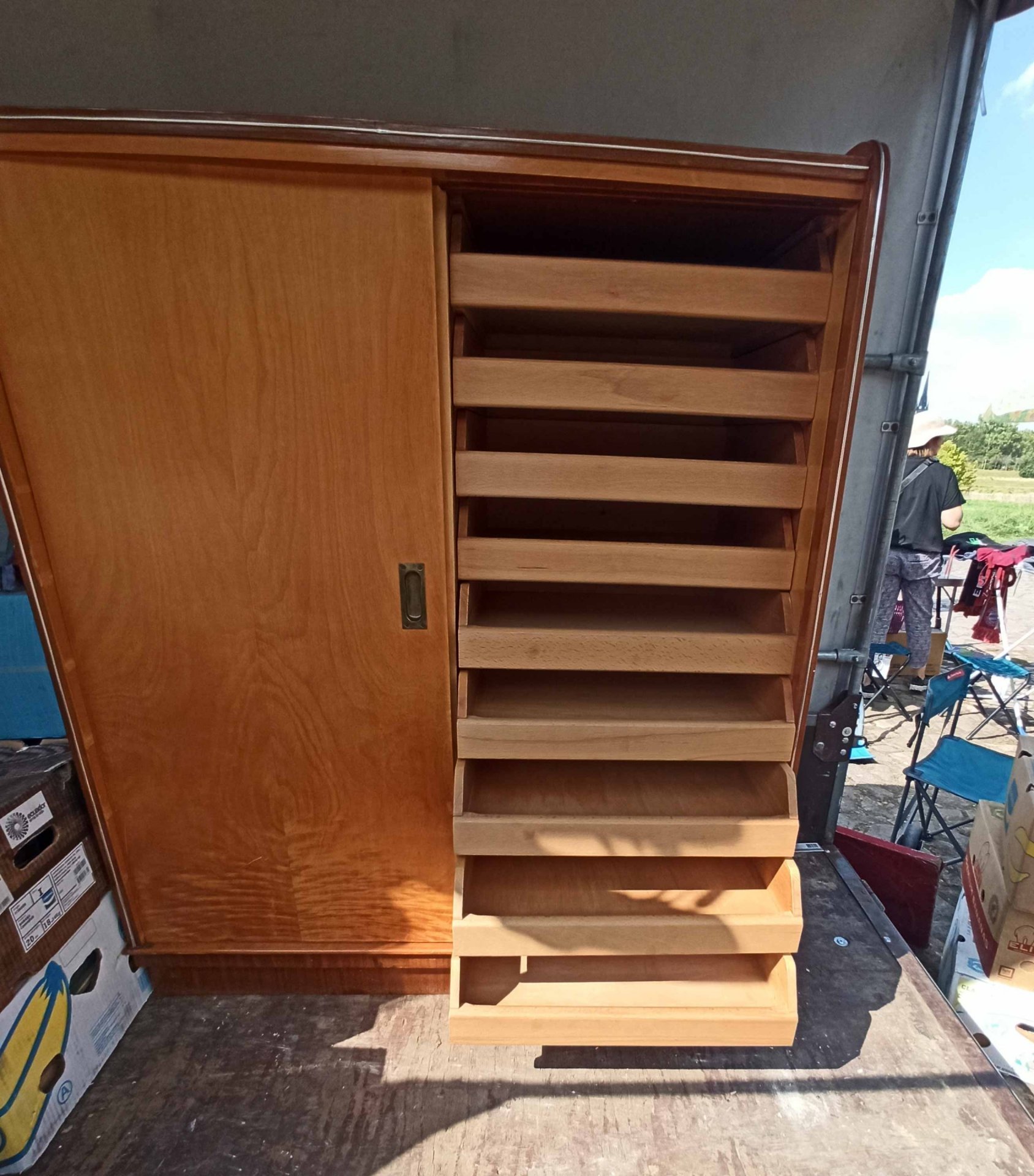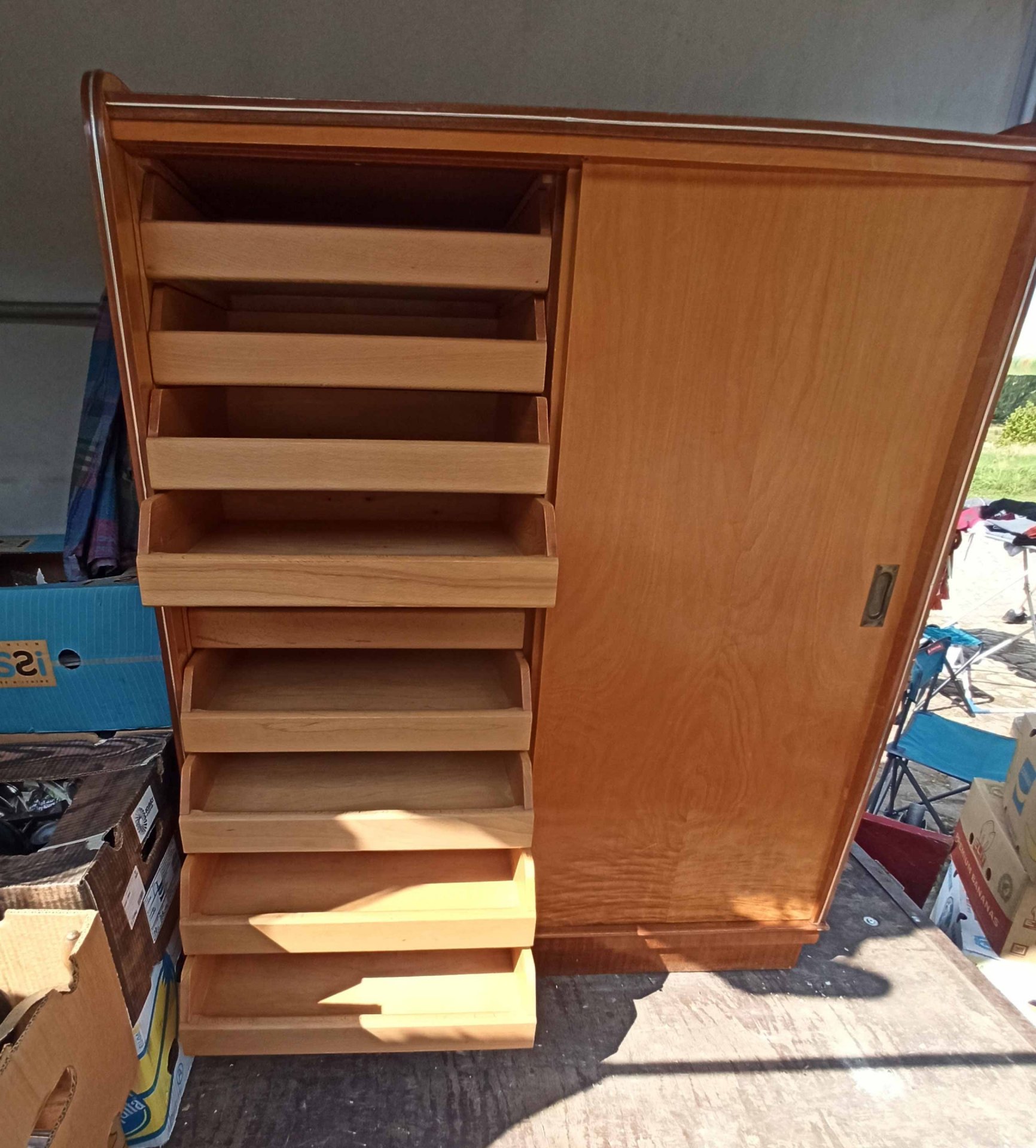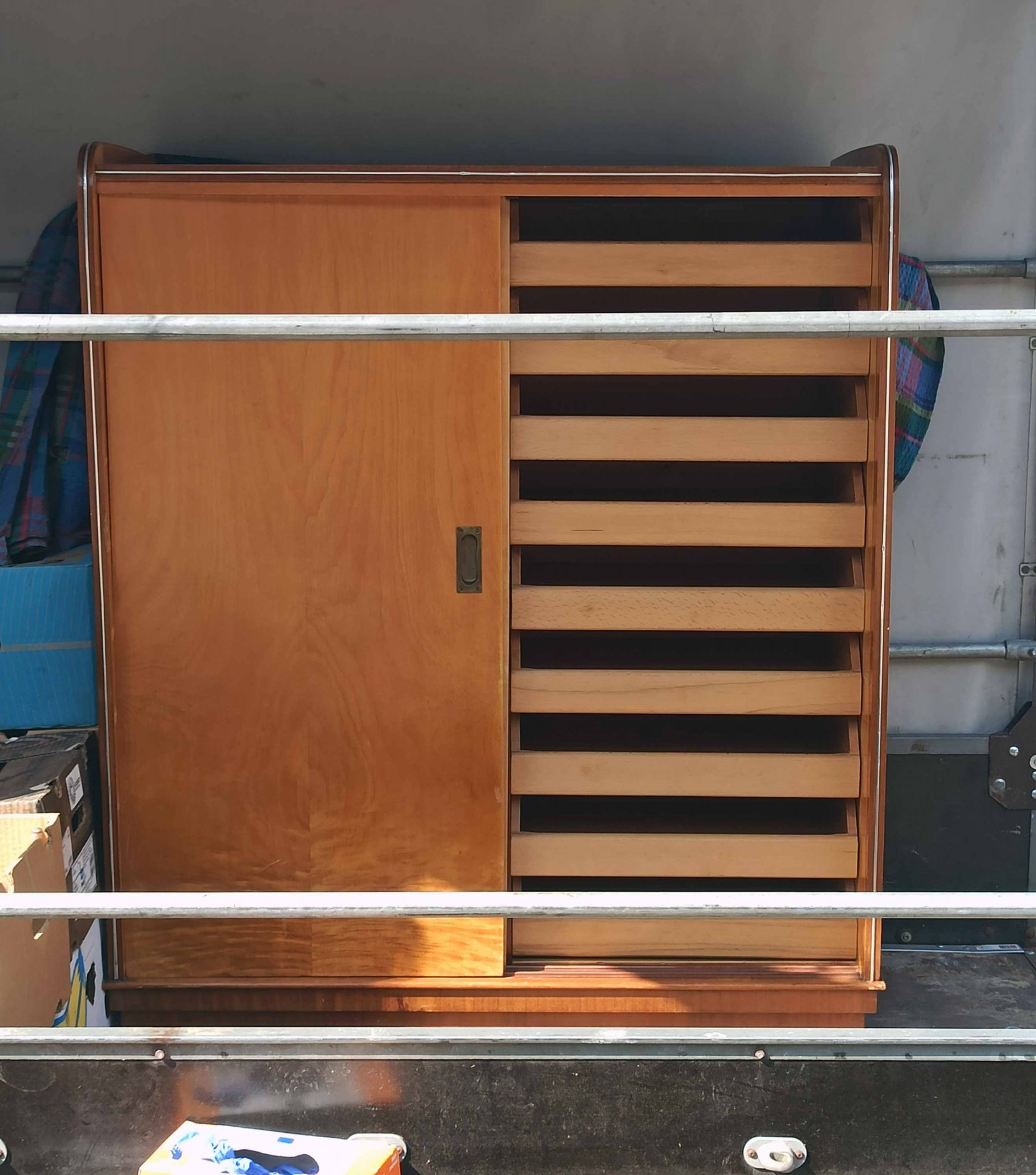 Interessanter, seltener Schrank mit 18 Schubladen hinter zwei Schiebetüren aus den 60er Jahren. Als Schrank für Kleidung aber auch für Grafiken o.ä. geeignet. Sehr selten und praktisch. Interessantes Design. Guter Zustand mit geringen Gebrauchsspuren und nur kleineren Mängeln. H. 131 cm, B. 110 cm T. 53 cm. Schubkästen B.47/50 cm T. 41 cm.