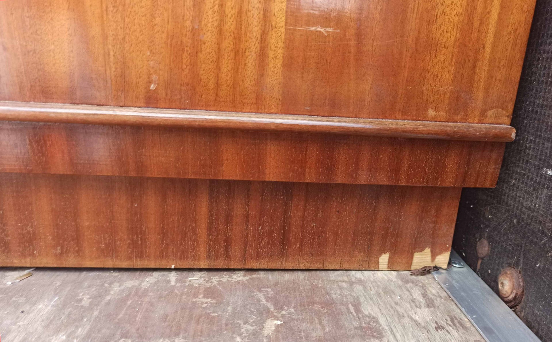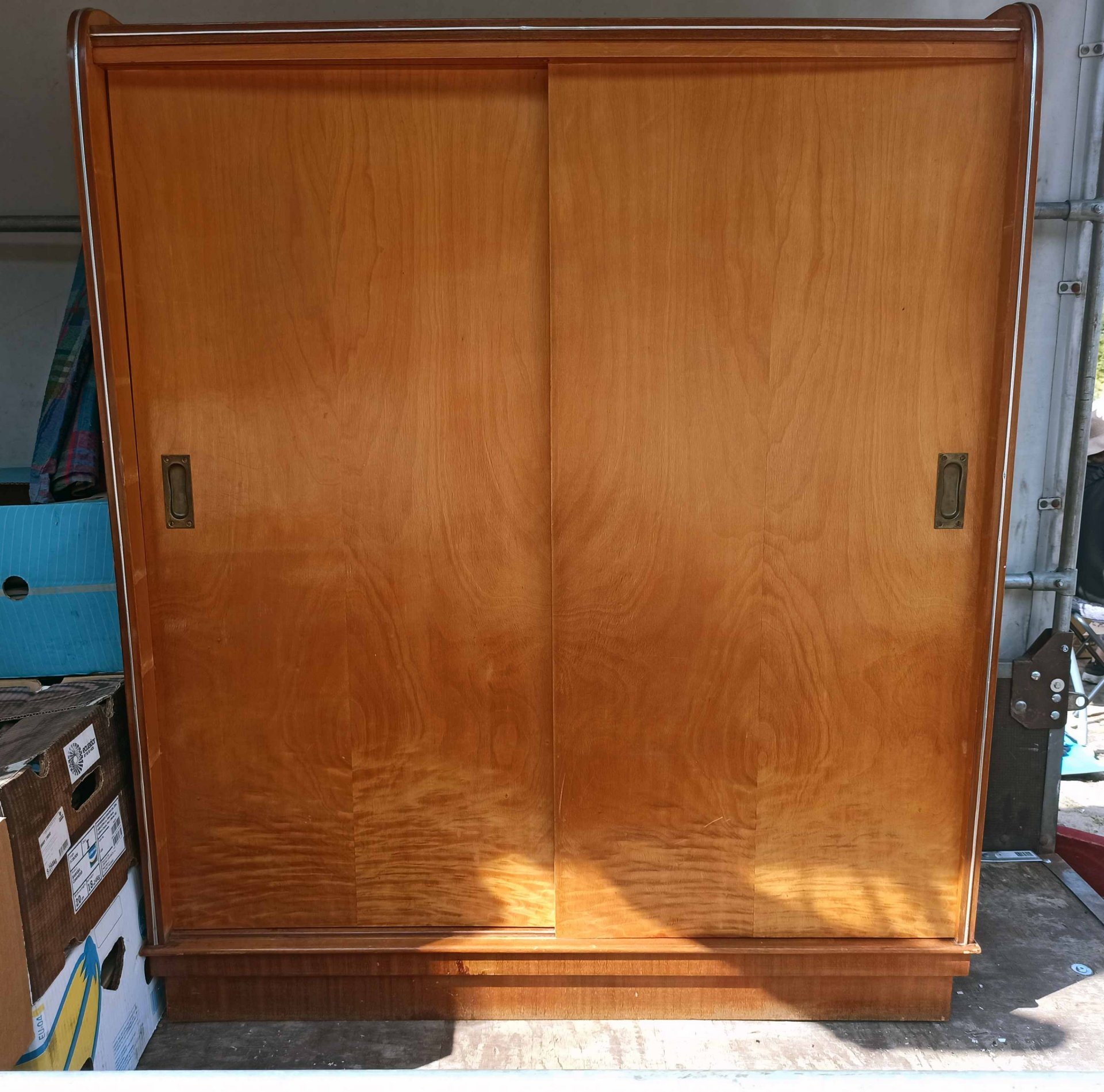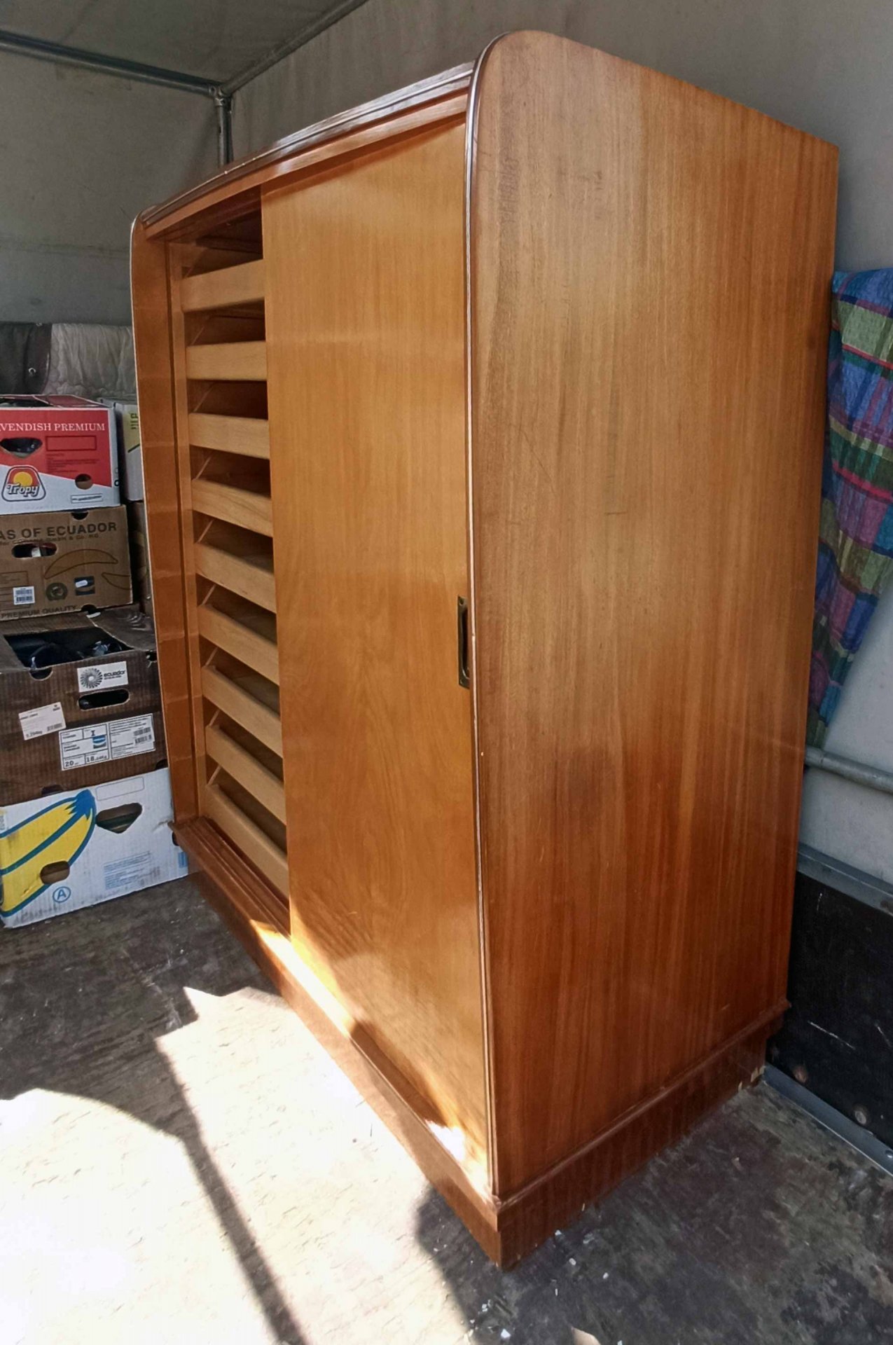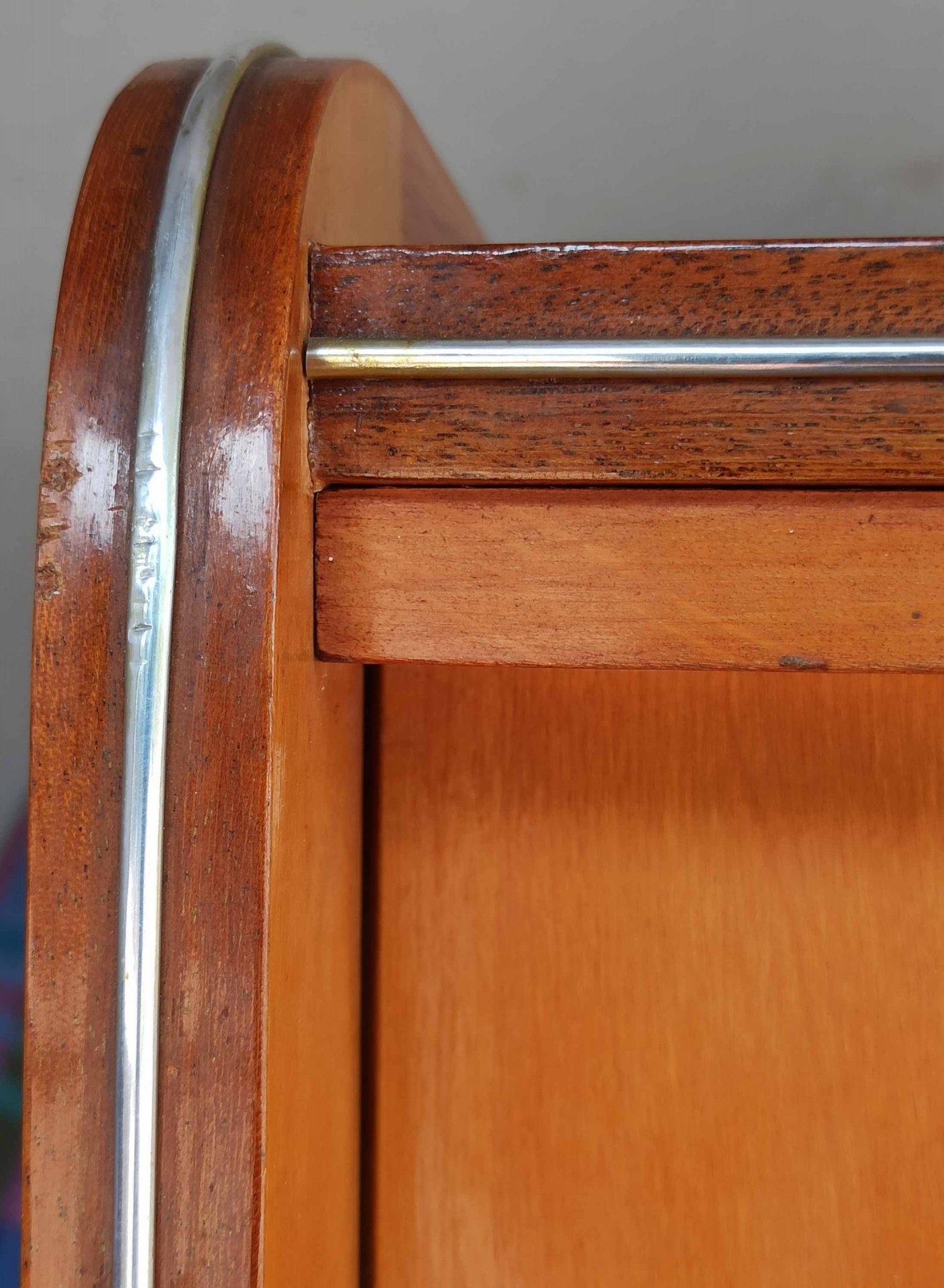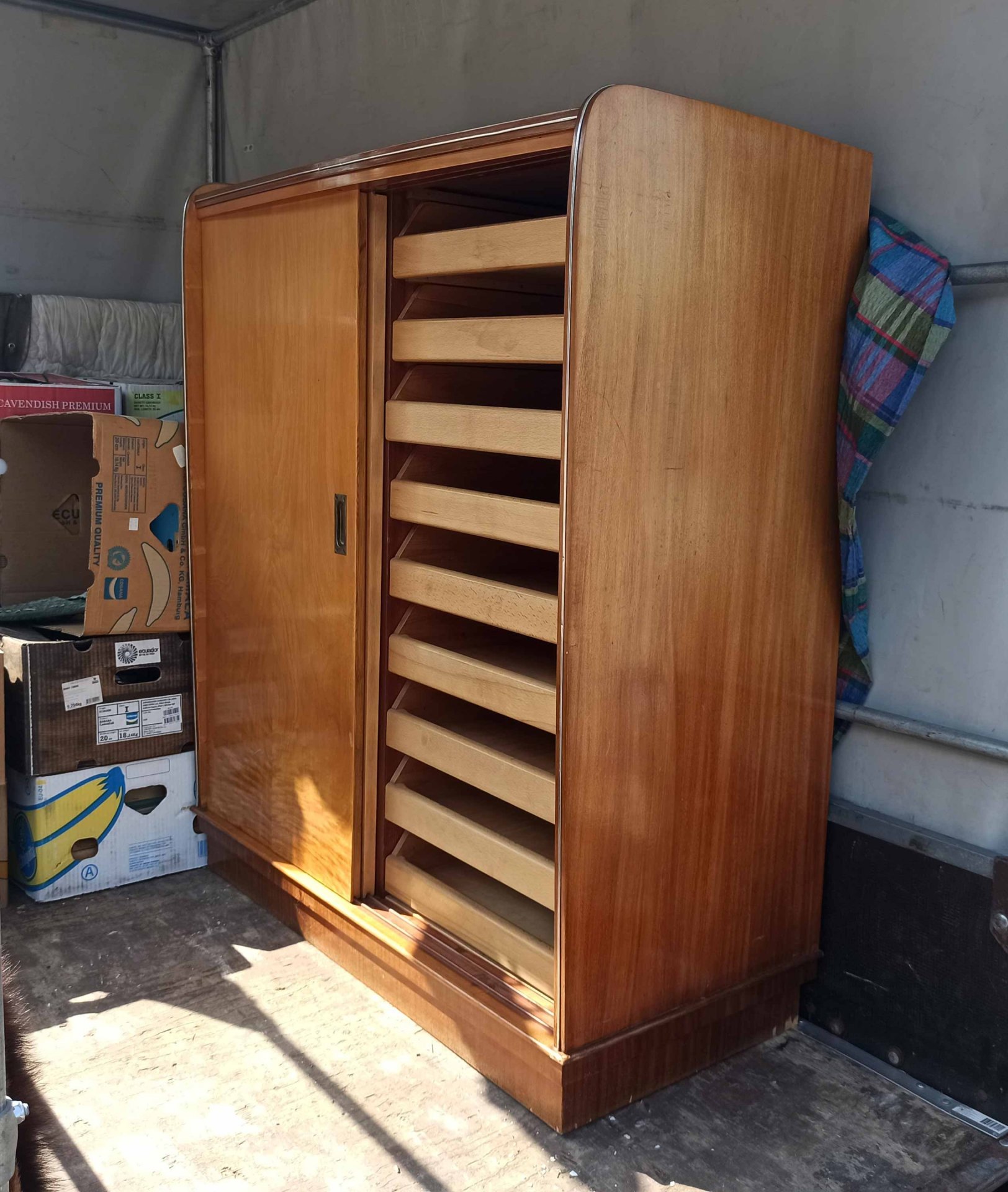 Interessanter, seltener Schrank mit 18 Schubladen hinter zwei Schiebetüren aus den 60er Jahren. Als Schrank für Kleidung aber auch für Grafiken o.ä. geeignet. Sehr selten und praktisch. Interessantes Design. Guter Zustand mit geringen Gebrauchsspuren und nur kleineren Mängeln. H. 131 cm, B. 110 cm T. 53 cm. Schubkästen B.47/50 cm T. 41 cm.