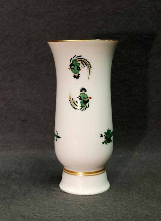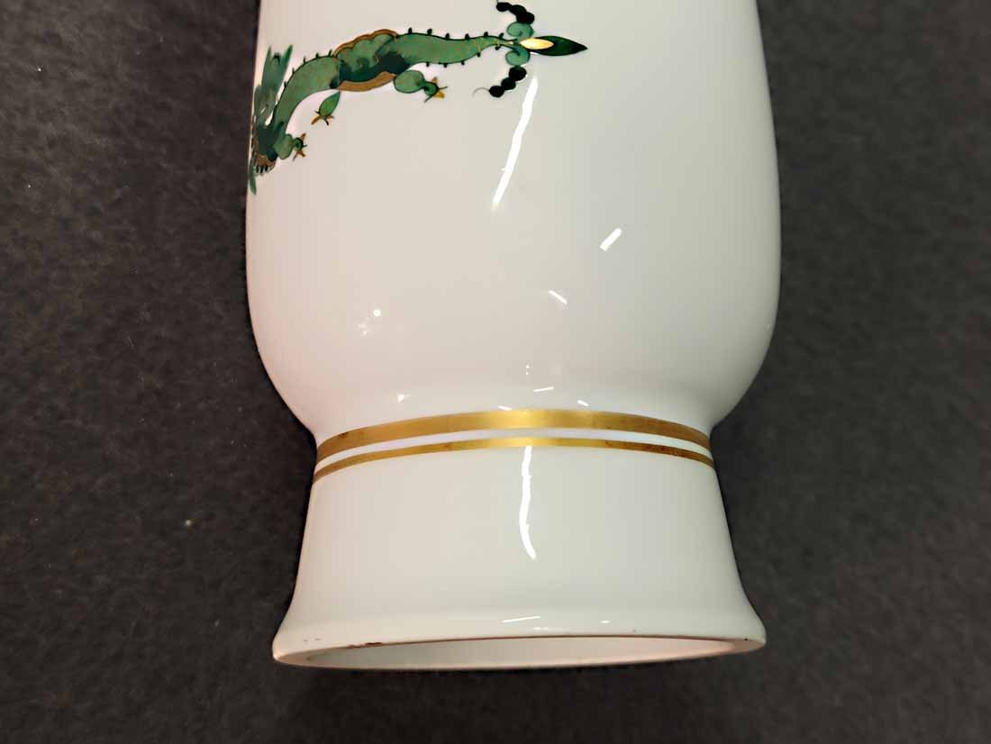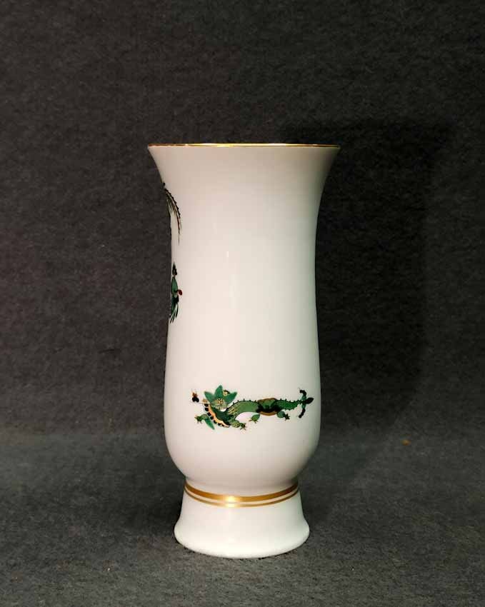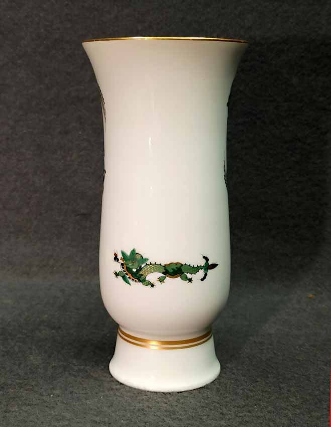 Meissen, Vase, Dekor Grüner Drache. Drache mit Gold und Gold geschuppt, Vase mit Goldrändern. Beidseitig identische Malerei. H. 17 cm. Meissen Schwertermarke ohne Schleifstriche 1. Wahl. Zustand ohne Beschädigungen.
