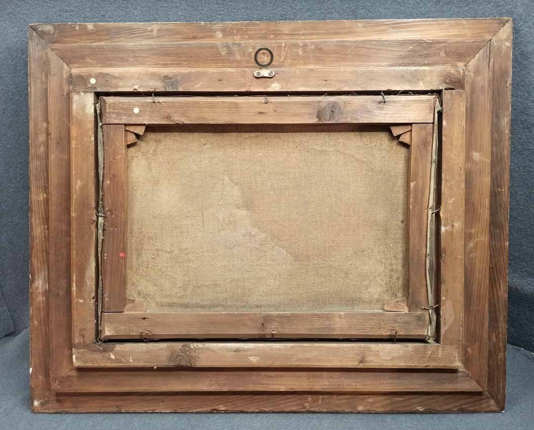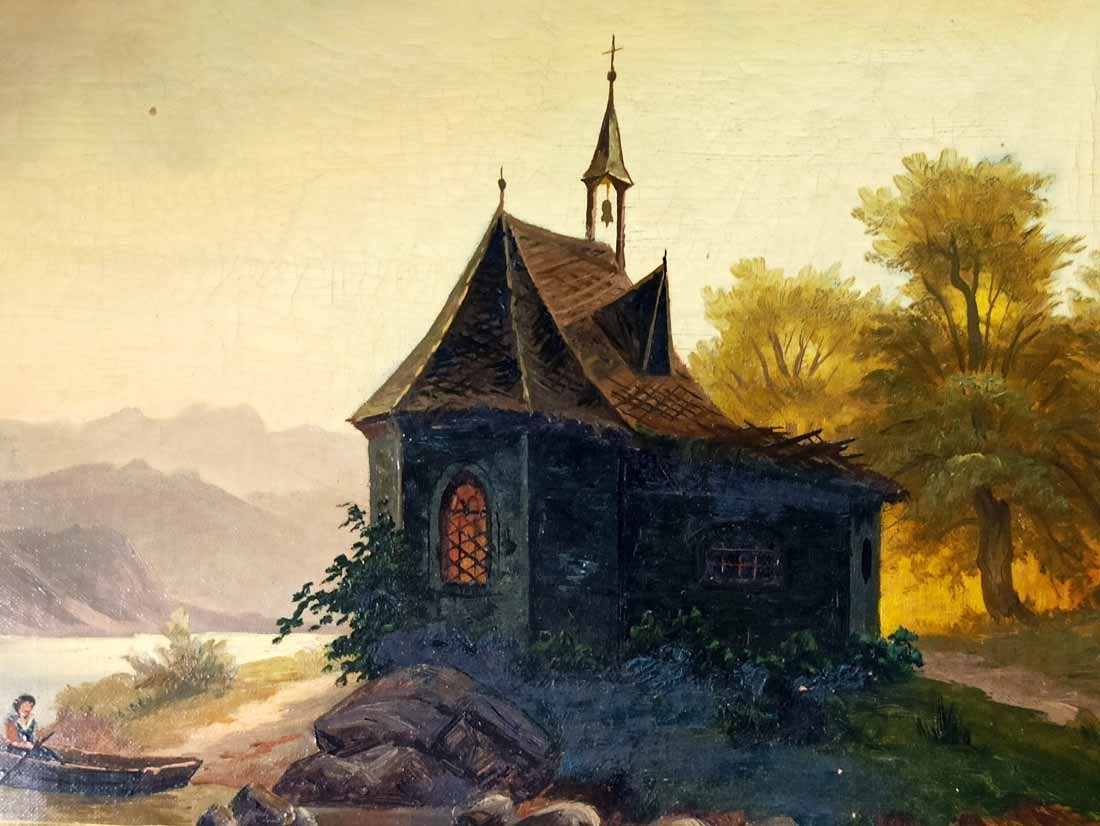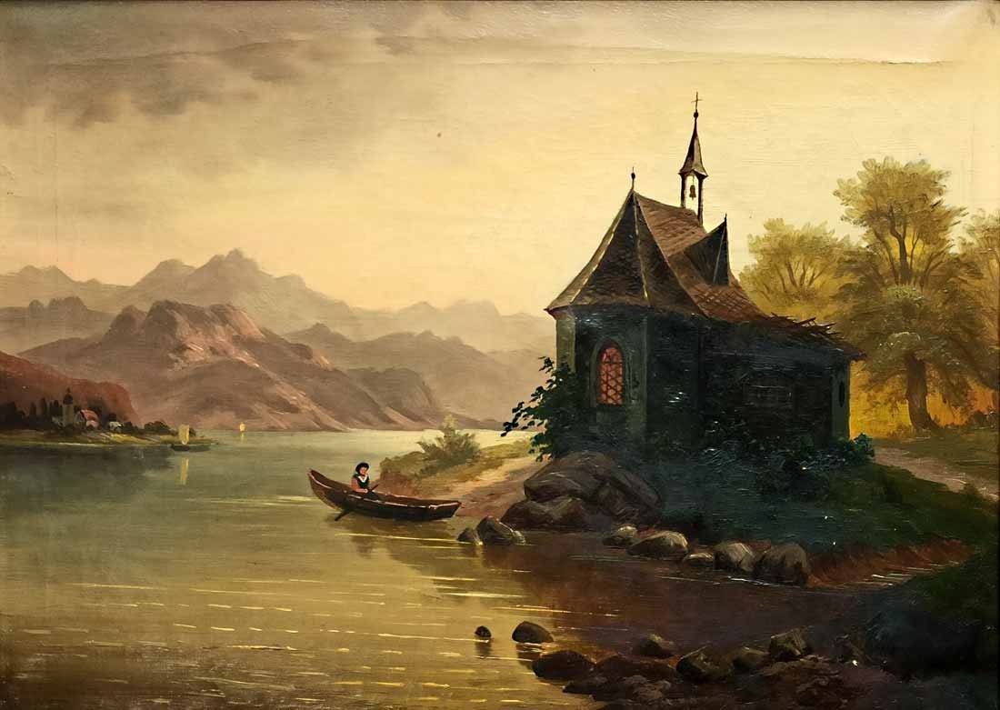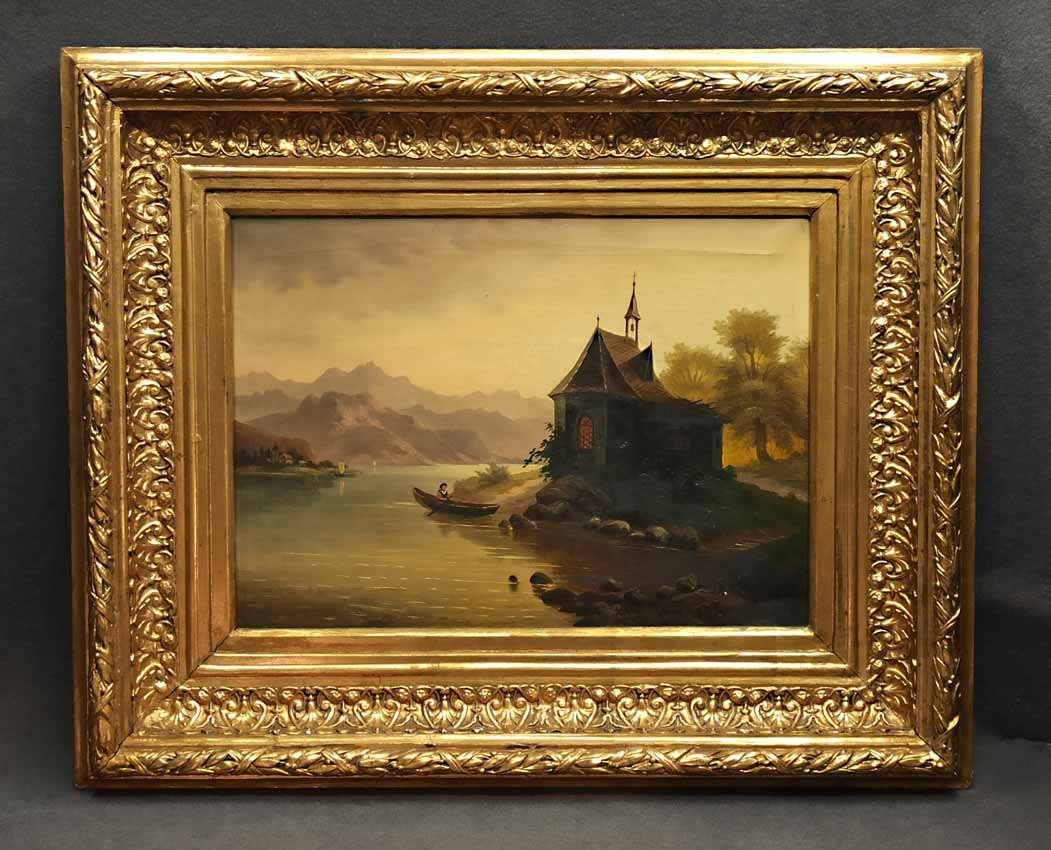Landschaftsgemälde, "Gebirgssee mit Boot und Kapelle" 2. Hälfte 19. Jahrhundert. Öl auf Leinwand auf Keilrahmen, im originalen Zeittypischen Gold-Rahmen. Li. u. undeutlich signiert: ? Schmitz ?. B. x H. 45/55 cm x 32,5/42,5 cm.