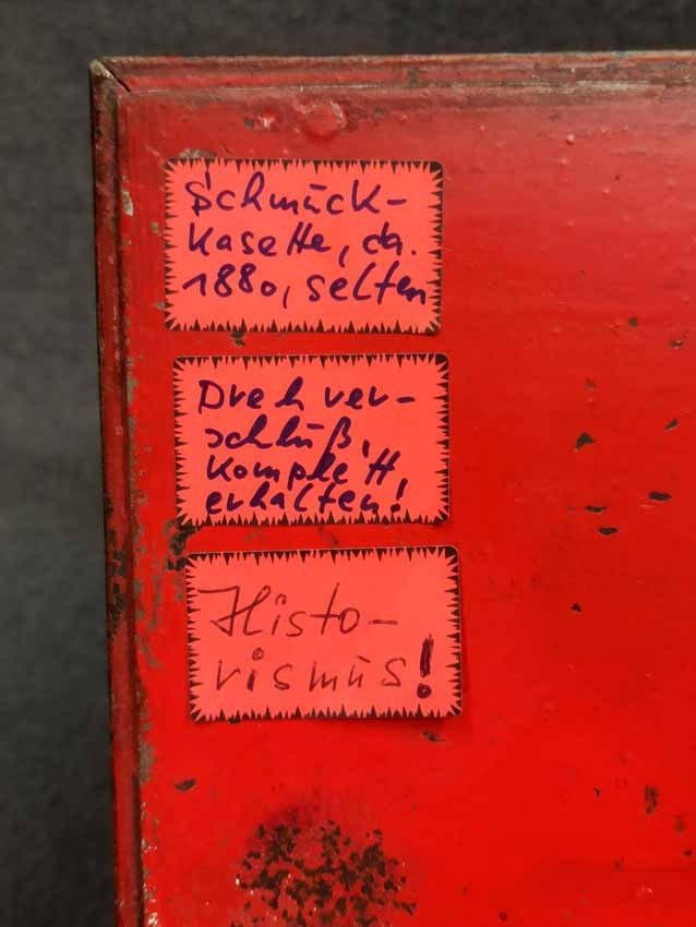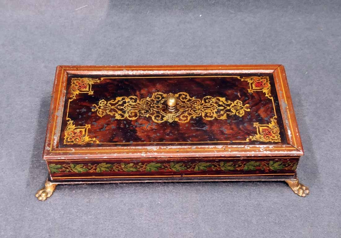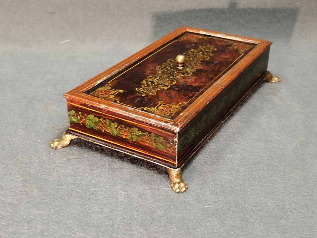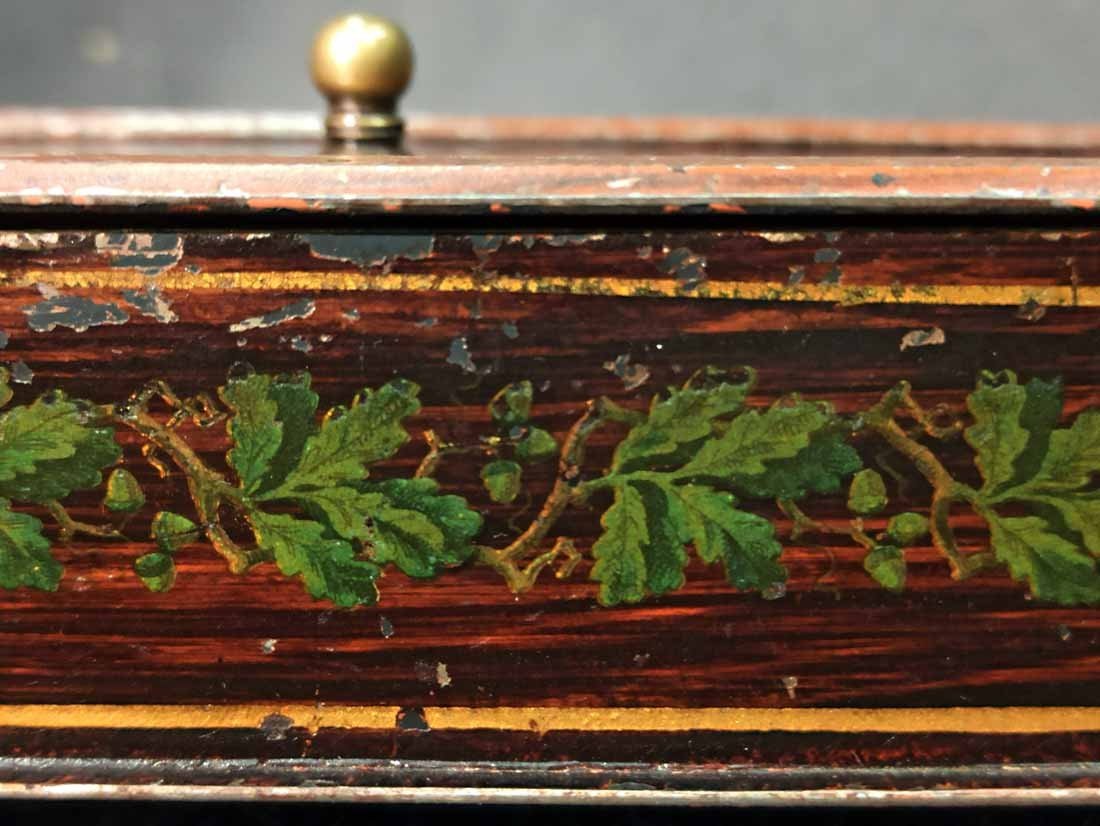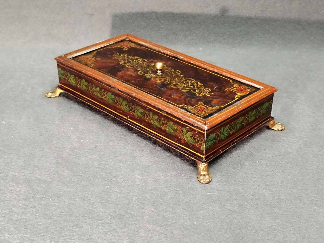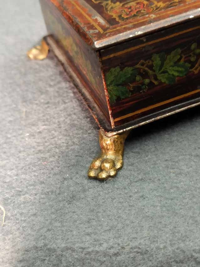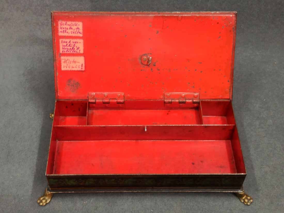 Schatulle, Kassette für Schmuck, Geld etc. Historismus um 1880. Metall auf Tazenfüßen, Korpus mit Holzmalerei und zeittypischer Ornamentik. Seitlich umlaufend Blattdekor. Drehbarere Mittelknauf als Verschluss. Mit Gebrauchsspuren und Abschläge im Dekor. Im wesentlichen sehr gut erhalten. Innen alte Sammleretiketten mit Beschreibung. L. x B. 27 cm x 15 cm, H. 6,5 cm.