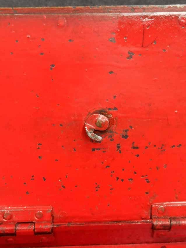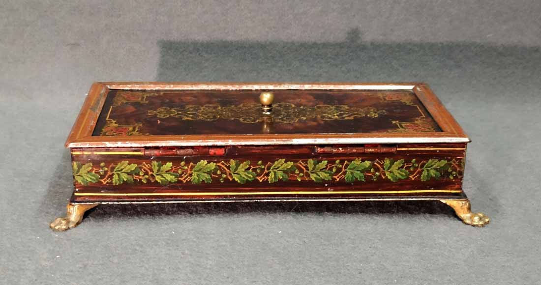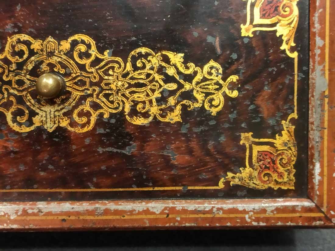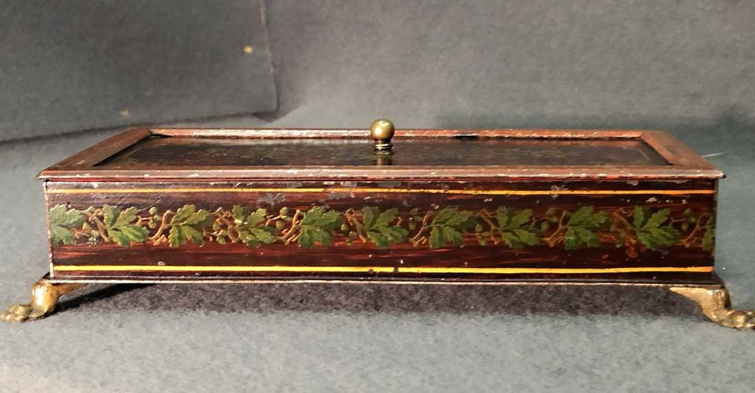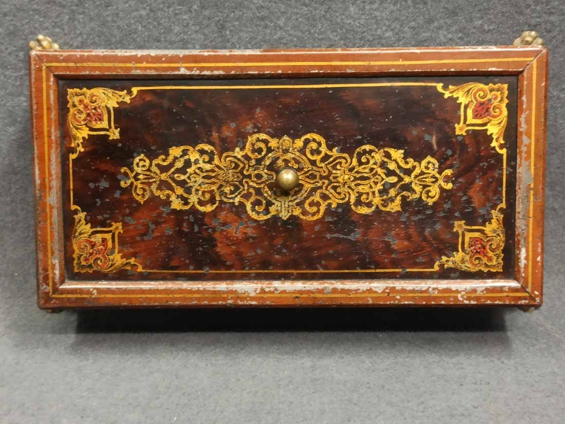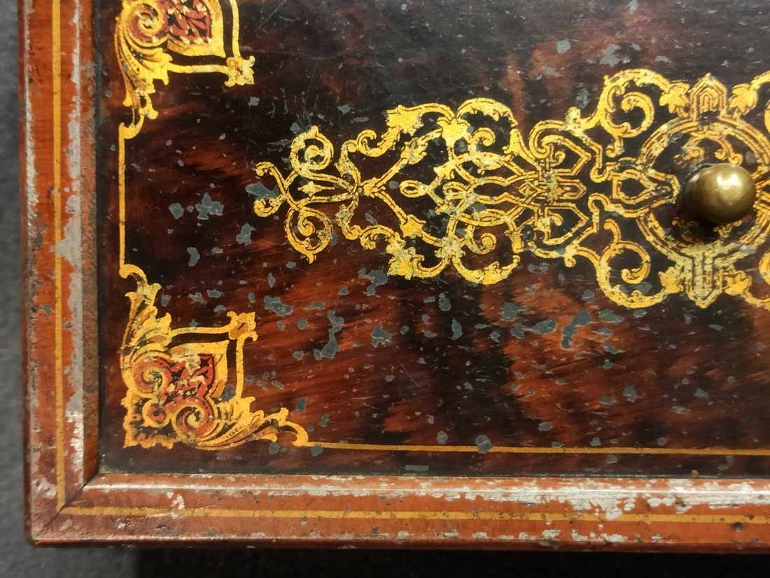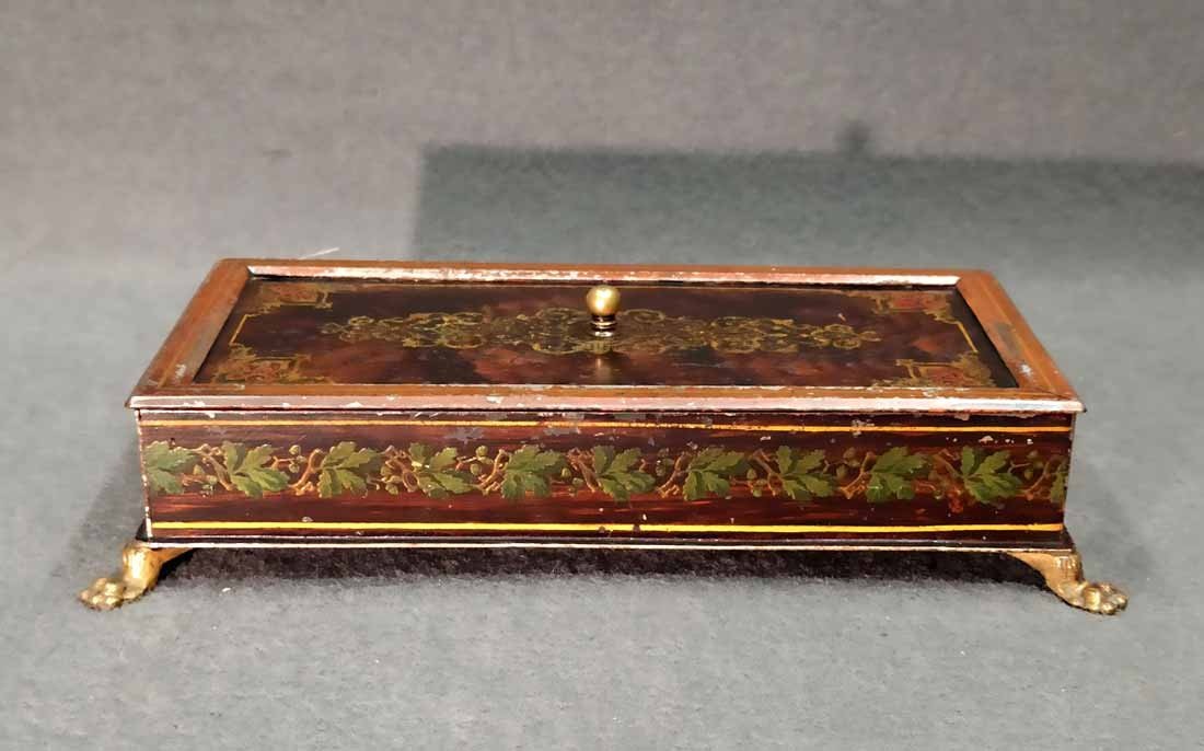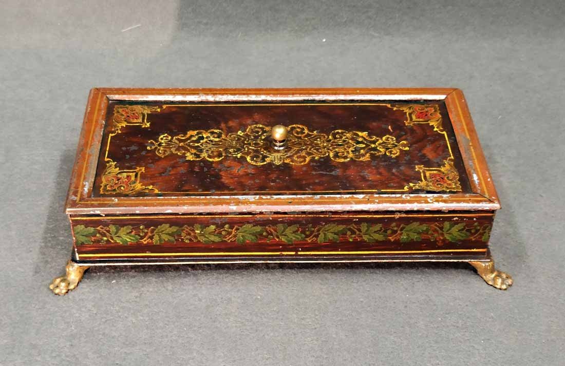 Schatulle, Kassette für Schmuck, Geld etc. Historismus um 1880. Metall auf Tazenfüßen, Korpus mit Holzmalerei und zeittypischer Ornamentik. Seitlich umlaufend Blattdekor. Drehbarere Mittelknauf als Verschluss. Mit Gebrauchsspuren und Abschläge im Dekor. Im wesentlichen sehr gut erhalten. Innen alte Sammleretiketten mit Beschreibung. L. x B. 27 cm x 15 cm, H. 6,5 cm.