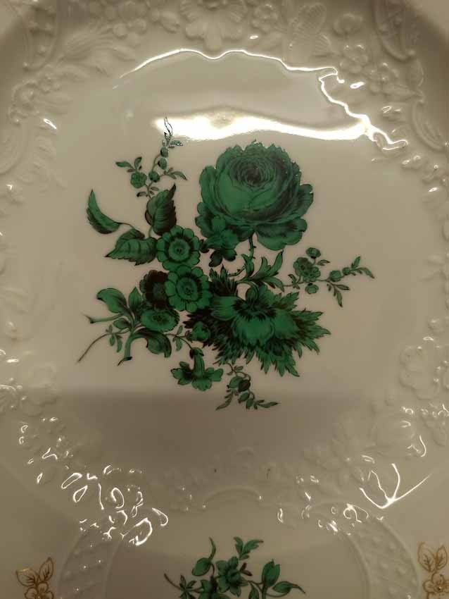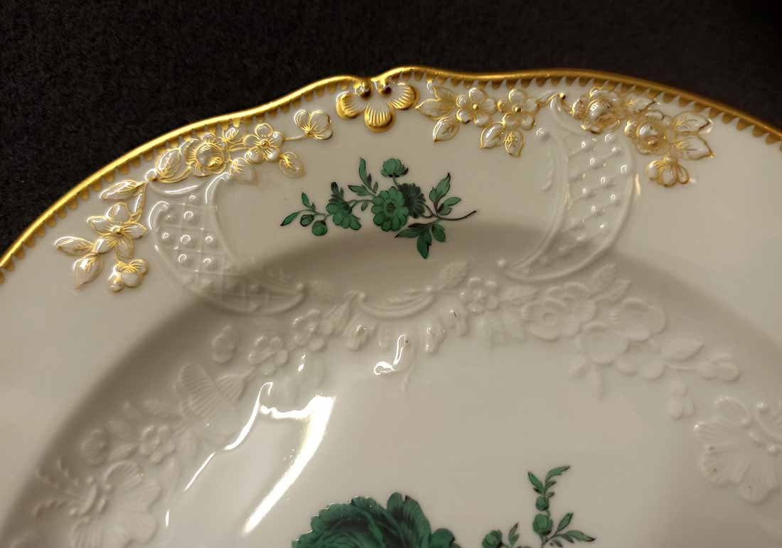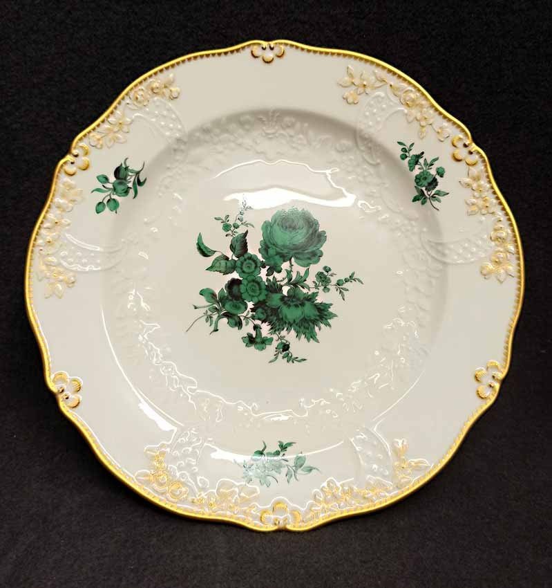 Meissen, Teller, Kupfergrüne Blumenmalerei mit Neumarseille Reliefrand und reich gezierter Goldmalerei
