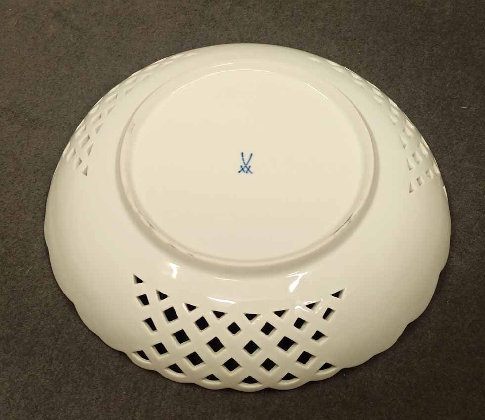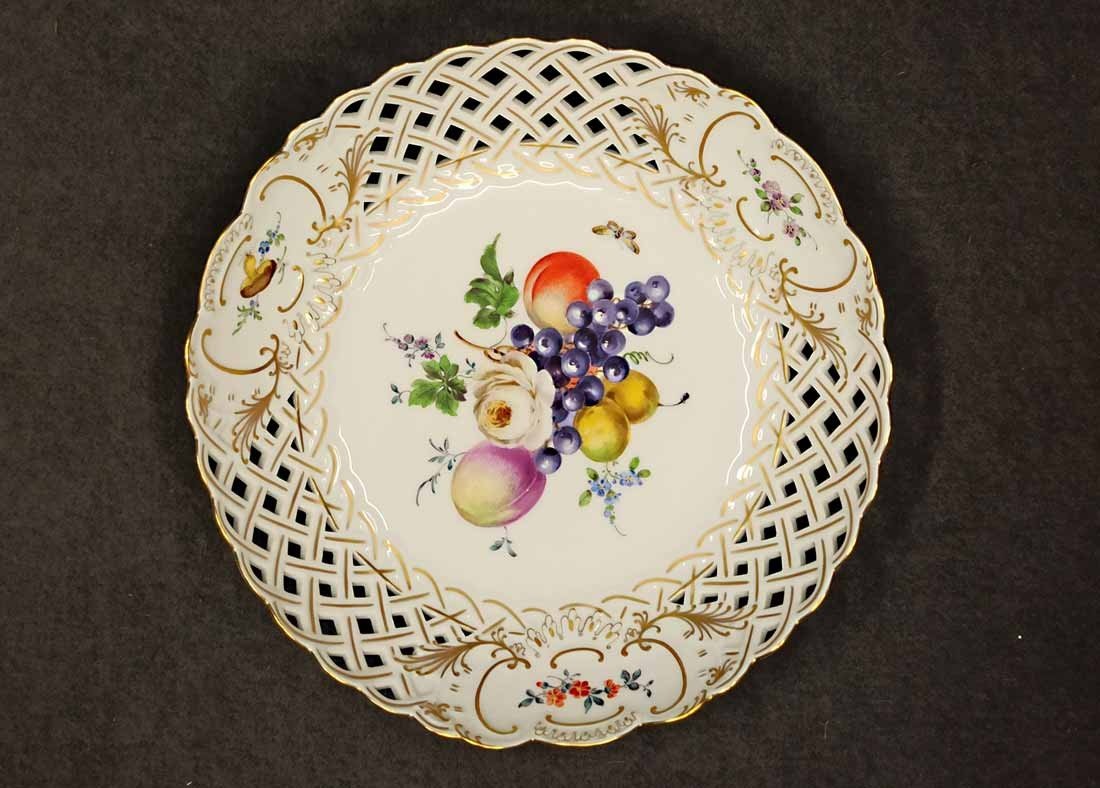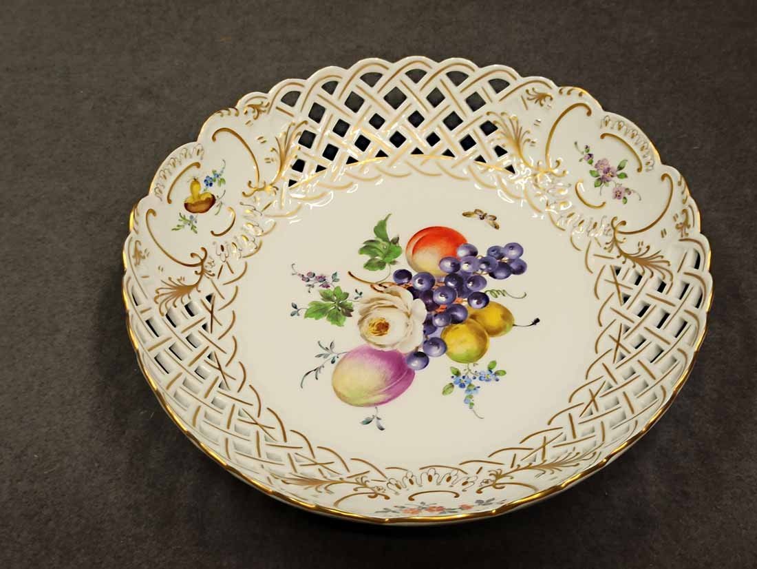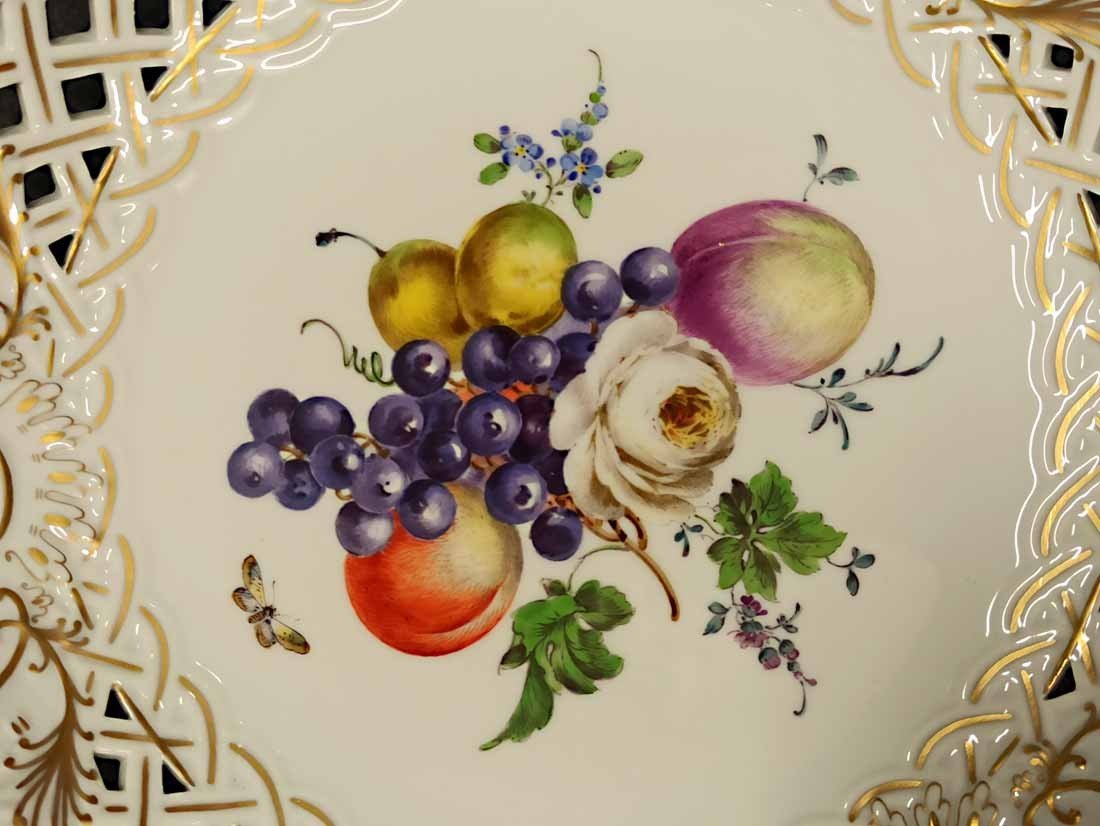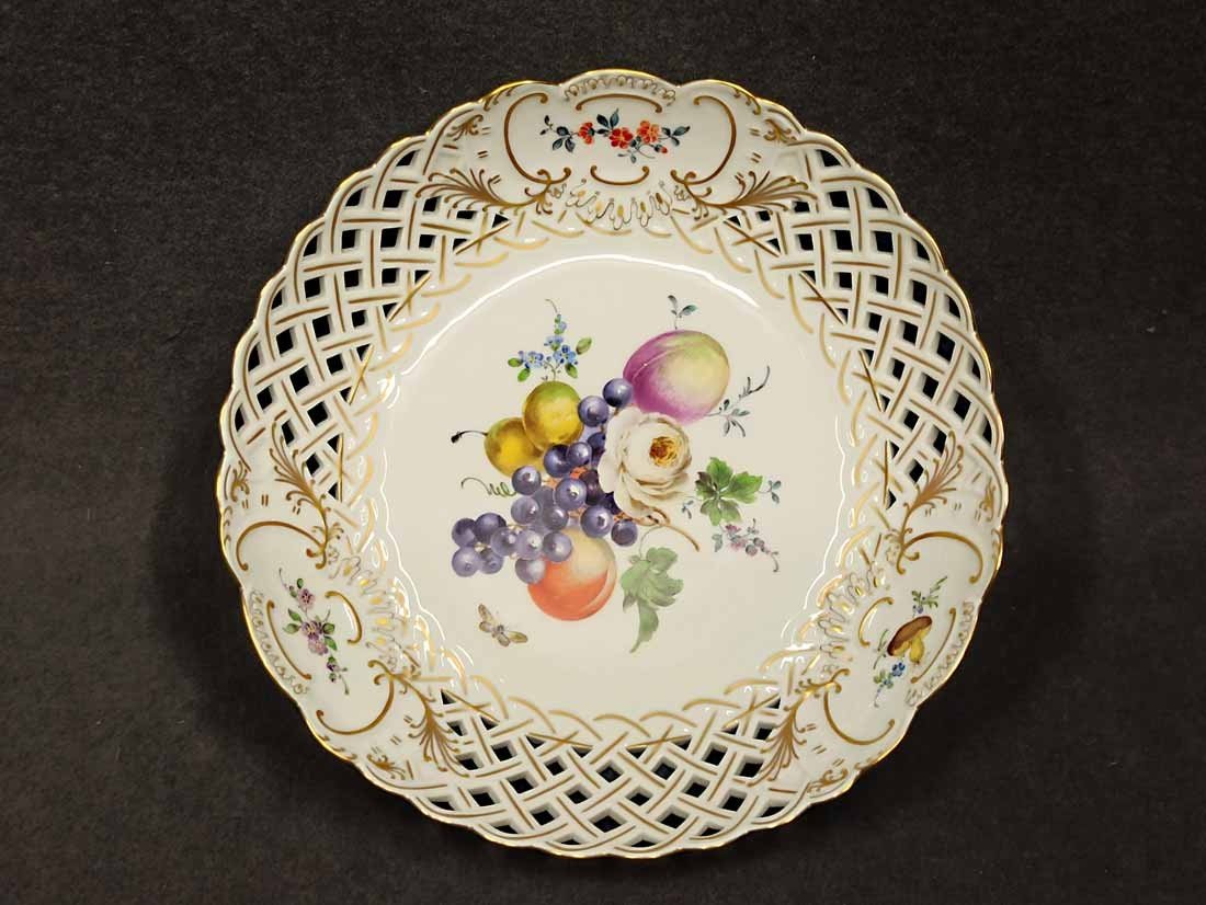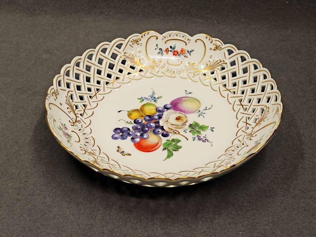 Meissen, Durchbruchschale mit Flechtrand. Sehr aufwändige Malerei; Obstmalerei mit Insekten und Pilz. Sehr guter Zustand ohne Beschädigungen, keine Gebrauchsspuren. D. 24 cm, H.5,5 cm. Äußerst schöne Hausmalerei, aus dem Besitz einer Porzellanmalerin von Meissen. Sogenannte Deputatware, Marke 4x gestrichen, für Angestellte der Manufaktur Meissen.