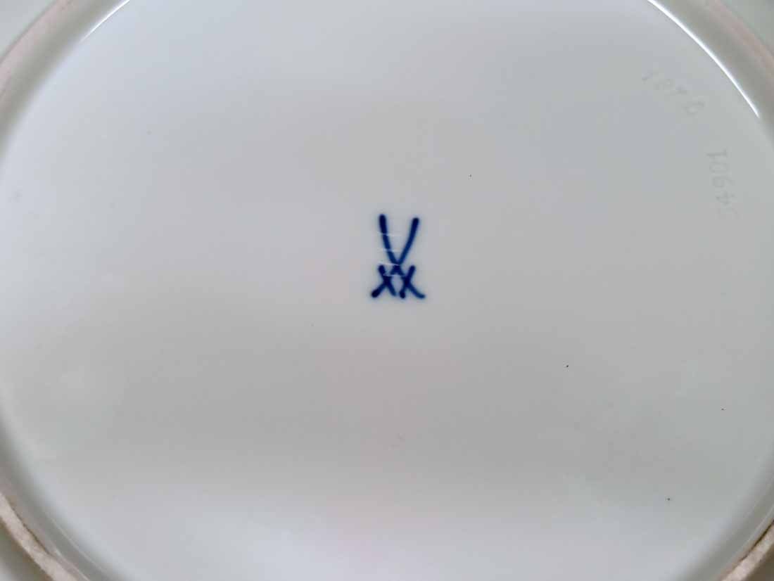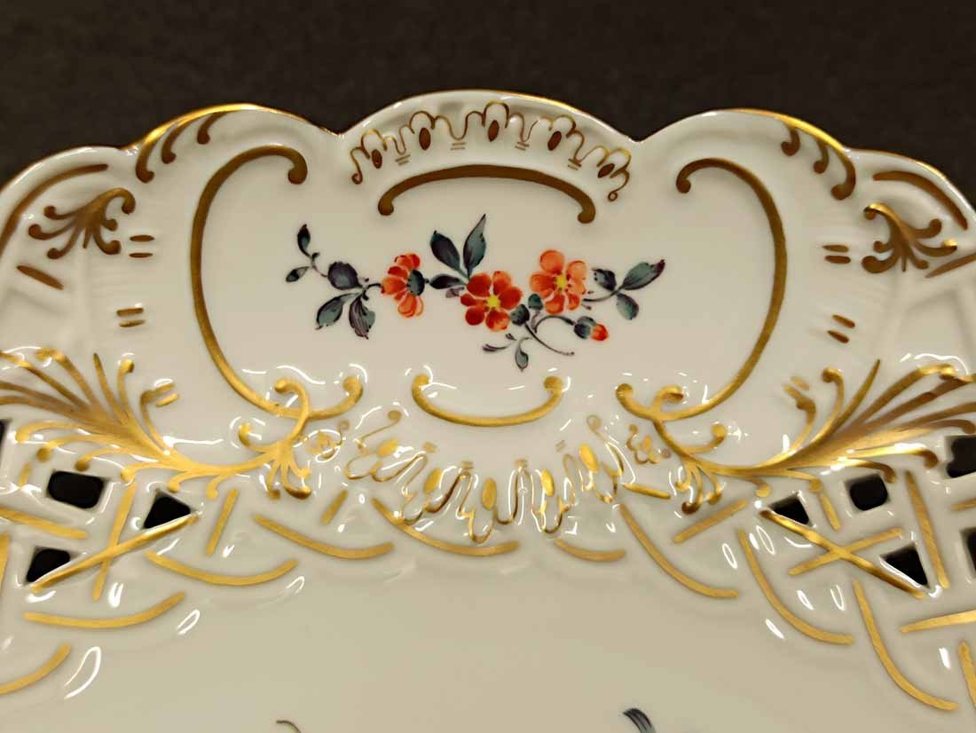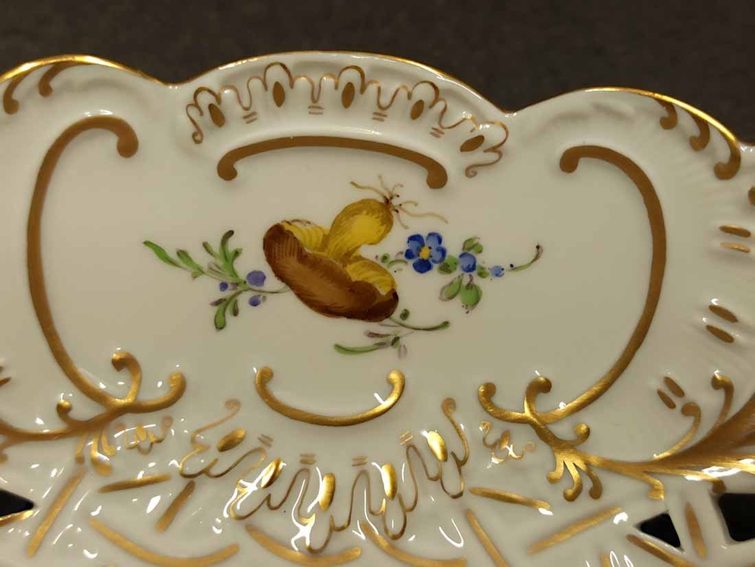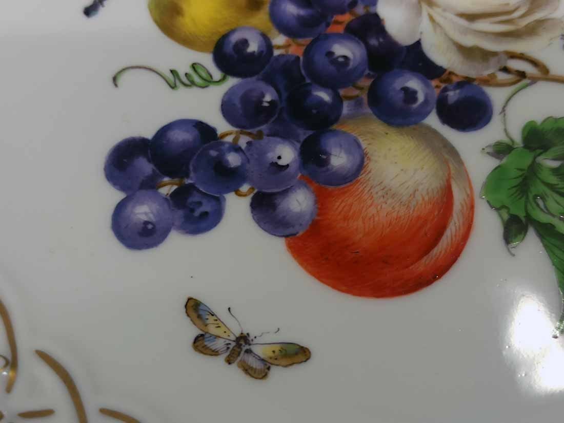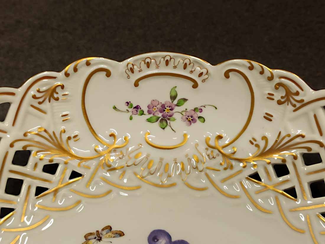 Meissen, Durchbruchschale mit Flechtrand. Sehr aufwändige Malerei; Obstmalerei mit Insekten und Pilz. Sehr guter Zustand ohne Beschädigungen, keine Gebrauchsspuren. D. 24 cm, H.5,5 cm. Äußerst schöne Hausmalerei, aus dem Besitz einer Porzellanmalerin von Meissen. Sogenannte Deputatware, Marke 4x gestrichen, für Angestellte der Manufaktur Meissen.