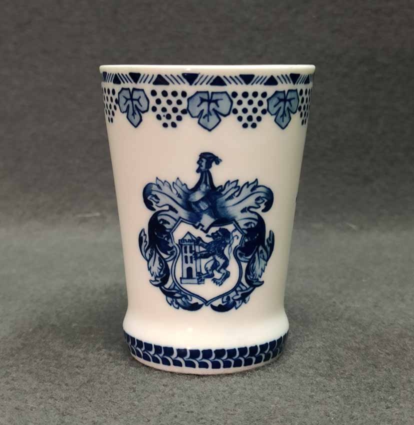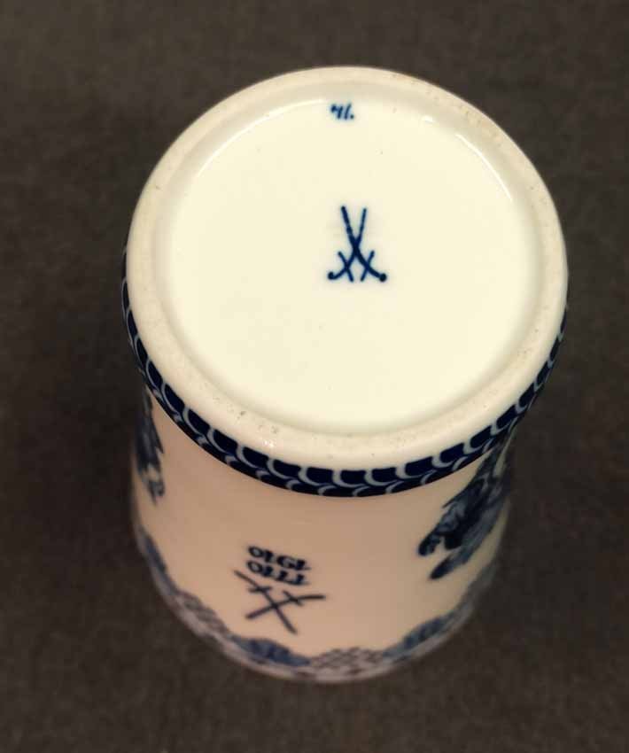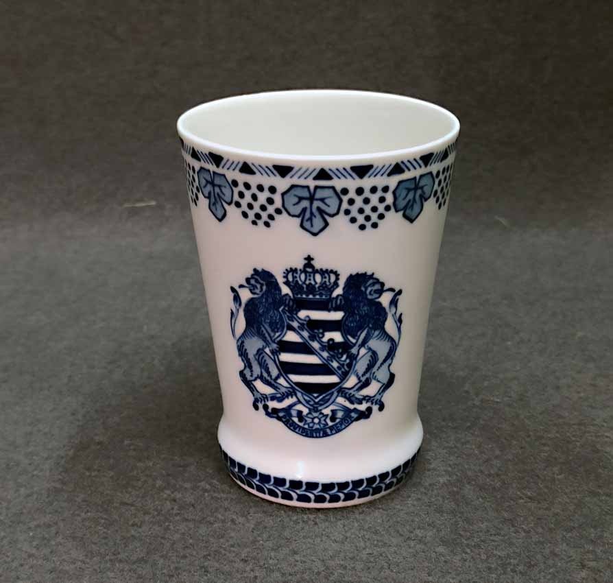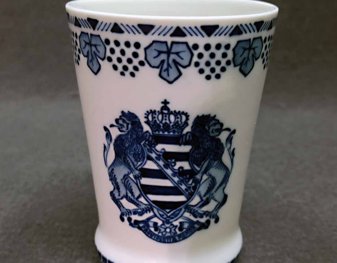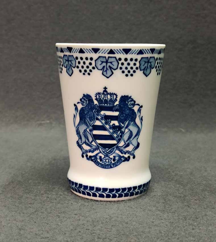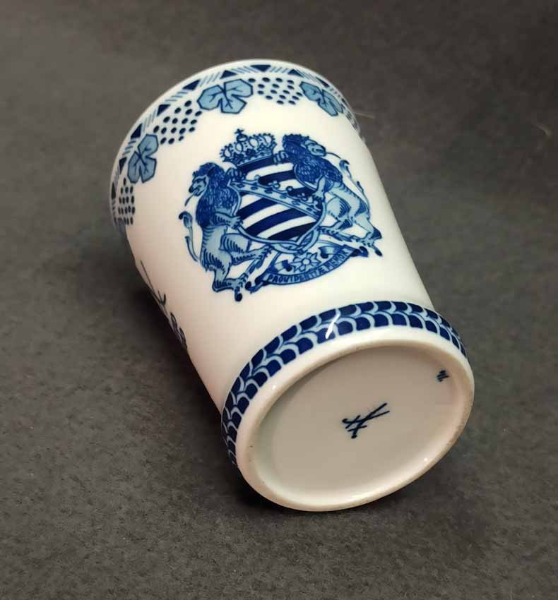 Meissen, Weinbecher zum Jubiläum der Manufaktur 1710 - 1910 mit Sachsen Wappen, Schwertermarke und Stadtwappen von Meißen auf der Wandung. Am Boden Schwertermarke der Manufaktur Meissen, Knaufschwerter original a.d. Zeit um 1910, 2x gestrichen. H.10 cm, D. 7,5 cm.