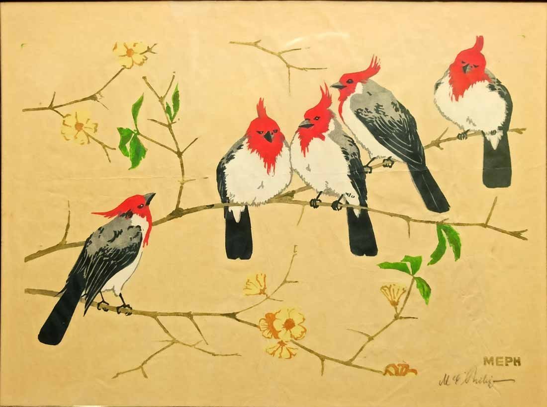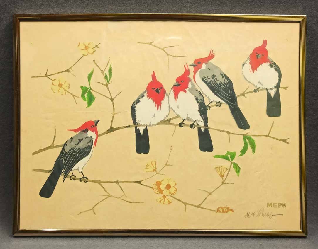 MEPH, Martin Erich Philipp; Farbholzschnitt, Fünf Kardinale, um 1924, Werksverzeichnis Götze D16. Re.u. im Stock bezeichnet "MEPH" und in Blei sign. "M.E.Philipp". In neuzeitl. Rahmen 40 x 30 cm.