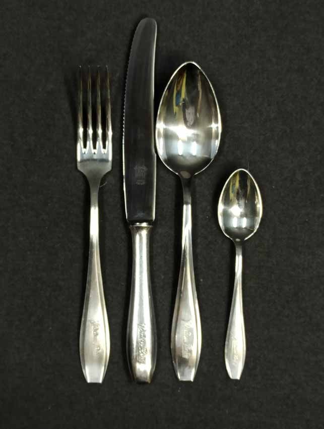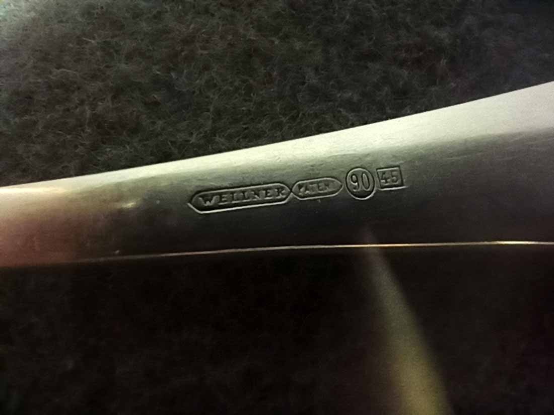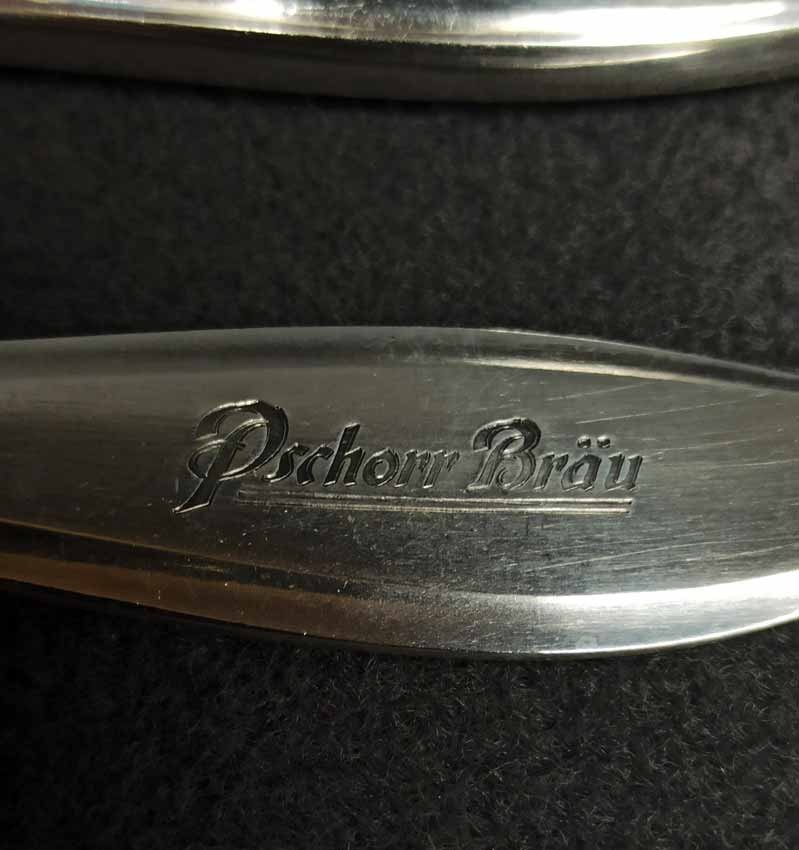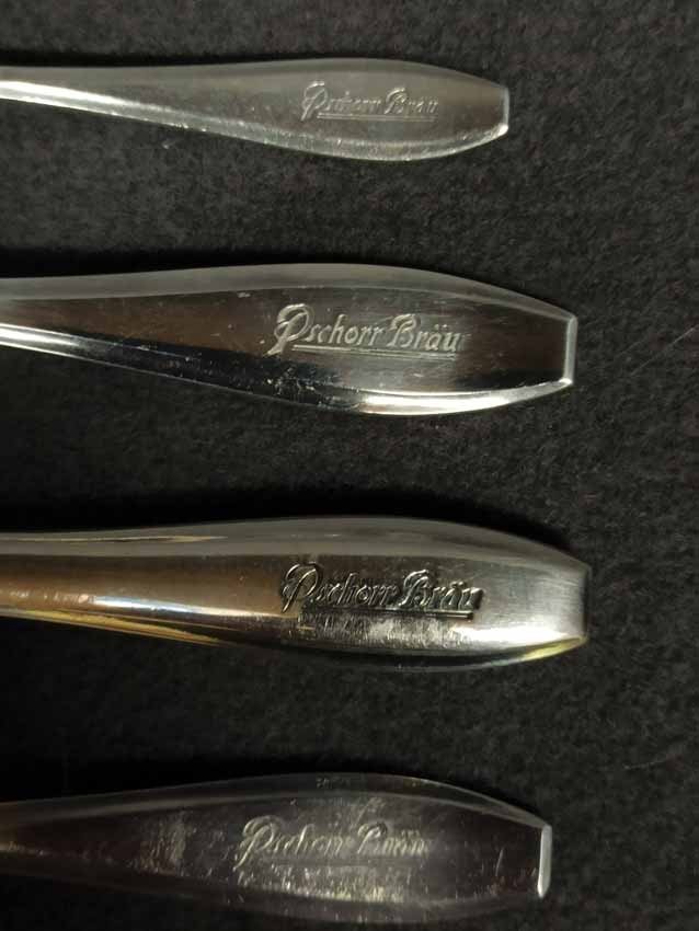 Pschorr Bräu - Besteck um 1900/1920. Set, 4Teile, bestehend aus Messer + Gabel, Löffel groß und Löffel klein. Jedes Teil mit Schriftzug "Pschorr Bräu" am Griff. Auf den Fotos ist der Schriftzug tw. undeutlich wegen der Spiegelungen. Im original sind alle deutlich ausgeprägt. Wellner Besteck, Wellner Silber 90er Auflage. Sehr guter Zustand.