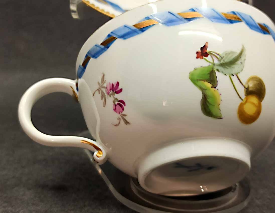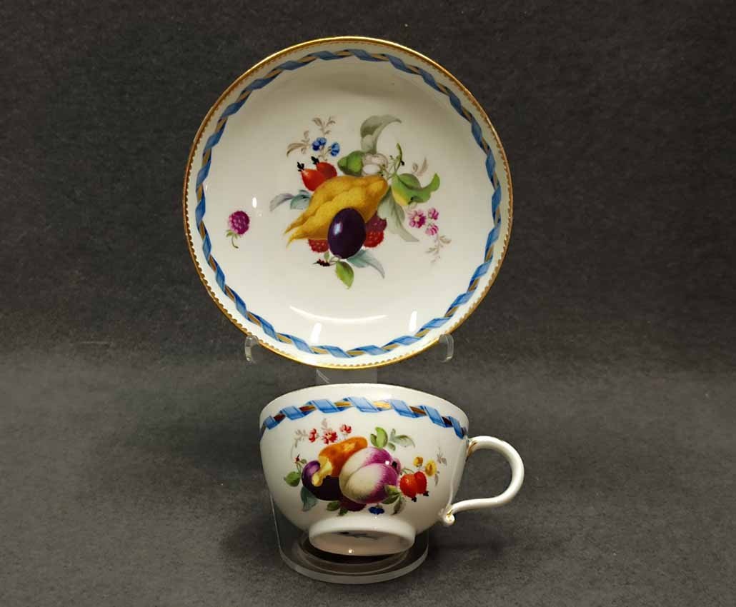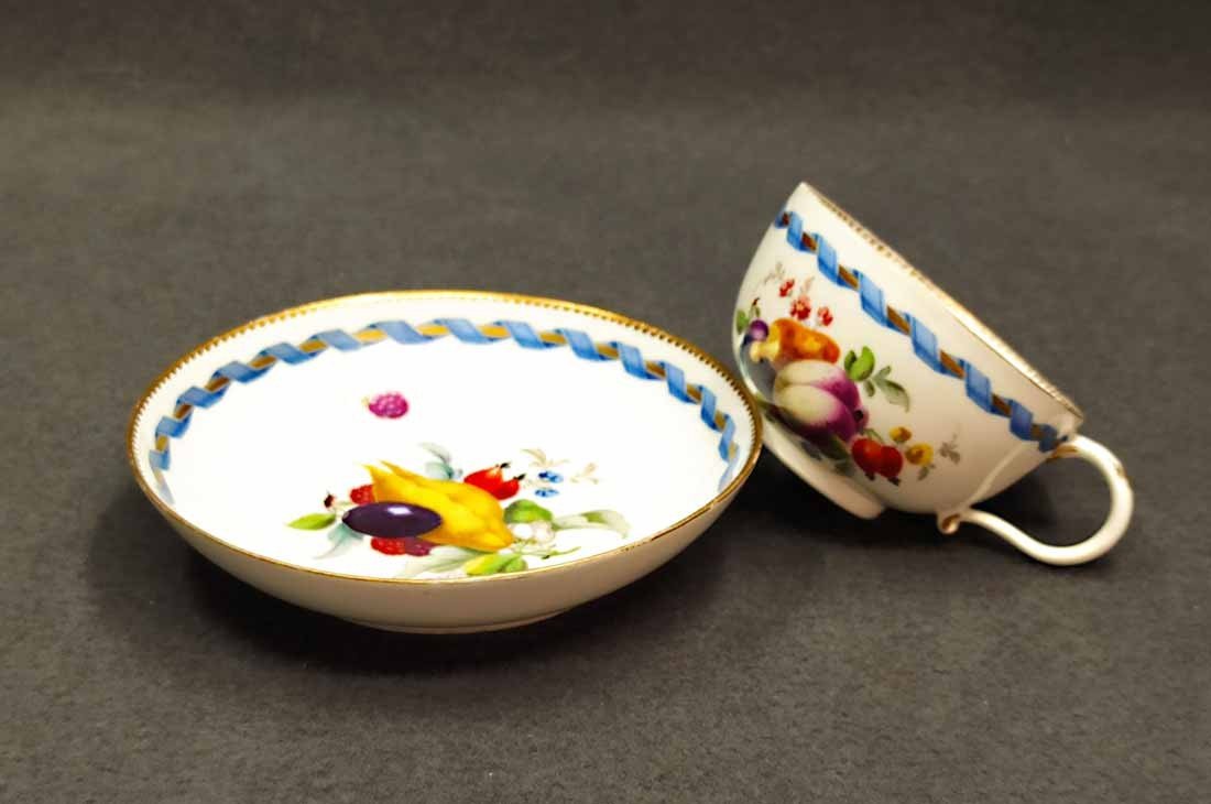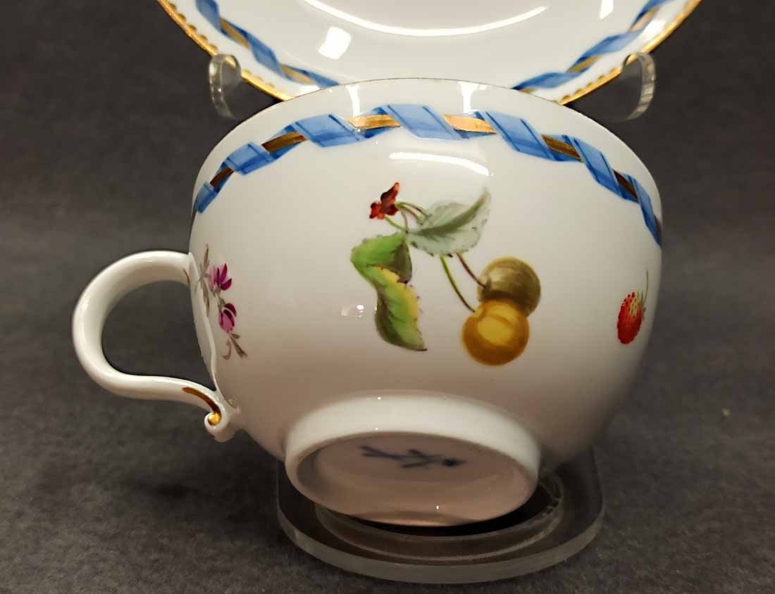 Meissen alt, Markolinizeit um 1790. Tasse mit Obst- bzw. Gartenmalerei, Randbordüre und Goldrand. Fein  und aufwändig gemaltes Obst, Pilz, Beeren, Gemüse und Blattwerk auf Tasse und Untertasse. Guter Zustand; Tasse ohne Beschädigungen. Untertasse mit einer alten, gut ausgeführten Restaurierung am Rand innen (Foto), Bordüre sehr gut, das Weiß farbl. etwas abweichend. Die Außenseite an dieser Stelle bis zu Oberkannte unbeschädigt. Goldränder etwas berieben. Tasse. H. 4,7 cm, D. 8 cm; Untertasse H. 3 cm, D. 13 cm. Schwertermarke der Manufaktur Meissen mit Markolinistern um 1790 ohne Schleifstriche, 1. Wahl.