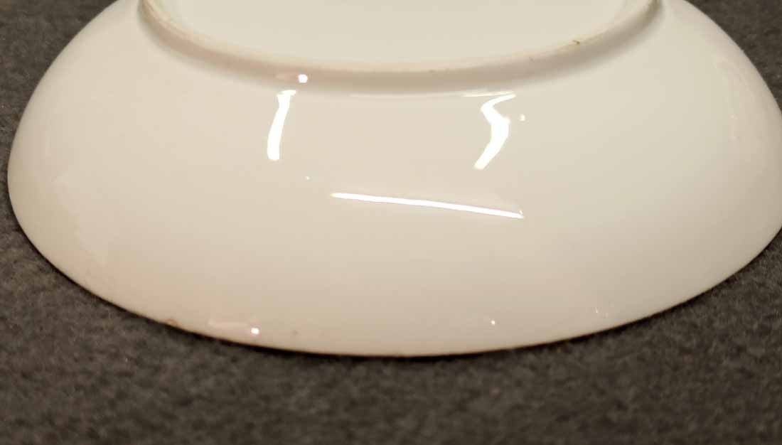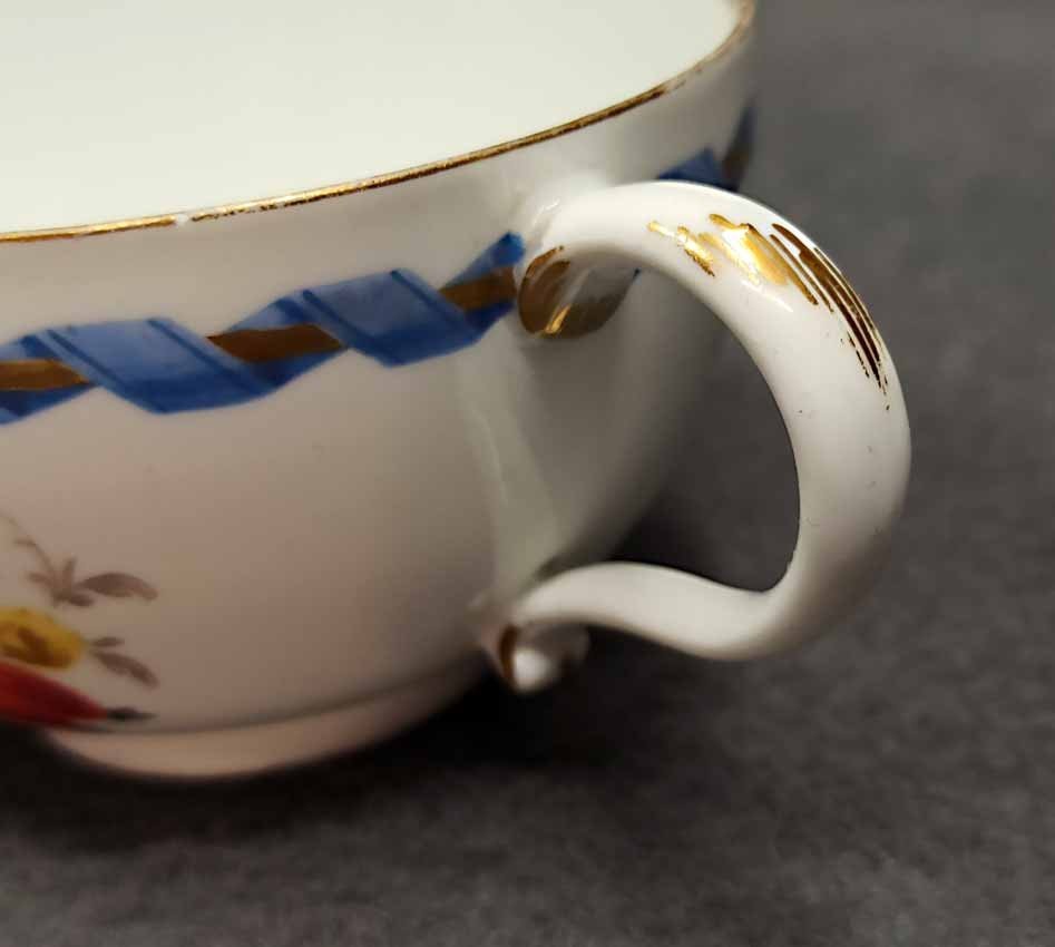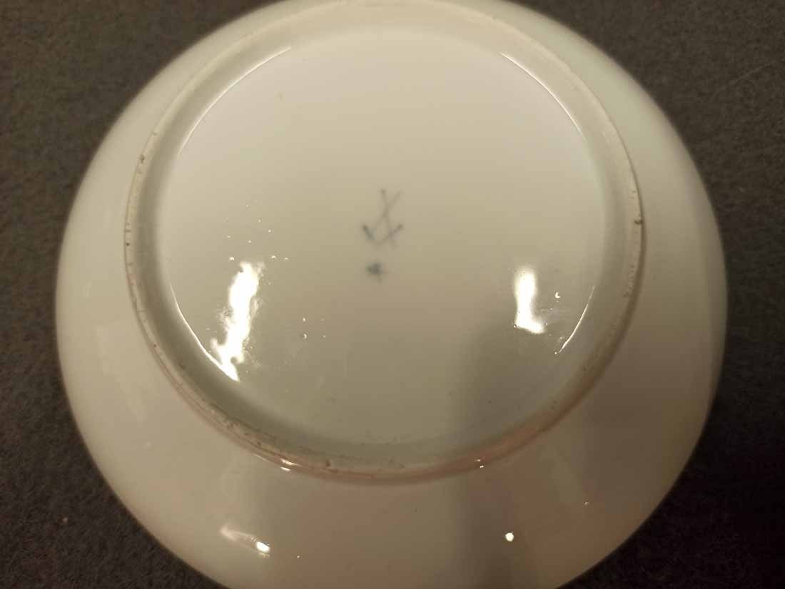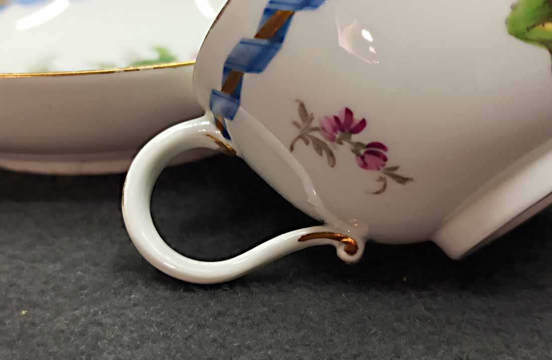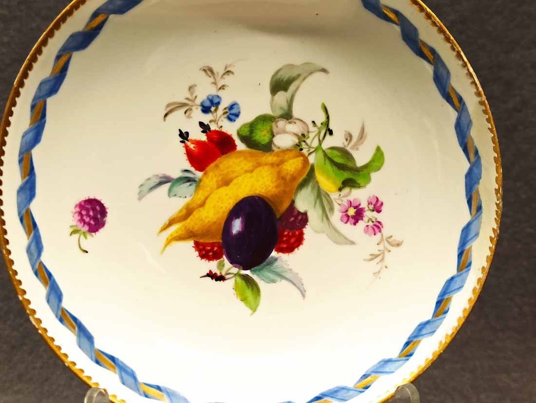 Meissen alt, Markolinizeit um 1790. Tasse mit Obst- bzw. Gartenmalerei, Randbordüre und Goldrand. Fein  und aufwändig gemaltes Obst, Pilz, Beeren, Gemüse und Blattwerk auf Tasse und Untertasse. Guter Zustand; Tasse ohne Beschädigungen. Untertasse mit einer alten, gut ausgeführten Restaurierung am Rand innen (Foto), Bordüre sehr gut, das Weiß farbl. etwas abweichend. Die Außenseite an dieser Stelle bis zu Oberkannte unbeschädigt. Goldränder etwas berieben. Tasse. H. 4,7 cm, D. 8 cm; Untertasse H. 3 cm, D. 13 cm. Schwertermarke der Manufaktur Meissen mit Markolinistern um 1790 ohne Schleifstriche, 1. Wahl.