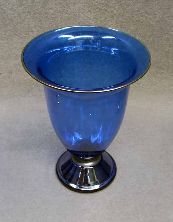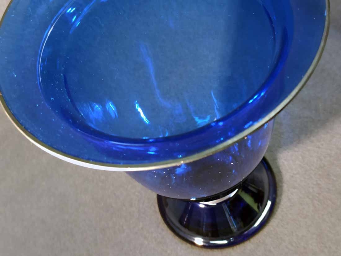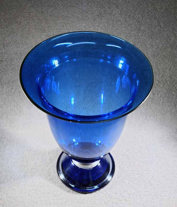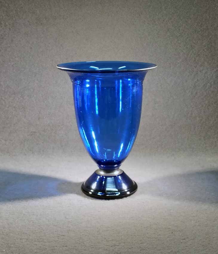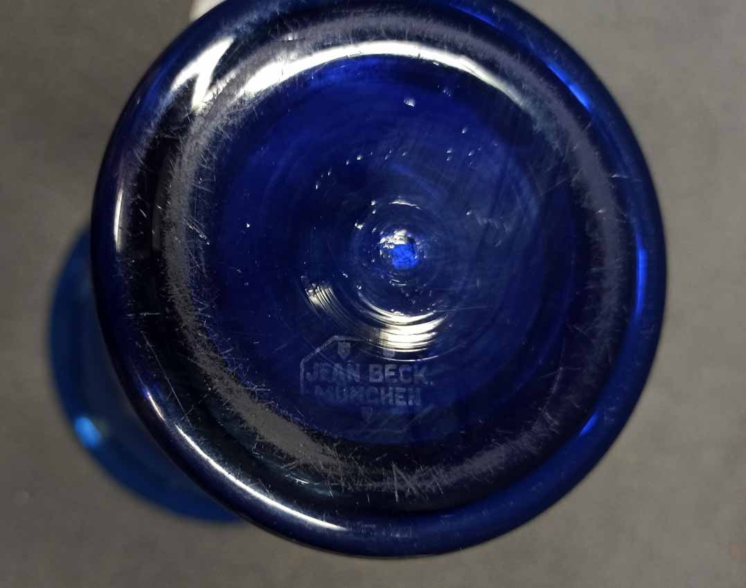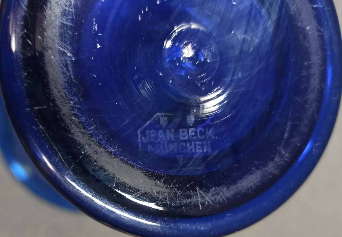 Jean Beck, München. Blaue Kraterartige Vase auf Fuß. Art Deco um 1920/25. Jean Beck (eig. Johann Ludwig) Glas- und Keramikdesigner, studierte in München, Paris und Dresden. H. 20,5 cm, D. oben 15,5 cm. Sehr guter Zustand ohne Beschädigungen. Signiert, am Boden Ätzstempel " Jean Beck München".