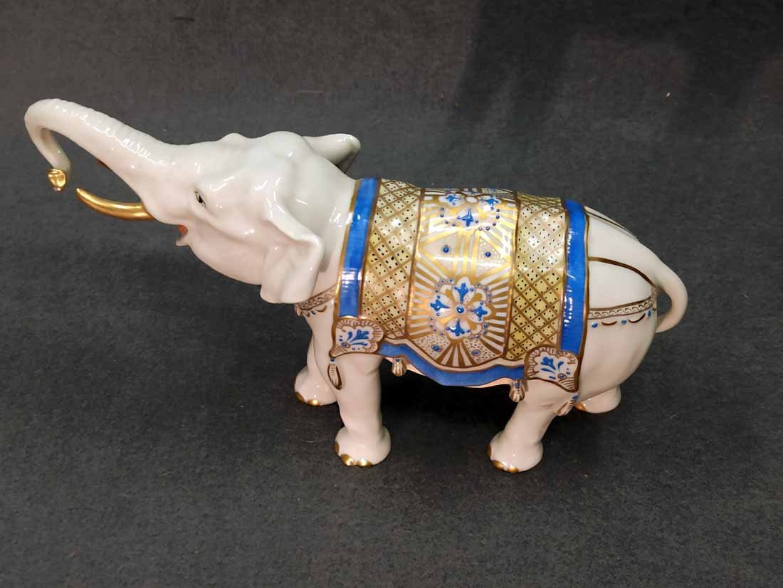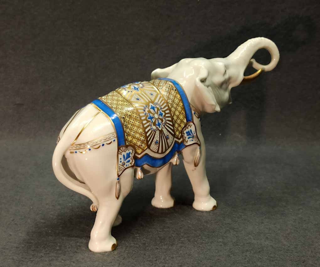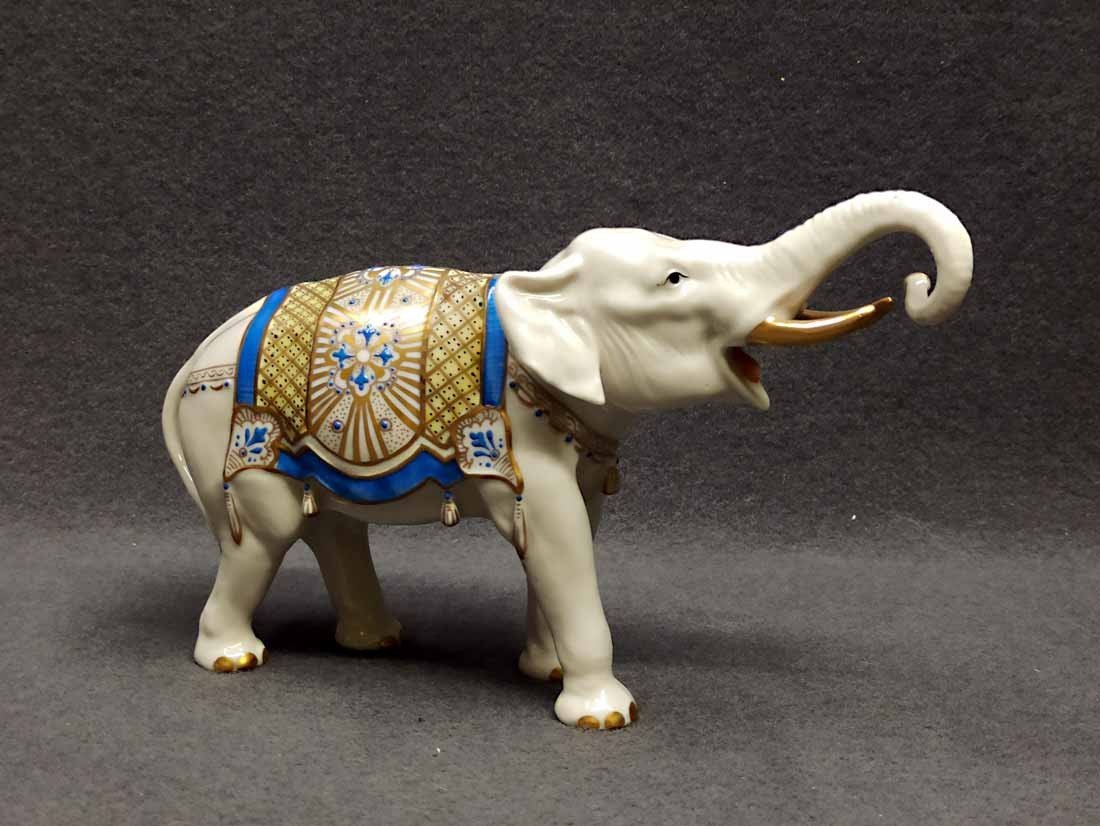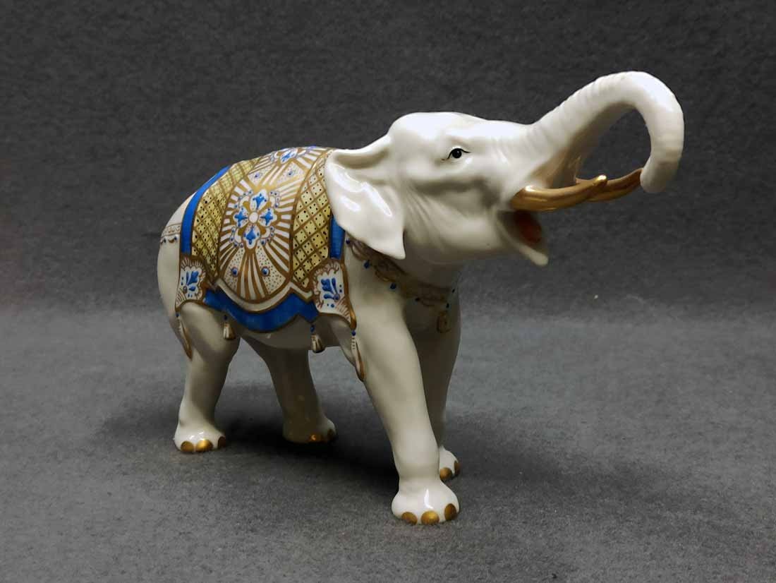 Elefant, Glückselefant, Rudolf Kämmer, Volkstedt. Schreitender asiatischer Elefant mit erhobenem Rüssel und reich verzierter Schabracke. Naturalistische Ausformung mit Goldstaffage und Emailbemalung. Sehr guter Zustand. Unterglasurblaue Stempelmarke der Manufaktur Rud. Kämmer, H 15 cm.