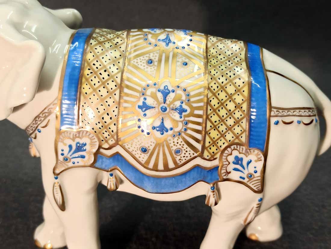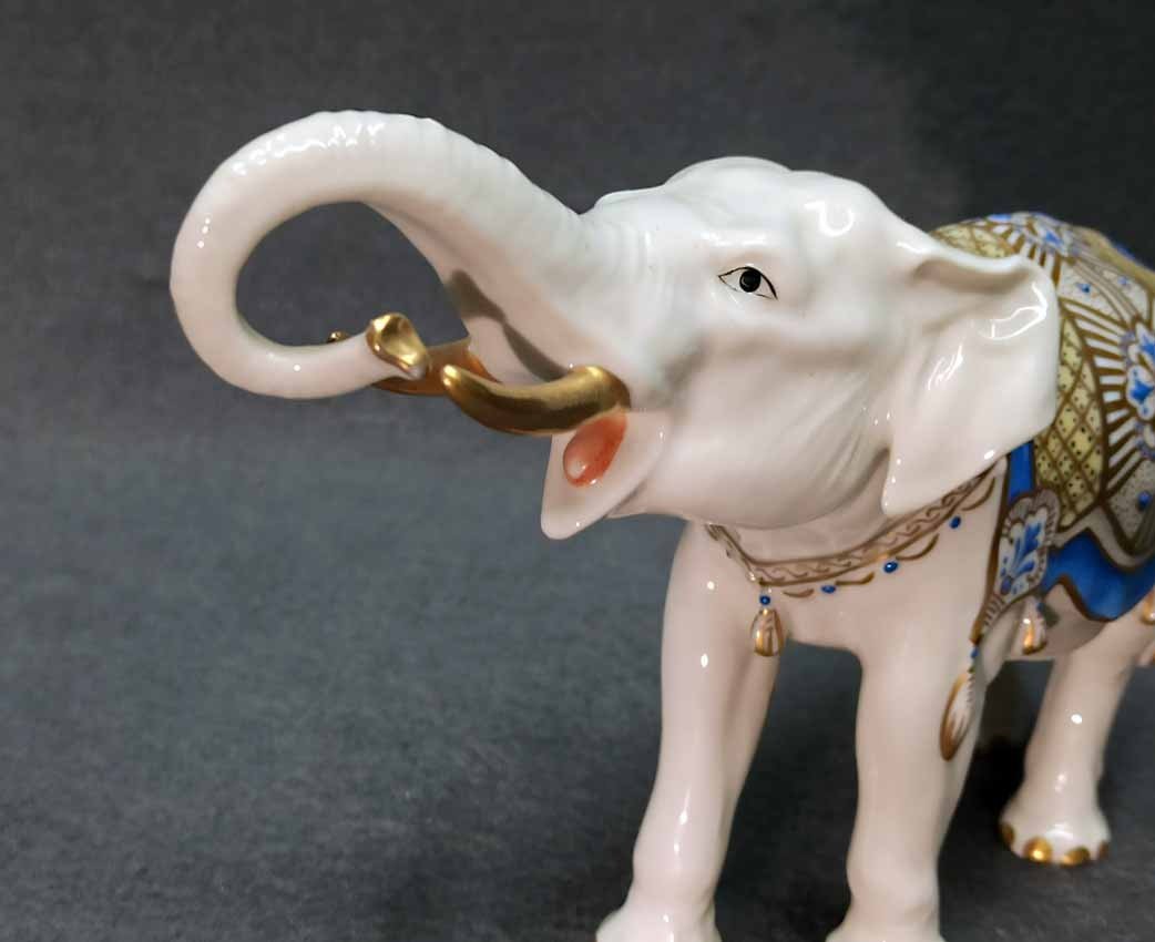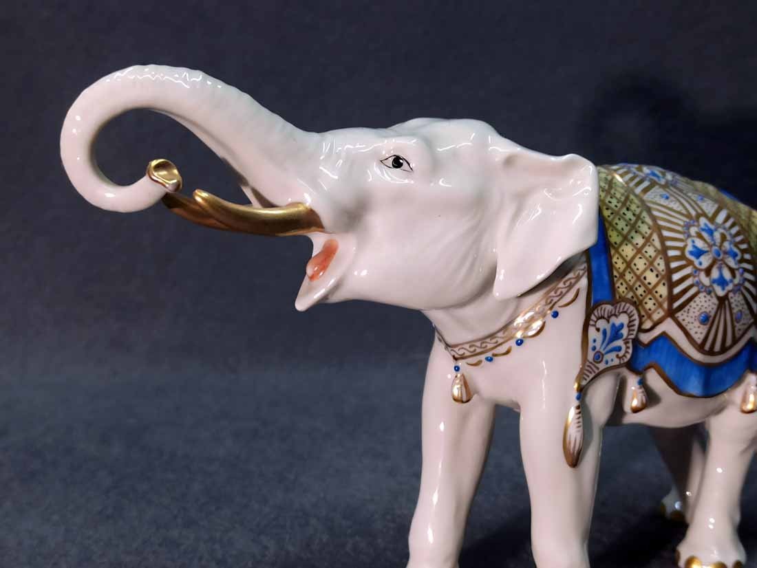 Elefant, Glückselefant, Rudolf Kämmer, Volkstedt. Schreitender asiatischer Elefant mit erhobenem Rüssel und reich verzierter Schabracke. Naturalistische Ausformung mit Goldstaffage und Emailbemalung. Sehr guter Zustand. Unterglasurblaue Stempelmarke der Manufaktur Rud. Kämmer, H 15 cm.