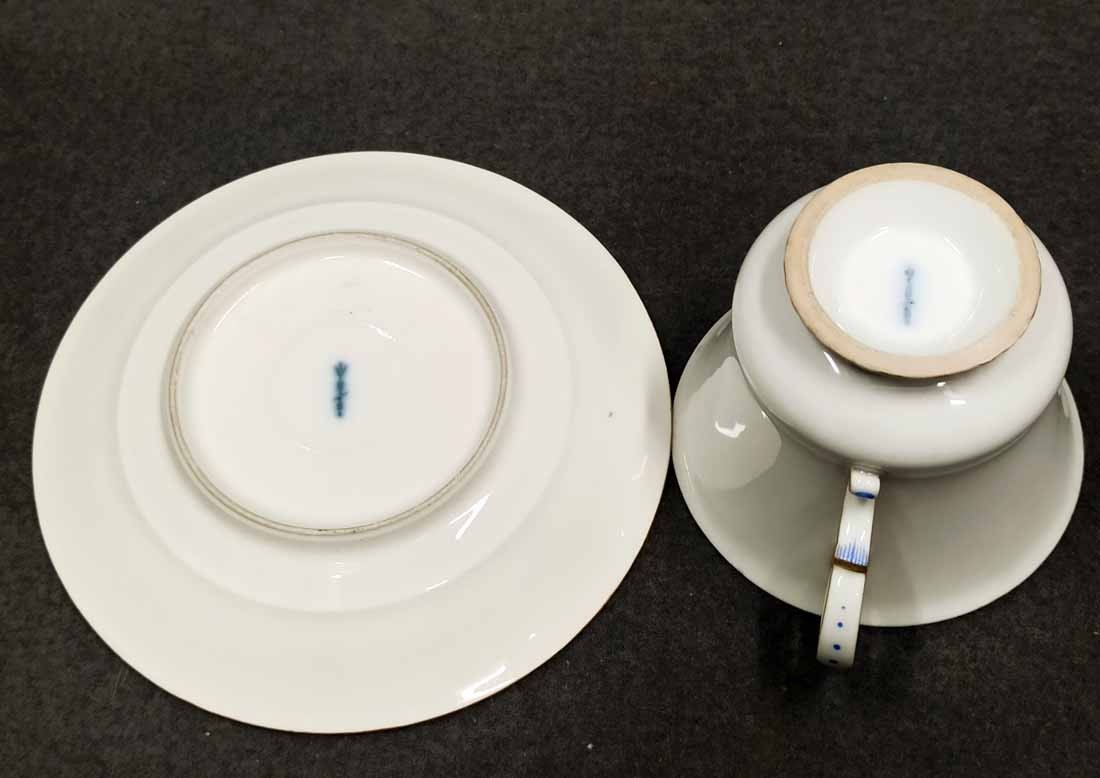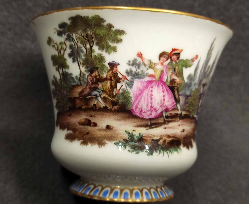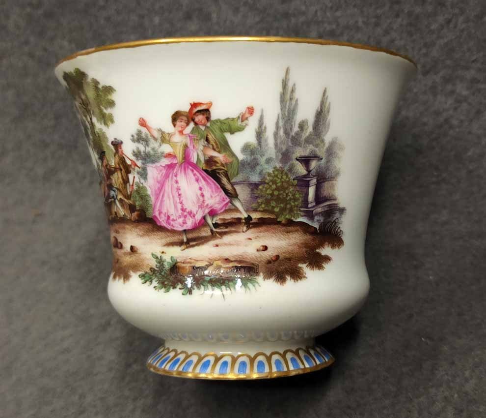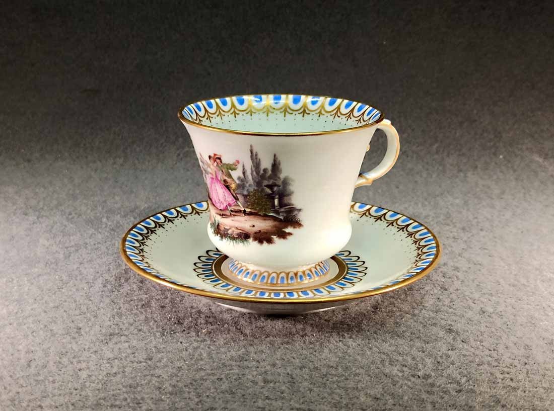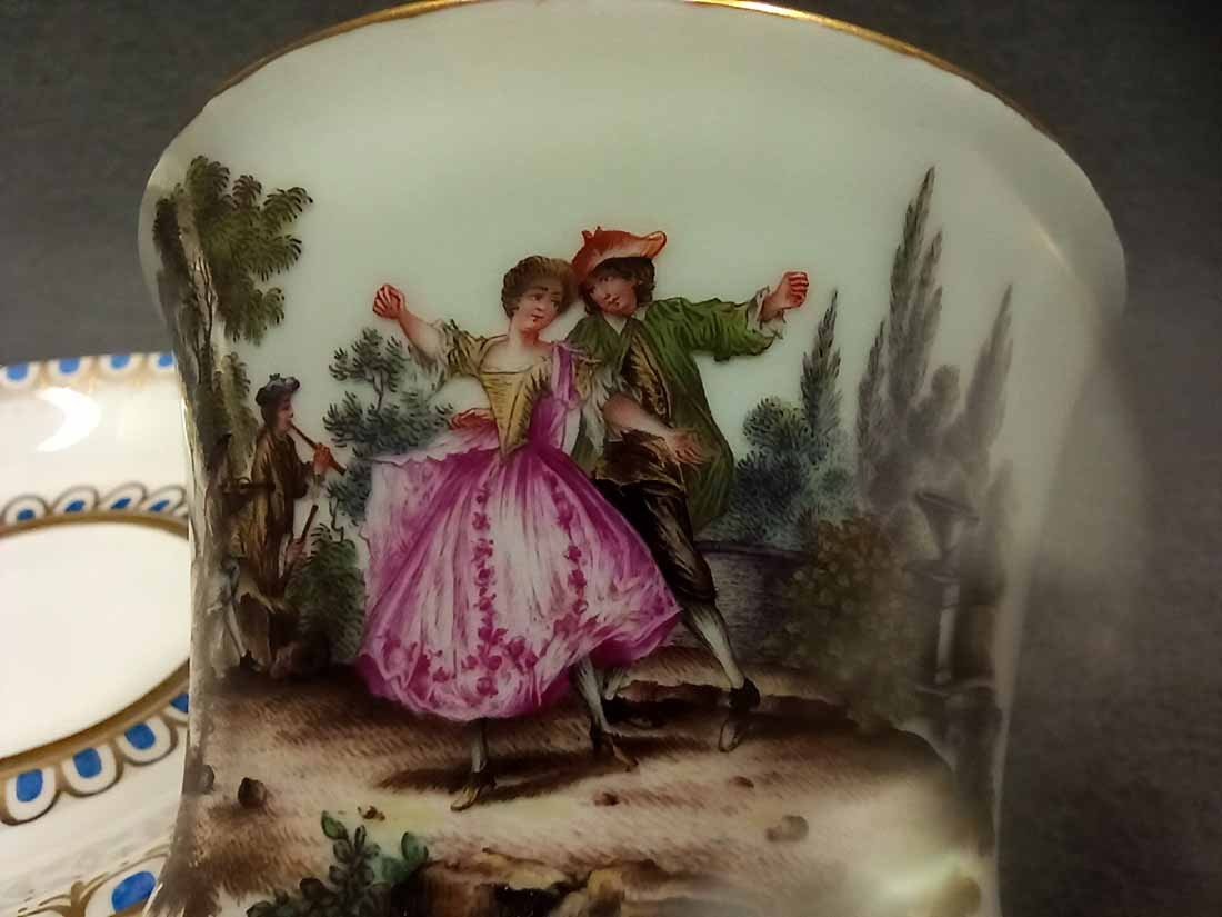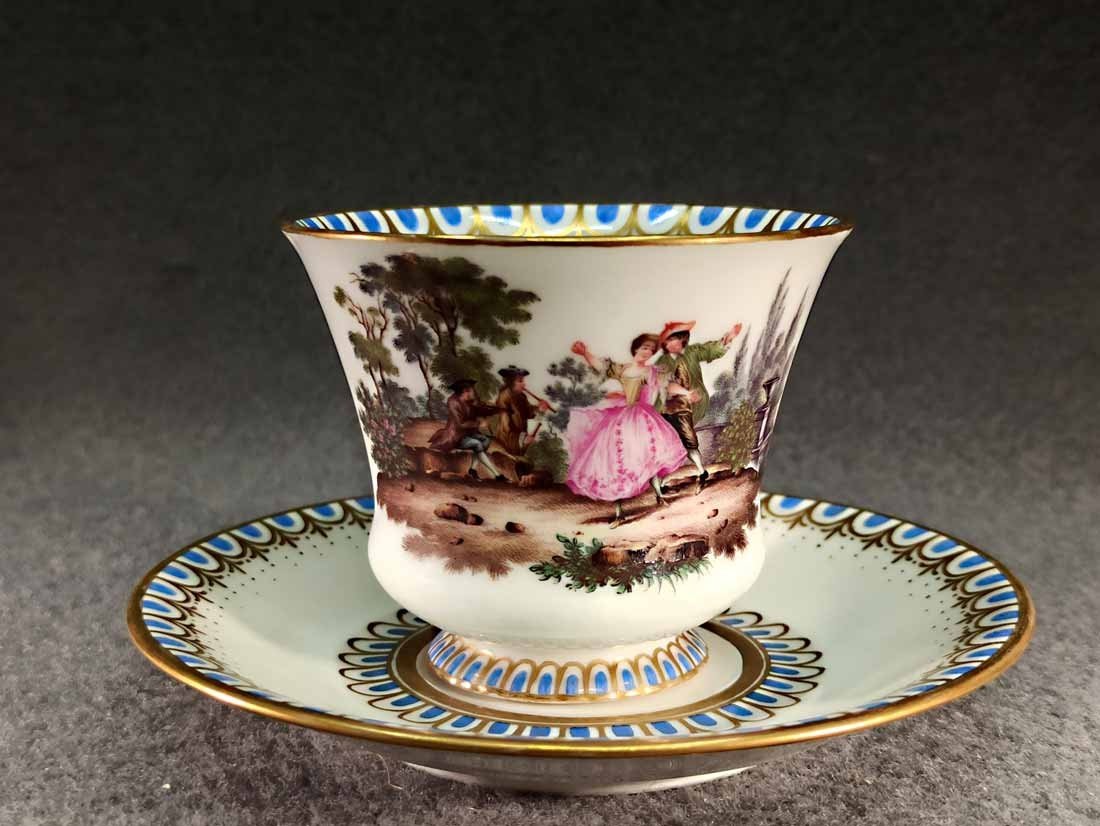 KPM Berlin. Bildertasse mit Galanter Szene. Vier Personen, ein Kavalier mit Dame und zwei Musiker, in detailreicher gemalter Landschaft. Tasse und Untertasse mit weiterem Dekor in Blau und Gold. Sehr guter Zustand ohne Beschädigungen. Malerei tadellos erhalten. Alte Zeptermarke der Königlichen Porzellanmanufaktur Berlin Tasse H. 7 cm, D. 8,5 cm, Untertasse D. 14 cm, H. 2 cm.