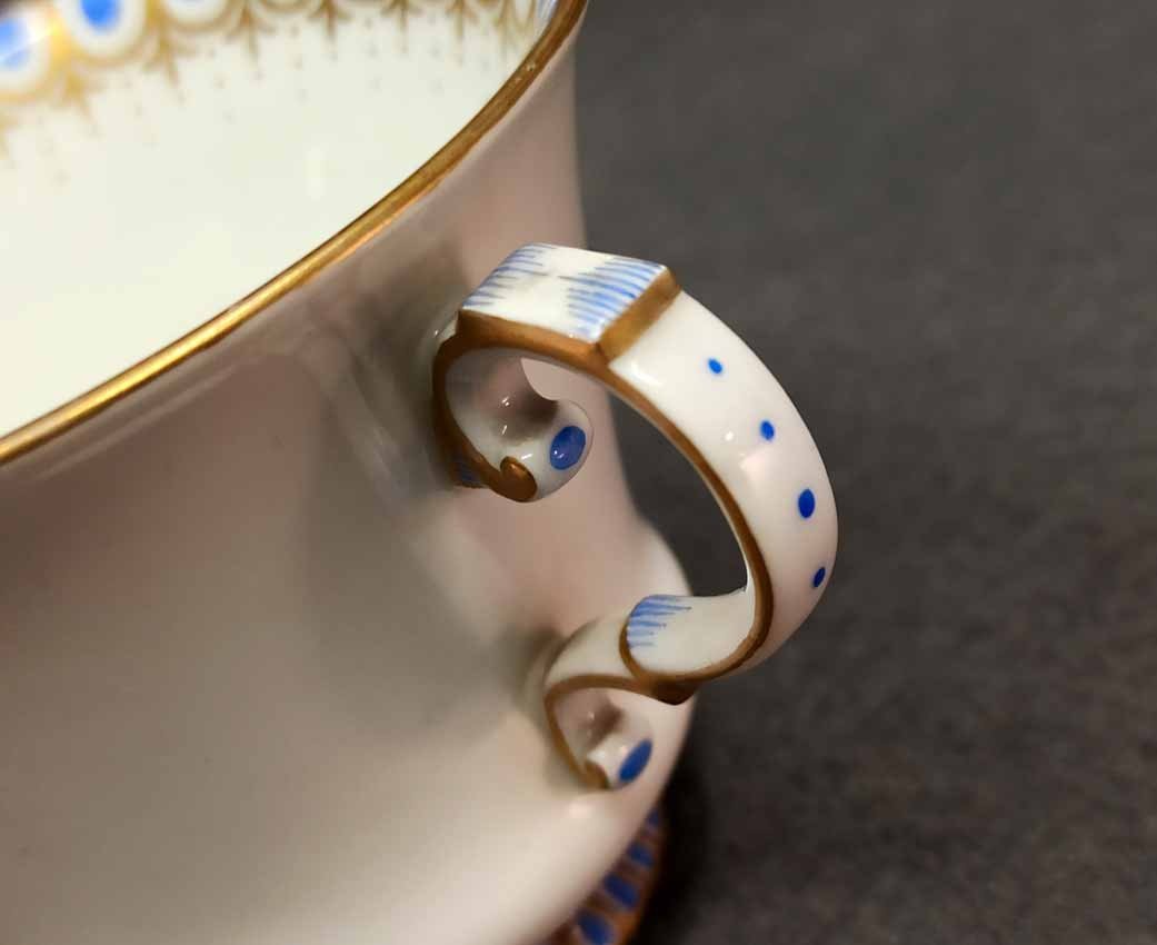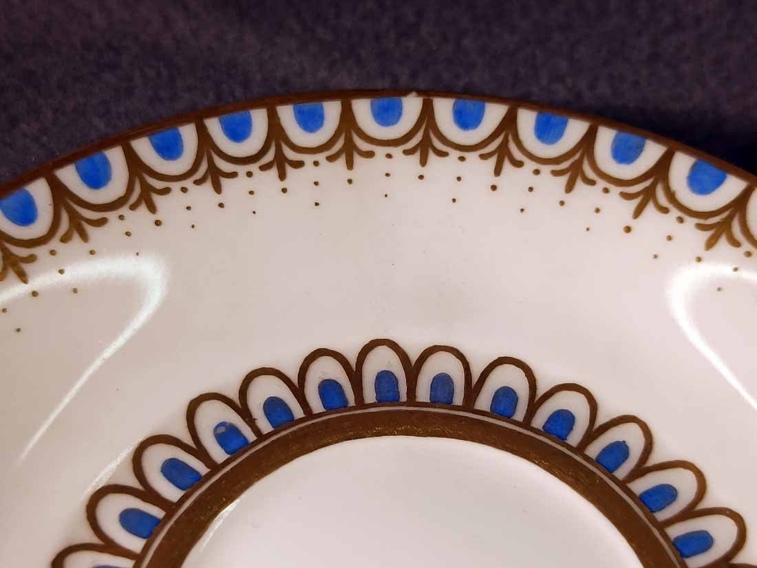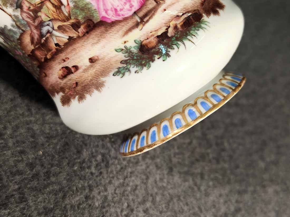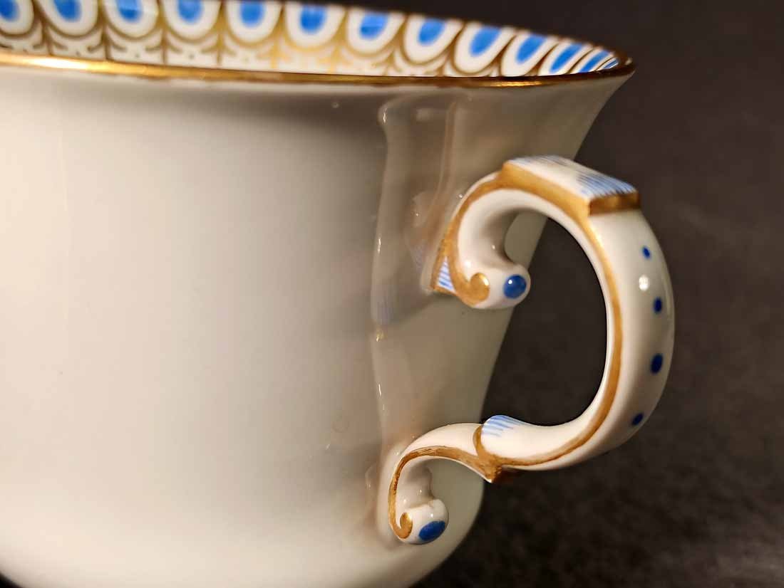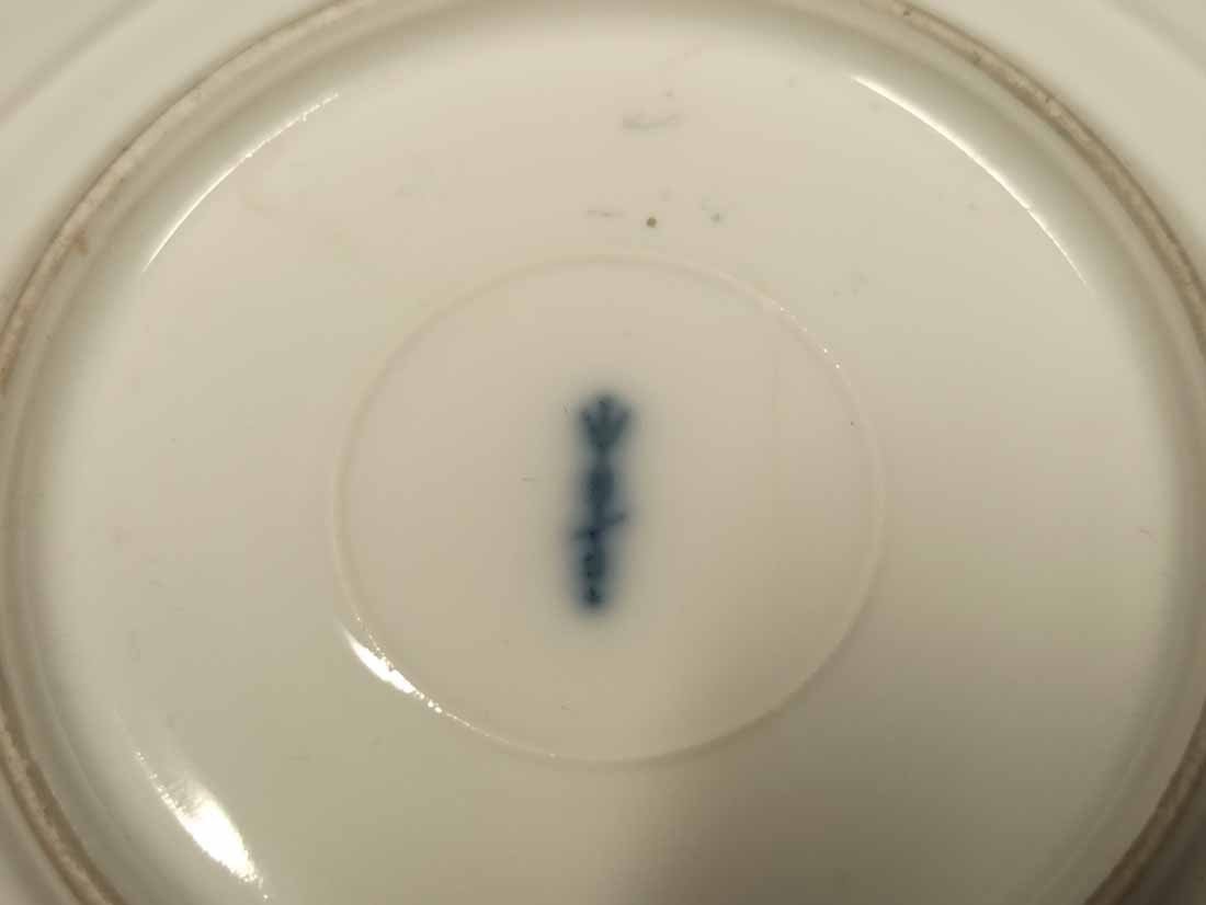 KPM Berlin. Bildertasse mit Galanter Szene. Vier Personen, ein Kavalier mit Dame und zwei Musiker, in detailreicher gemalter Landschaft. Tasse und Untertasse mit weiterem Dekor in Blau und Gold. Sehr guter Zustand ohne Beschädigungen. Malerei tadellos erhalten. Alte Zeptermarke der Königlichen Porzellanmanufaktur Berlin Tasse H. 7 cm, D. 8,5 cm, Untertasse D. 14 cm, H. 2 cm.