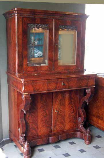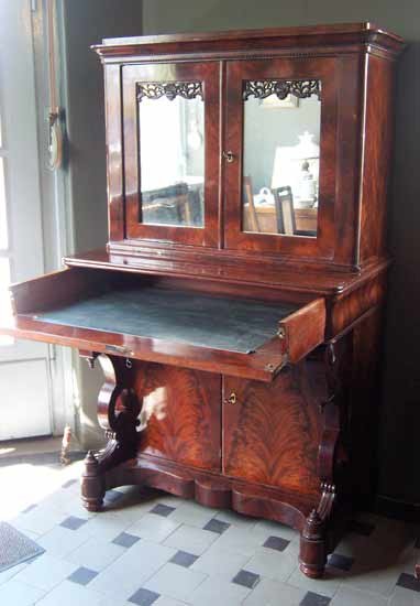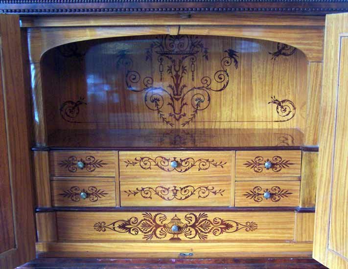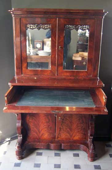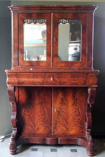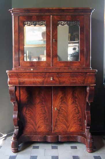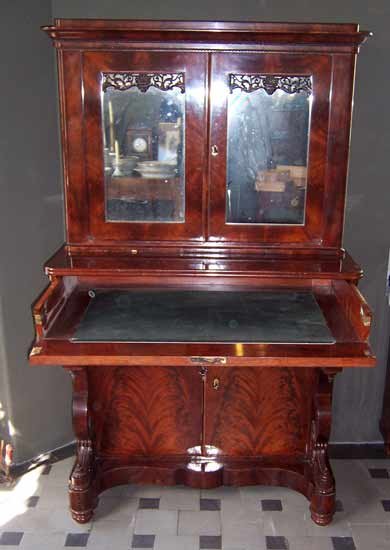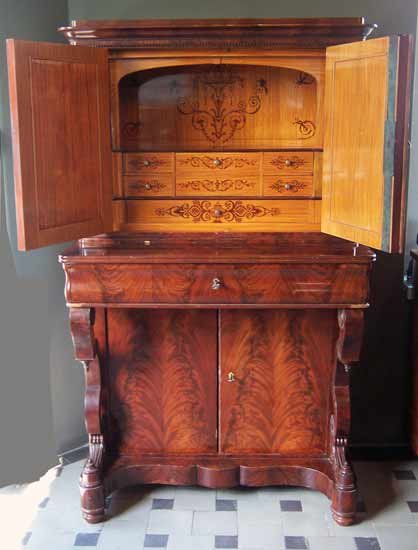Zweitüriges Unterteil mit hervorkargendem Schreibfach, seitliche Stützen in geschwungenen Bögen. Schreibteil in Ausführung eines Schubfaches mit abklappbarer Front. Zweitüriges verspiegeltes Oberteil mit dahinterliegender Schubkasteneinteilung in Kirsche furniert und reich intarsiert.