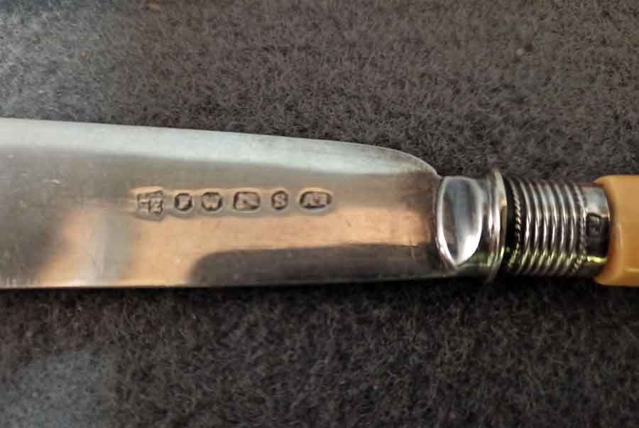 4-tlg. je 2 Messer und Gabeln. Gestempelt, verschiedene Stempel an den Heftfassungen und Messerklingen rs.  Stempel ungedeutet. Silber geprüft.
