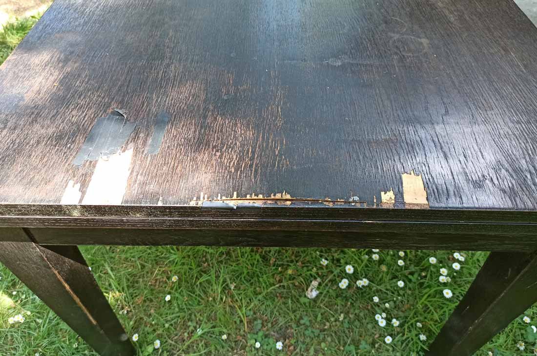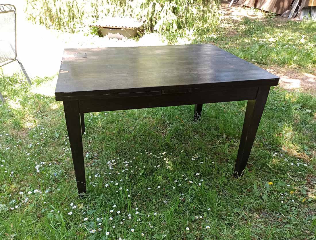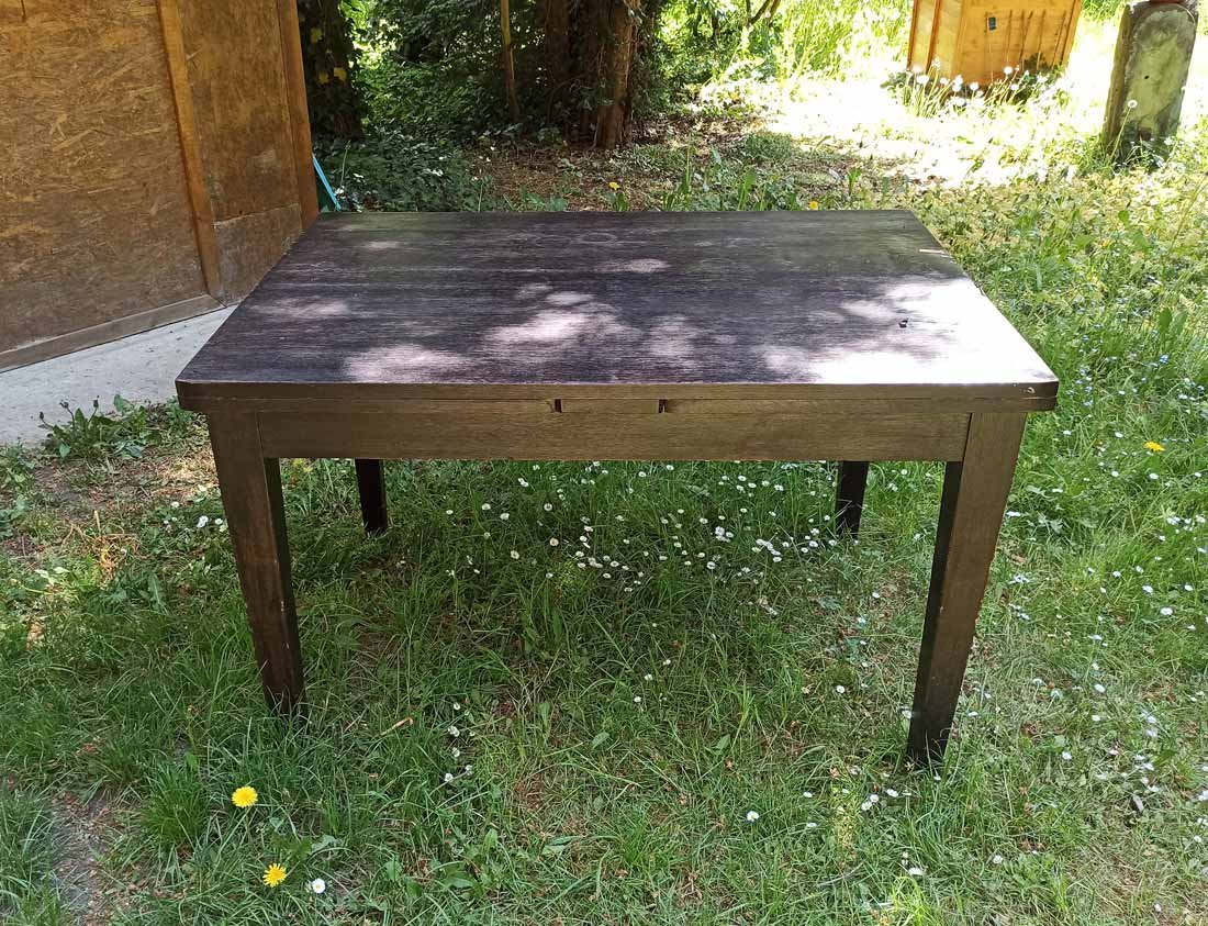 Tisch um 1920, Ausziehtisch mit etwas reperaturbedürftiger Platte. H. 78 cm, B. 124 cm, ausgezogen 232 cm, T. 94 cm.