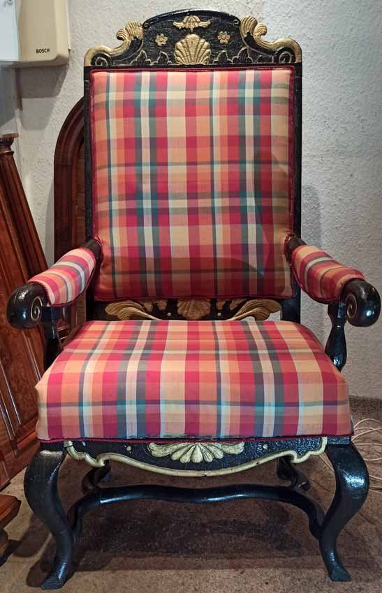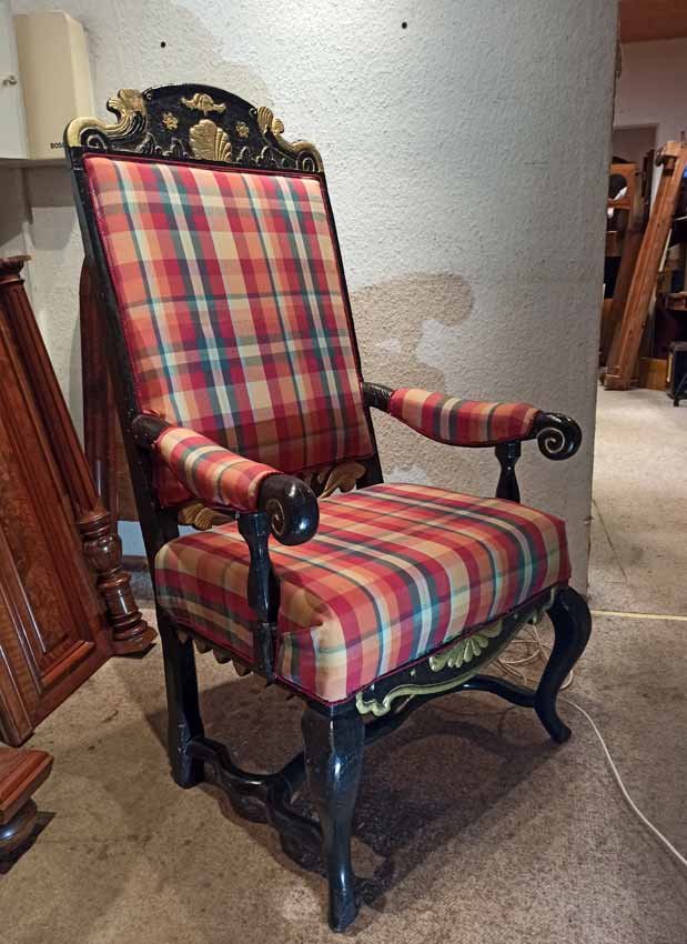 Armlehnstuhl um 1730, Barock. Vermutl. Ostsachsen. Restaurierungsbedürftig, Oberfläche stark übergangen, kleinere Holzfehlteile, Polsterung... siehe Foto. H. 128/50 cm, B. 70 cm. T. 50 cm.