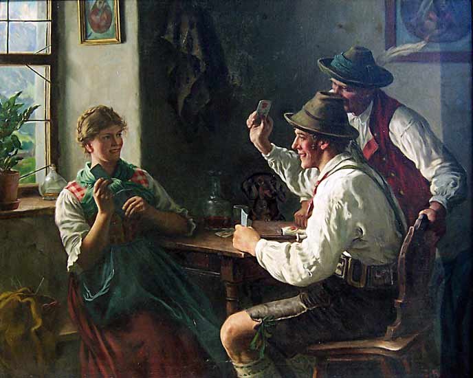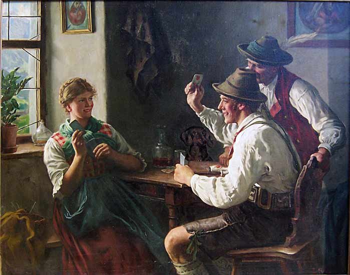 Interieur einer bäuerlichen Stube mit Blick durchs Fenster in die Berge. Ein junger Bursche und ein Mädel beim Kartenspiel. Ein Mann schaut interessiert zu. Sie schaut unsicher, er spielt sein Herz Ass aus. Selbst der Dackel schaut gespannt.