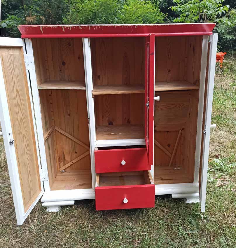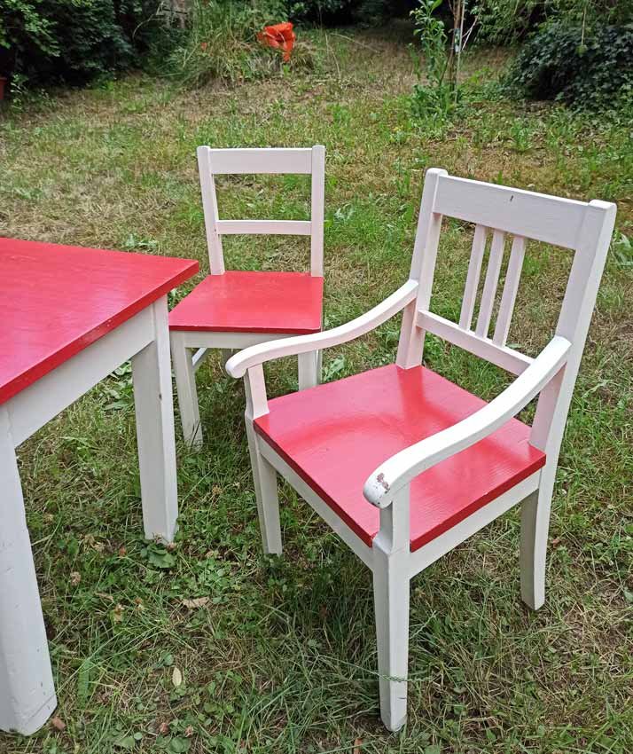 Lagerräumung, 4x Kindermöbel von 1910; Schrank, Tisch, Stuhl und Armlehnstuhl. Guter Zustand siehe Fotos. Schrank H. 95 cm, B. 85 cm, T. 33 cm. Auch einzeln abzugeben.