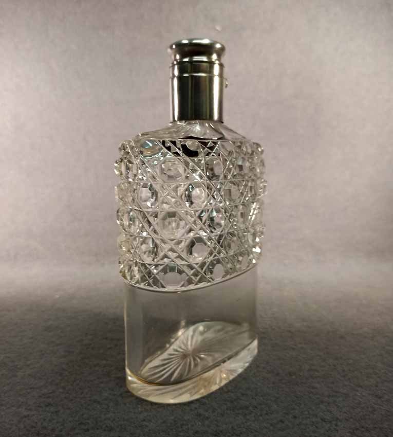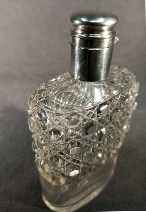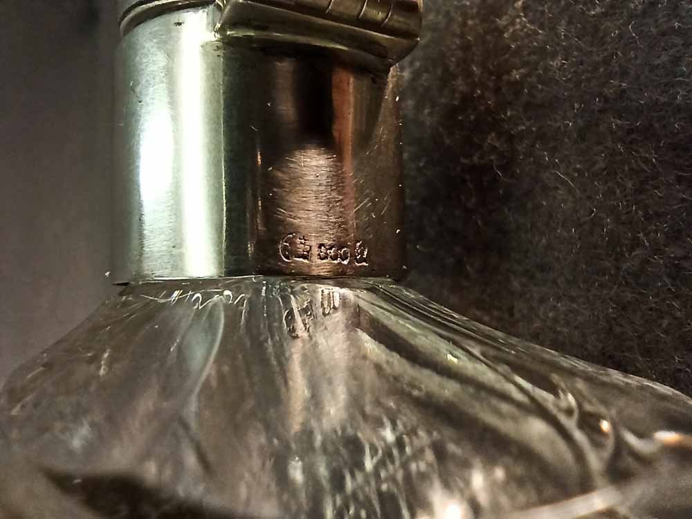 Spirituosenflasche, Glas-Flakon gesteinelt mit Silberdeckel, 800 Silber. Scharnierter Deckel, drehbar.