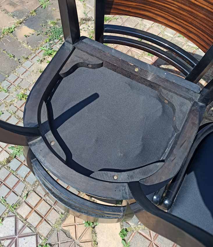 4x Stühle ca 1925, Art Deco, Frankreich. Schwarze Stühle die Rückenlehne Palisander furniert. VGuter Zustand, sofort nutzbar, die Polster i.O. und straff und sauber, normale Nutzungs- und Gebrauchsspuren. H. 49/80 cm, B. 47 cm