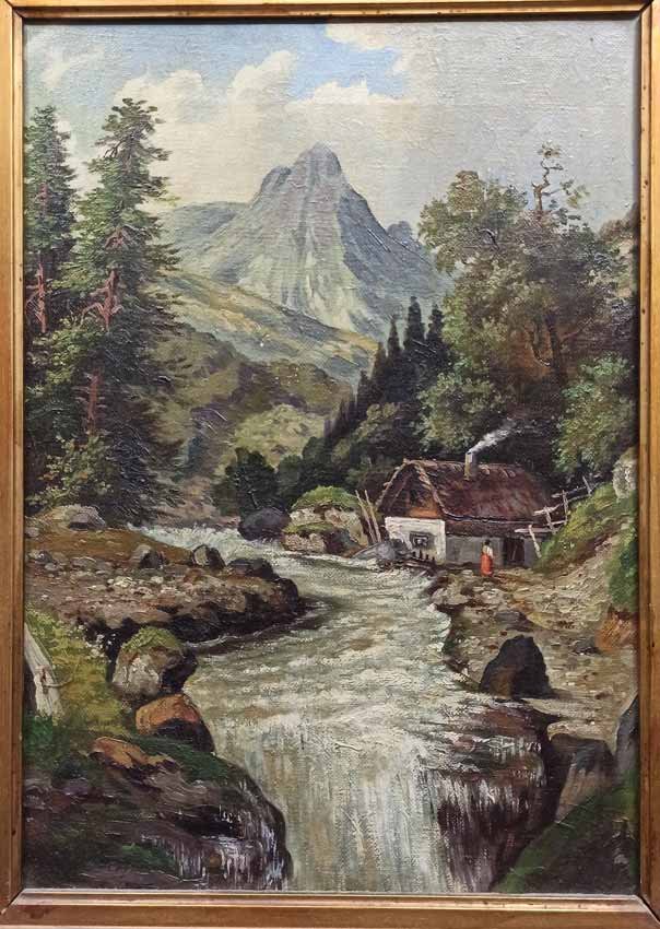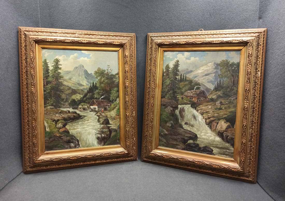 Heyn, Heinrich Eduard, 1856 - 1932. Gebirgslandschaften, Öl a. Lwd. a. Keilrahmen, 2.Hälfte 19.Jh. Links unten undeutlich sign. "H.E. Heyn". H.xB. 63/45 cm x 50/32 cm. Rs. alter Klebezettel Bez.: " No. 143 / E.H.Heyn / Gebirgslandschaft" In zeittypischem original Rahmen, dieser mit kleineren Beschädigungen und Nutzungsspuren.