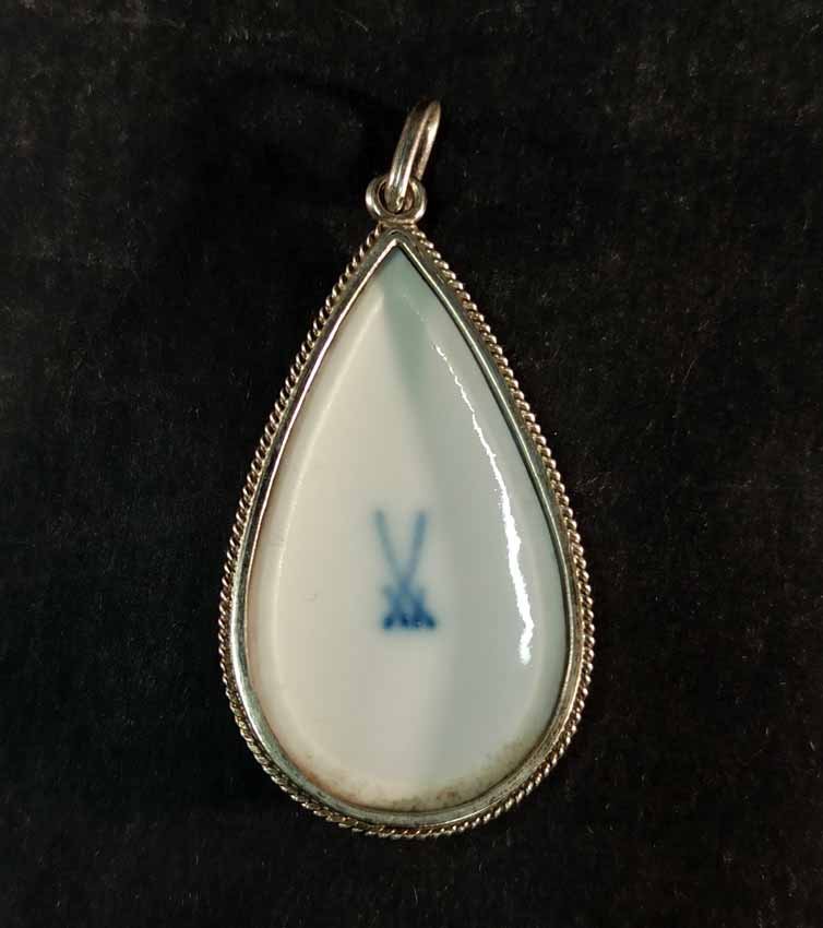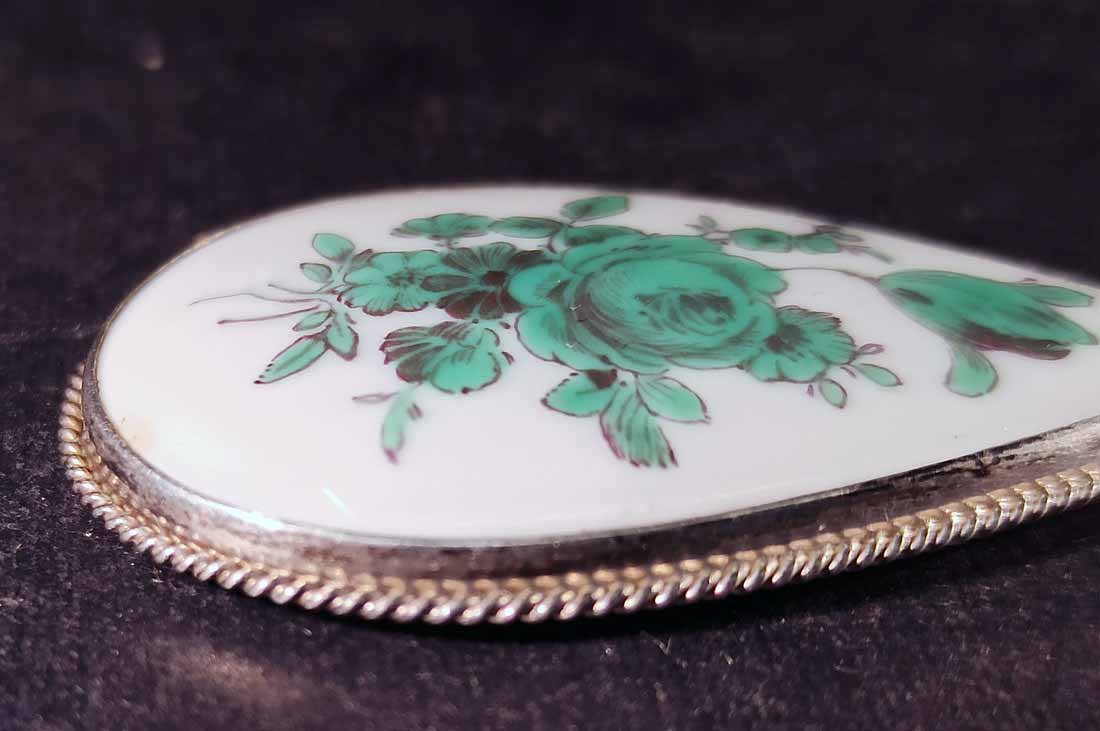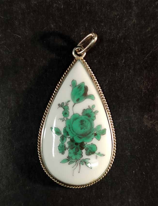 Meissen, Anhänger mit grüner Blumenmalerei in Silber Fassung, 900er Silber. Rs. Meissen Schwertermarke, 1.Wahl ohne Schleifstriche. Ca 5 cm x 2,5 cm