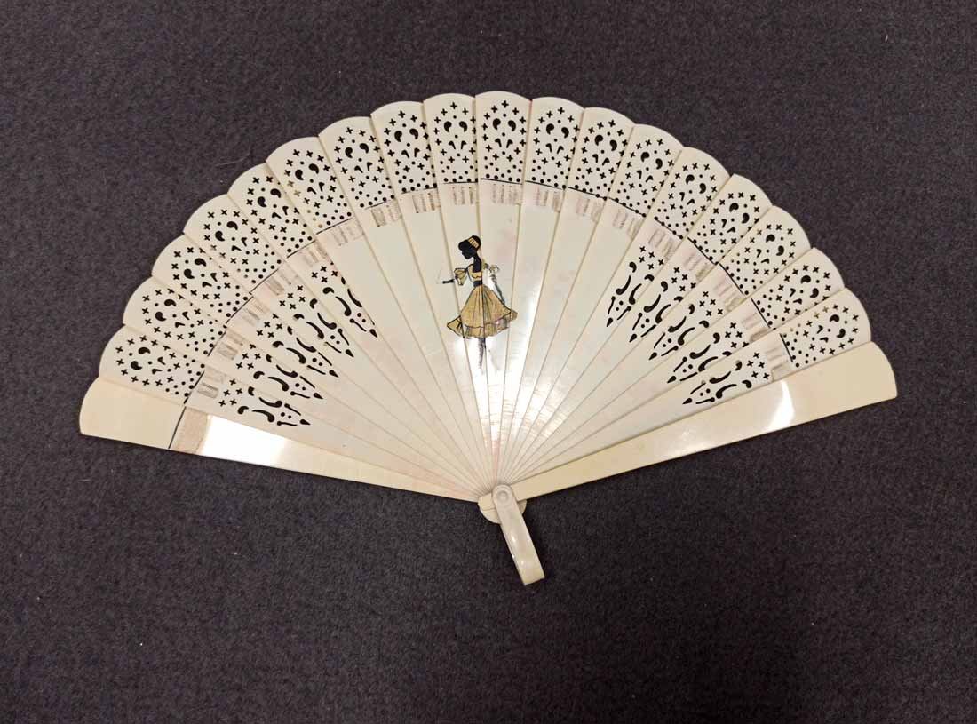 Fächer um 1900 aus Elfenbein-farbigen Zelluloid mit Darstellung und Verzierungen. H.14 cm, B. offen 25 cm.
