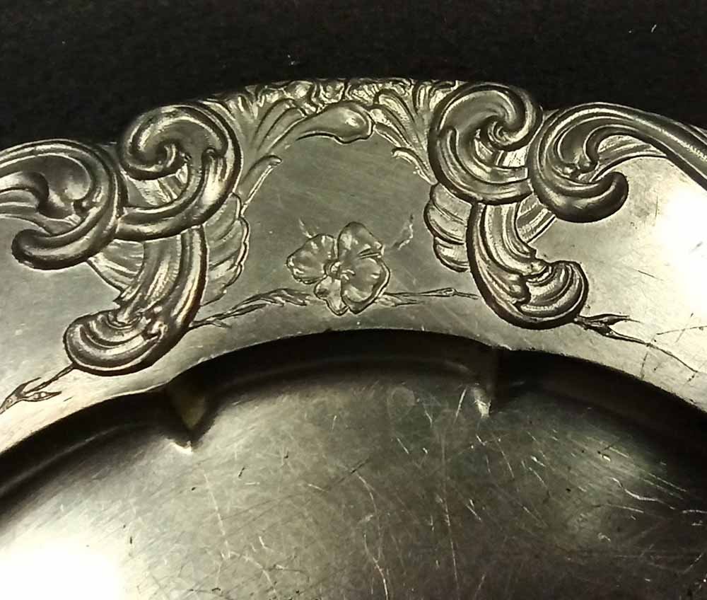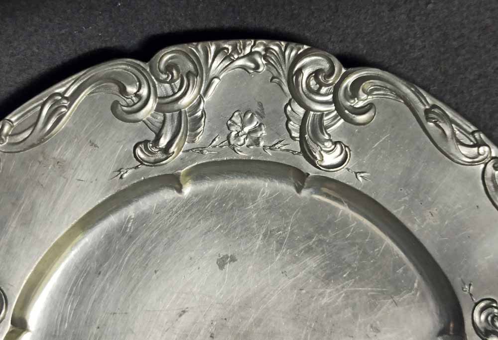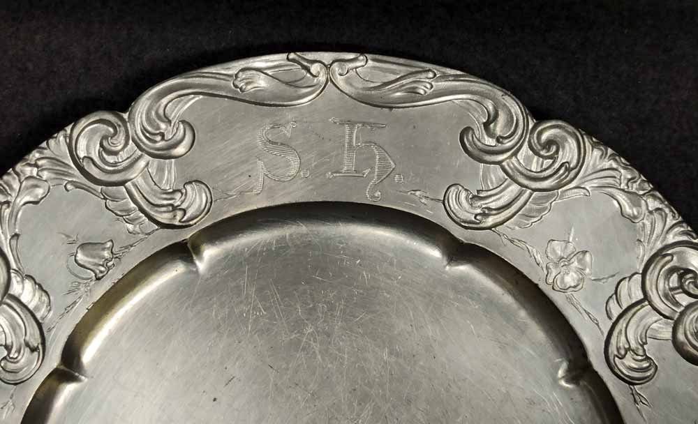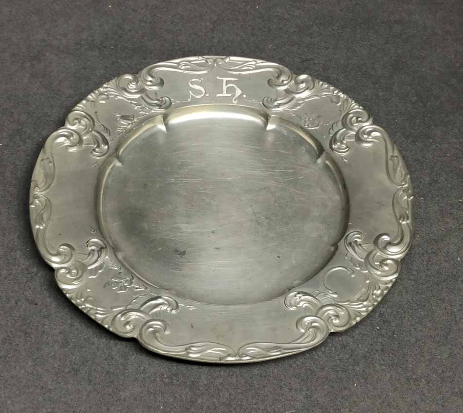 Kayserzinn, Teller um 1895, Jugendstil/Gründerzeit. Reliefdekor im Übergang von Gründerzeit zum Jugendstil. Auf der Fahne gemarkt mit Schriftzug "KAYSERZINN" geprägt. Guter Zustand mit geringen Altersspuren. Monogr. S. H. D. 24,5 cm, H. 2 cm.