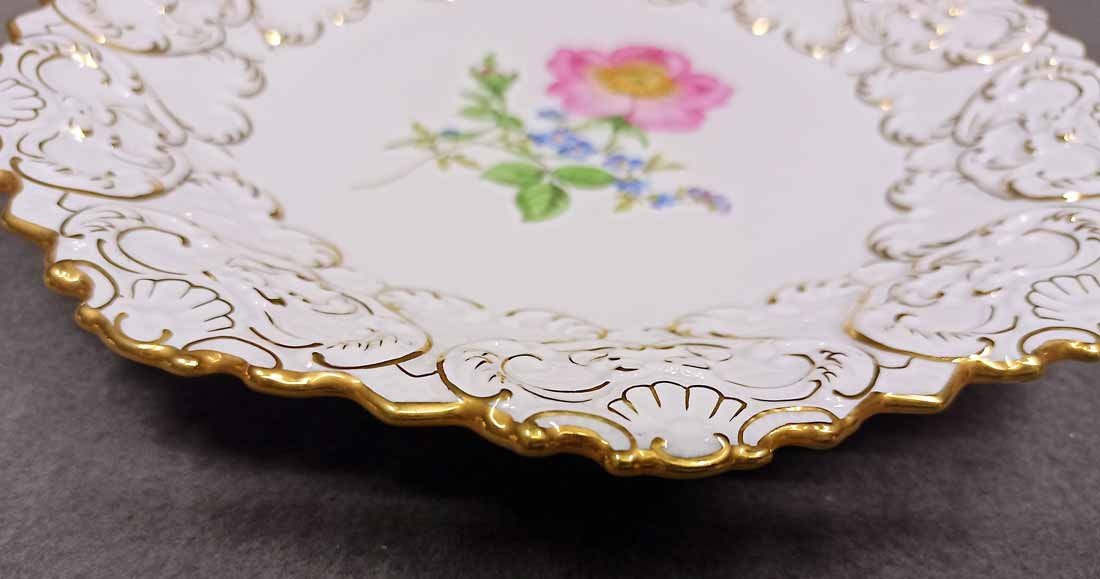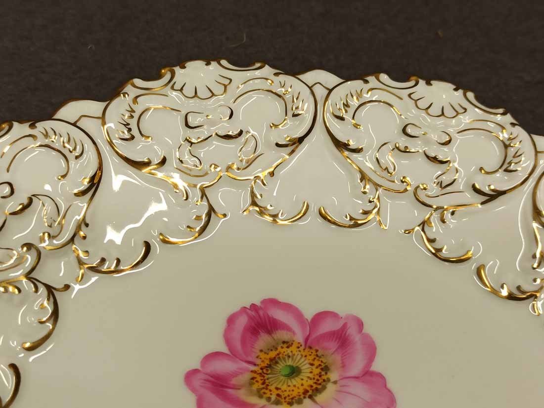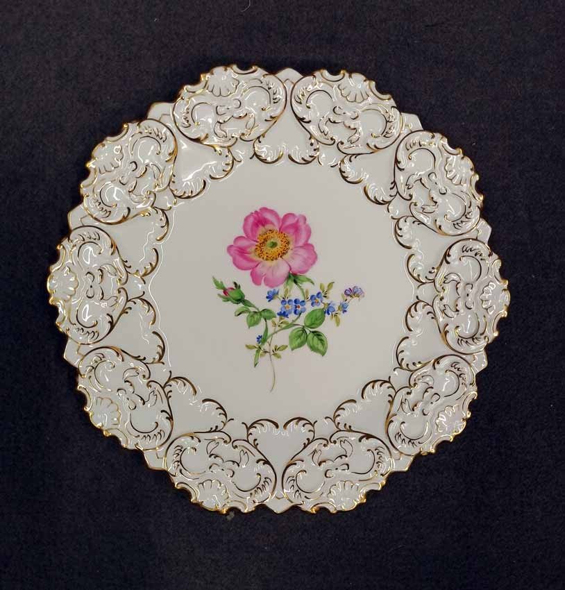 Reserviert! Meissen, Schale, Prunkteller mit Blumenmalerei, Reliefrand und Gold.