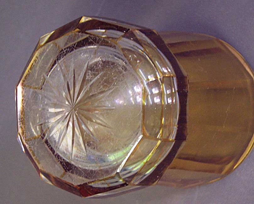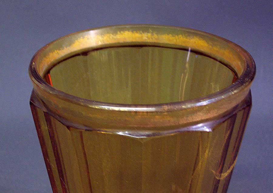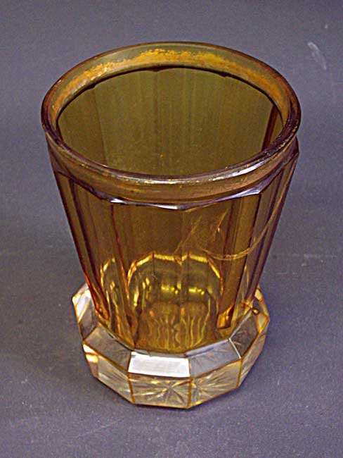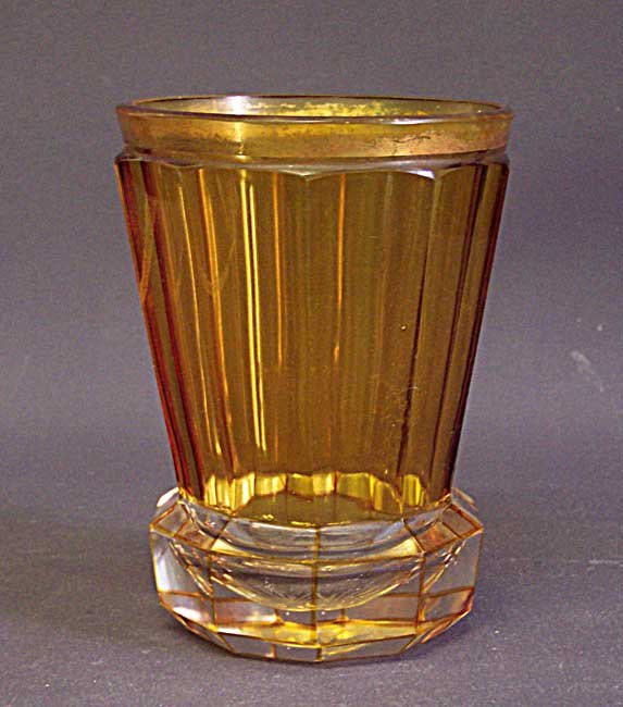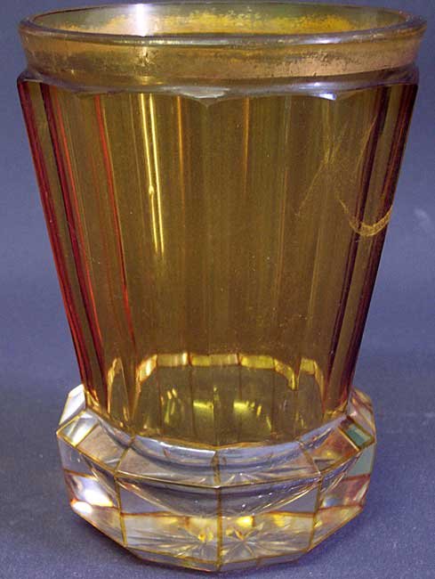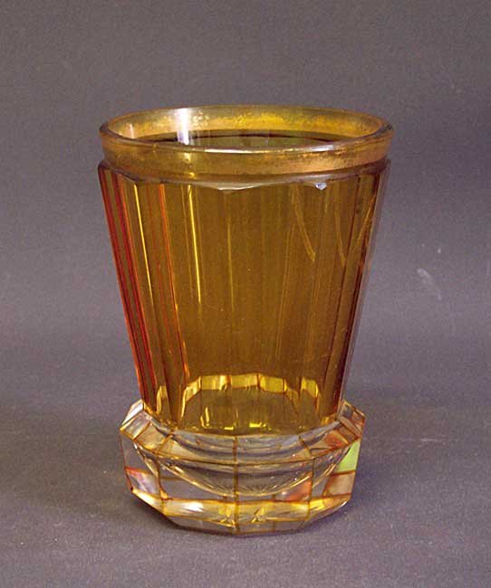 Großes Becherglas. Gelbe, mehrfach facettierte Wandung; farbloser, ausgestellter Fuß, an den Kanten gelb überfangen. Ehemals vergoldeter Rand, Goldabrieb.