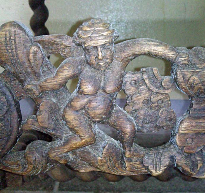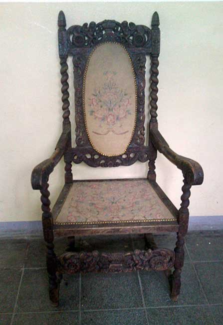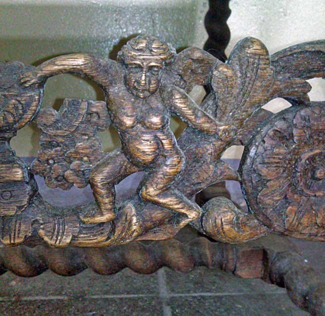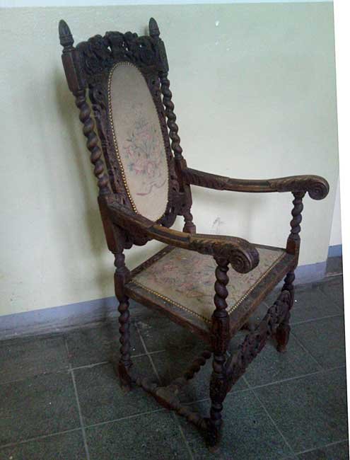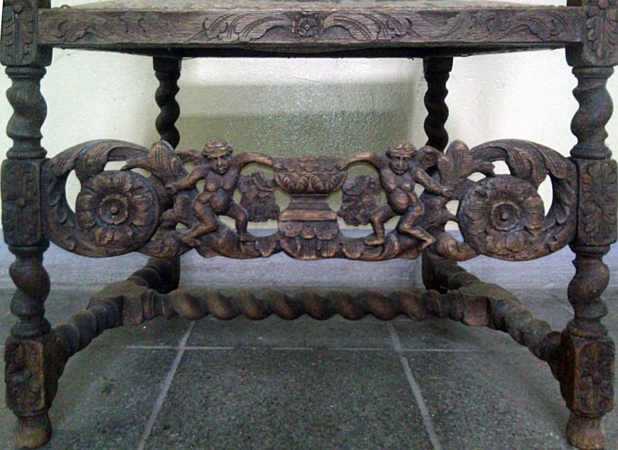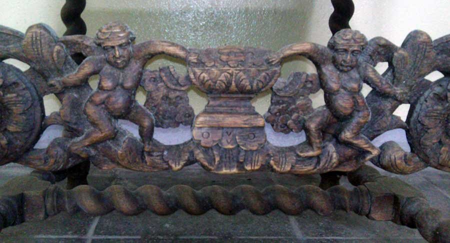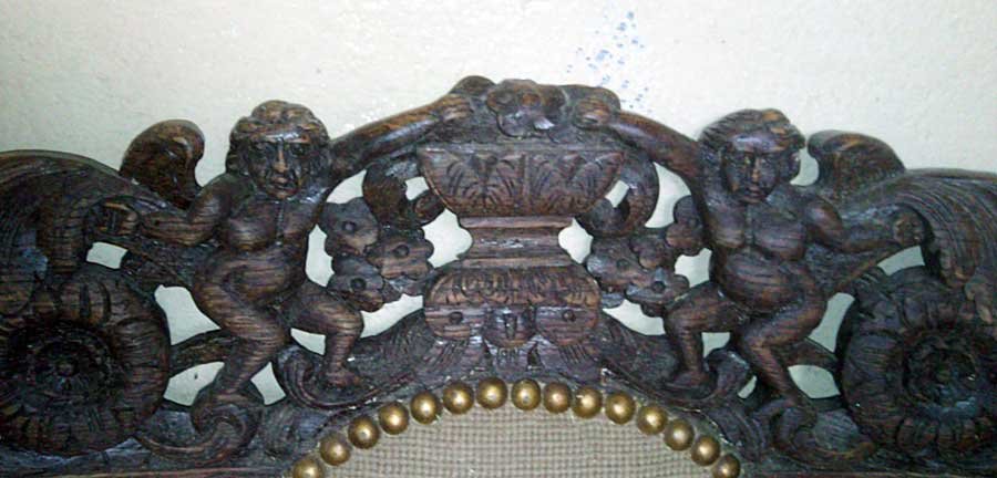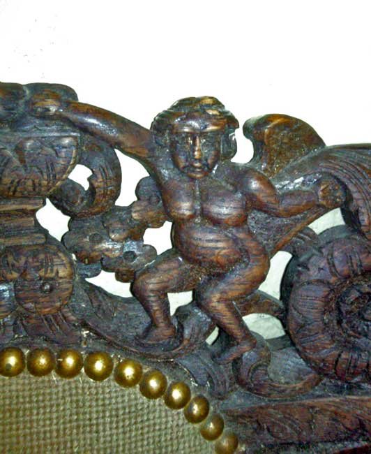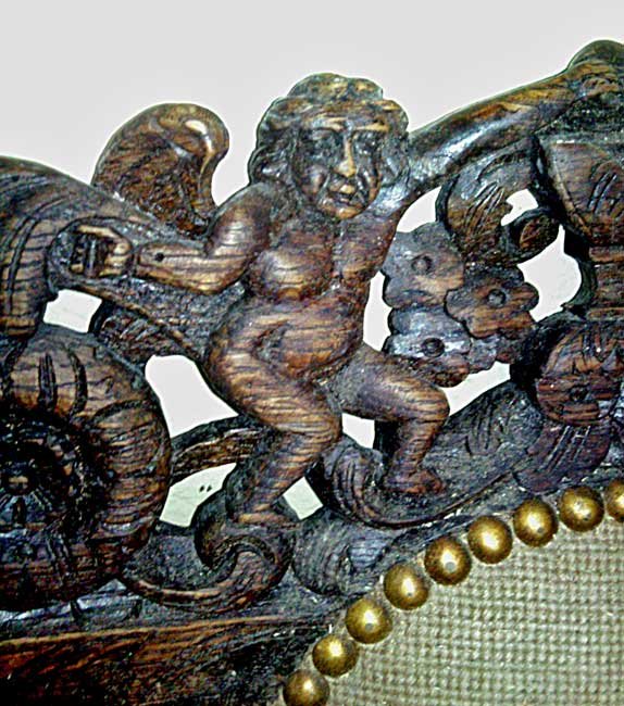 Geschnitztes Stuhlgestell mit gedrehten Füßen und Säulen, geschnitzte Fabelwesen. Restaurierungsbedürftig Seitensäulen der Rückenlehne gebrochen.