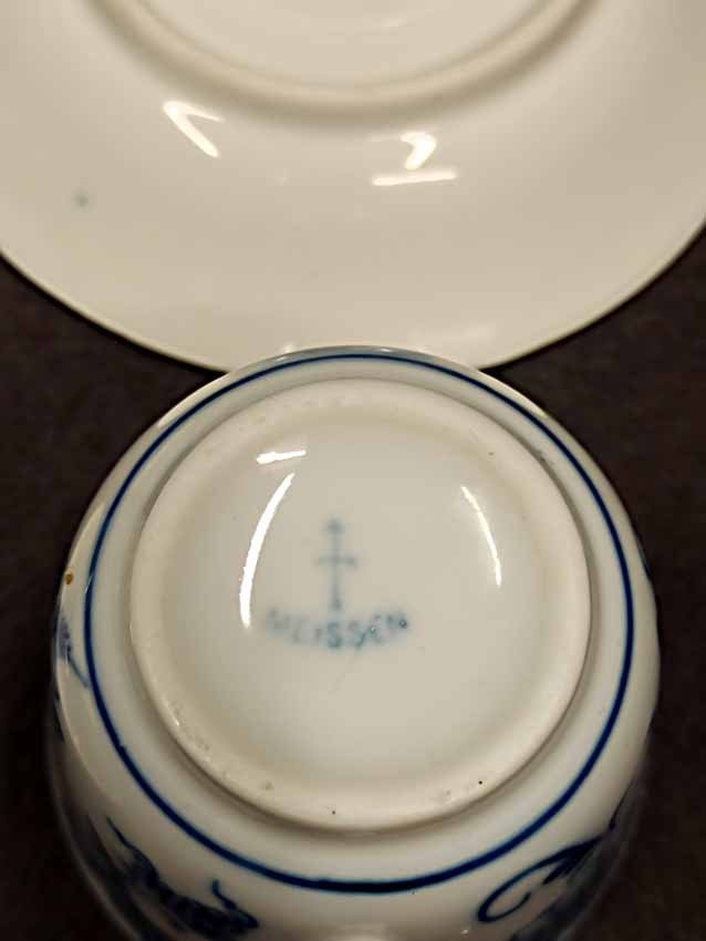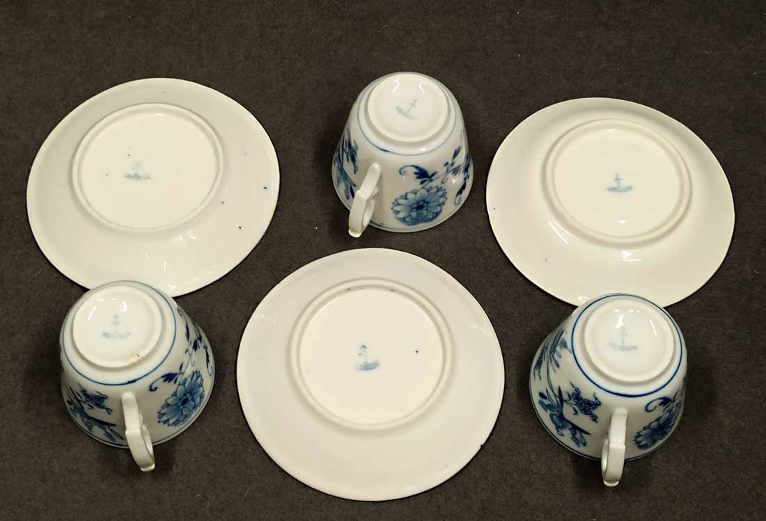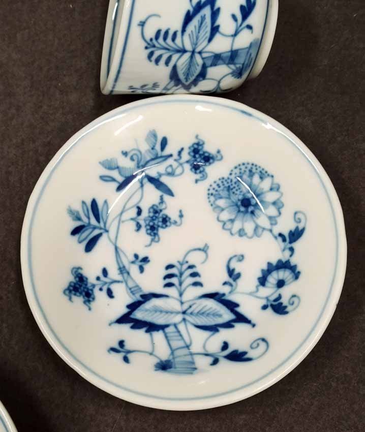Drei Tassen Zwiebelmuster, Fa. Manufaktur Teichert in Meissen um 1900. Guter Zustand ohne Beschädigungen. Herstellungsbedingte und Teichert-typische Glasurunregelmäßigkeiten.  Gemarkt mit der sogen "Ankermarke" : Pfeilkreuz mit gebogenem Schriftzug "Meissen" in Blau sowie der geprägte Stadtname "Meissen". Tasse H. 6,8 cm, D. 8 cm, Teller D. 14 cm.