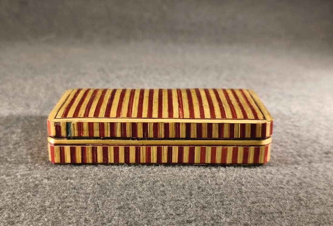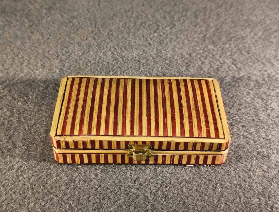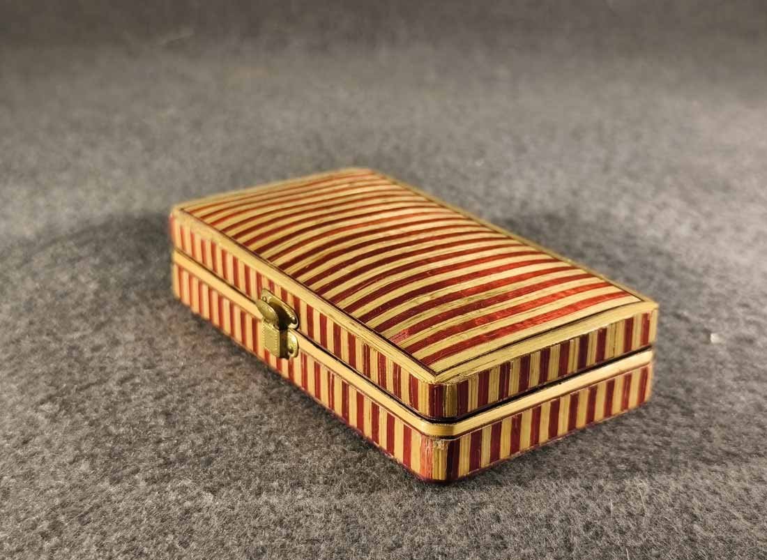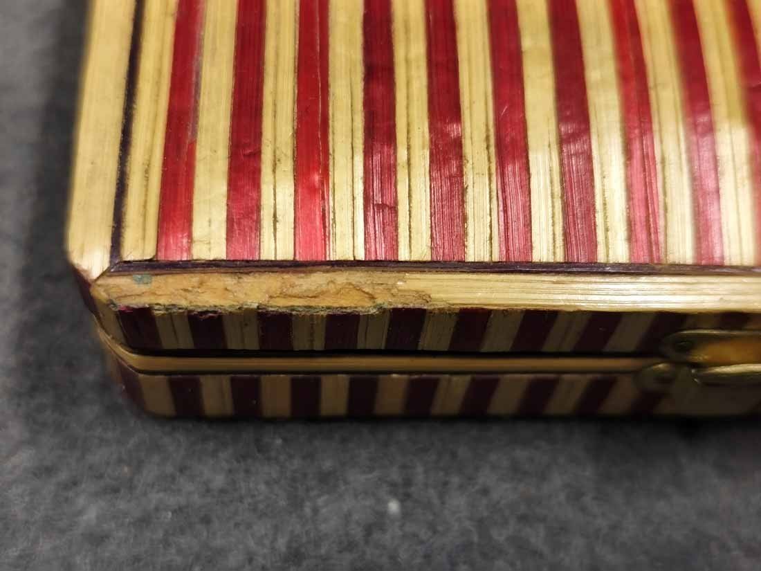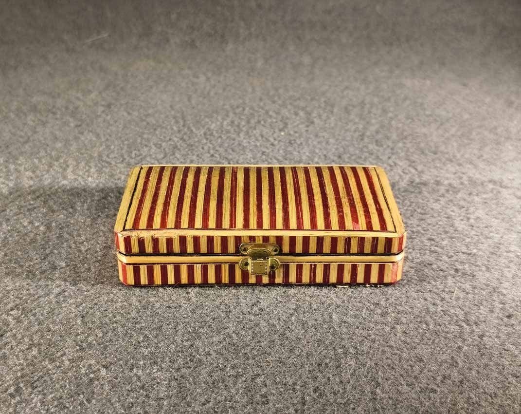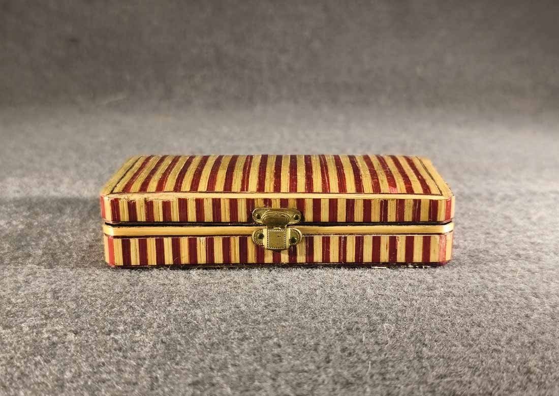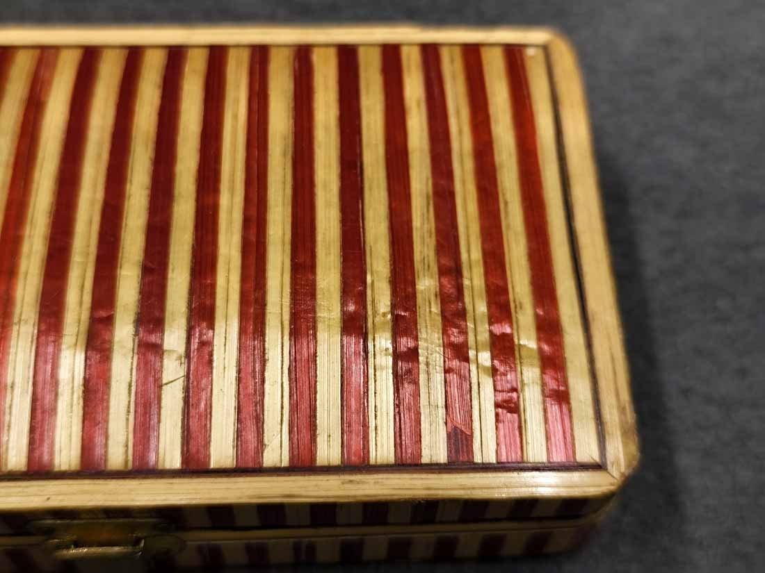 Kleines Etui für Nähutensilien (mit Inhalt) um 1840- 1880, Rot Beige gestreifte Bandintarsien aus Stroh (gefärbt). Ein wirklich schönes Kästchen, original ist es für Nähutensilien, es ist natürlich auch anderweitig nutzbar. Guter Zustand, geringe Gebrauchsspuren trotz des Alters. An der Deckelkante eine kleine Fehlstelle (Foto), recht unauffällig da im beigen Bereich. L. x B. 10,5 cm x 6 cm, H. 2,5 cm.