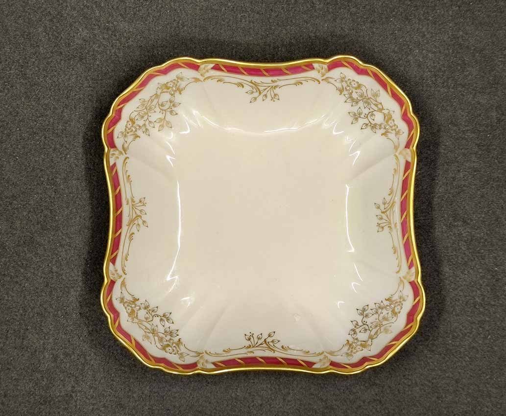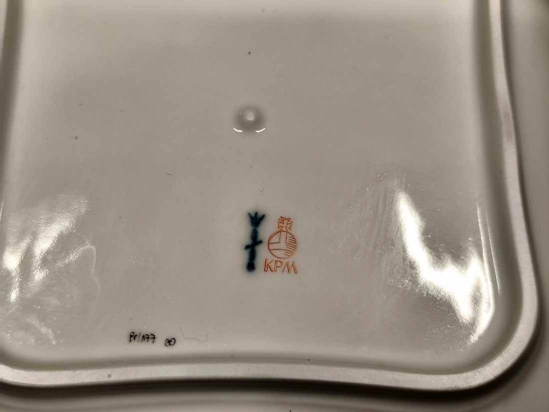 KPM Berlin, Viereck Schale, Schüssel L. x B. 21,5 cm. Königin von Holland, Rocaille Rot. Sehr guter Zustand ohne Beschädigungen oder Gebrauchsspuren. Kein Farb- oder Goldabrieb. Zeptermarke der KPM Berlin mit Reichsapfel rot. L. x B. 21,5 cm, H. 5 cm.