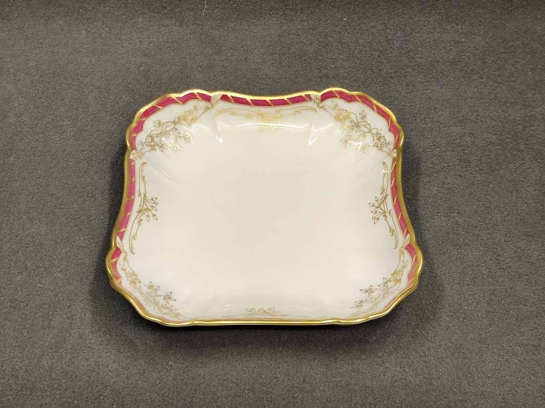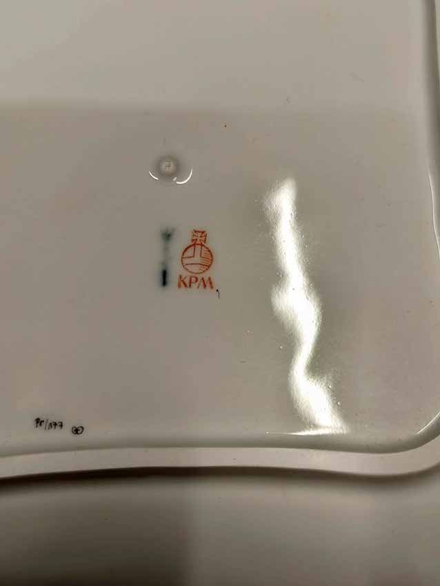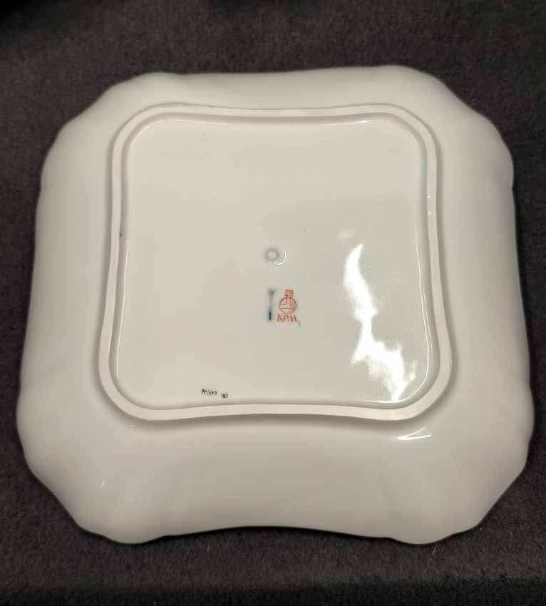 KPM Berlin, Viereck Schale, Schüssel L. x B. 22,5 cm. Königin von Holland, Rocaille Rot. Sehr guter Zustand ohne Beschädigungen oder Gebrauchsspuren. Kein Farb- oder Goldabrieb. Zeptermarke der KPM Berlin mit Reichsapfel rot. L. x B. 22,5 cm, H. 5 cm.