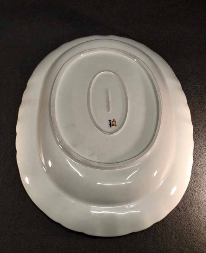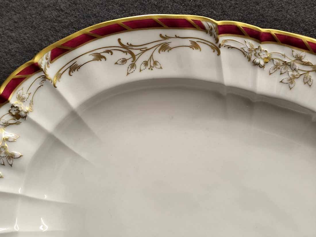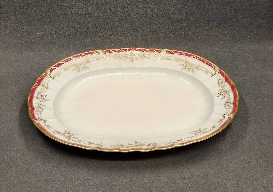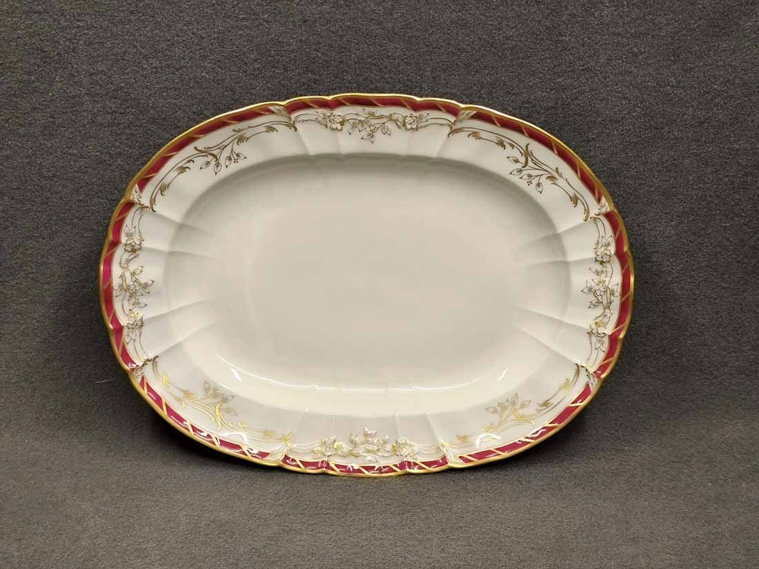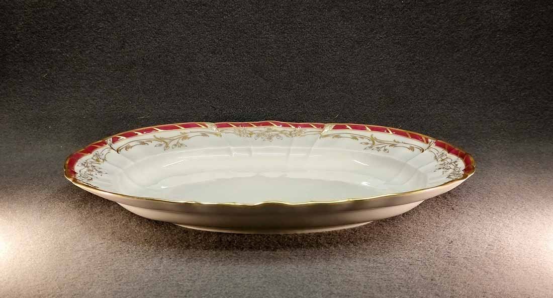 KPM Berlin, Große ovale Vorlegeplatte L. 42 cm. Königin von Holland, Rocaille Rot. Sehr guter Zustand ohne Beschädigungen oder Gebrauchsspuren. Kein Farb- oder Goldabrieb. Zeptermarke der KPM Berlin mit Reichsapfel rot. L. 42 cm, B. 30,5 cm, H. 5,5 cm.